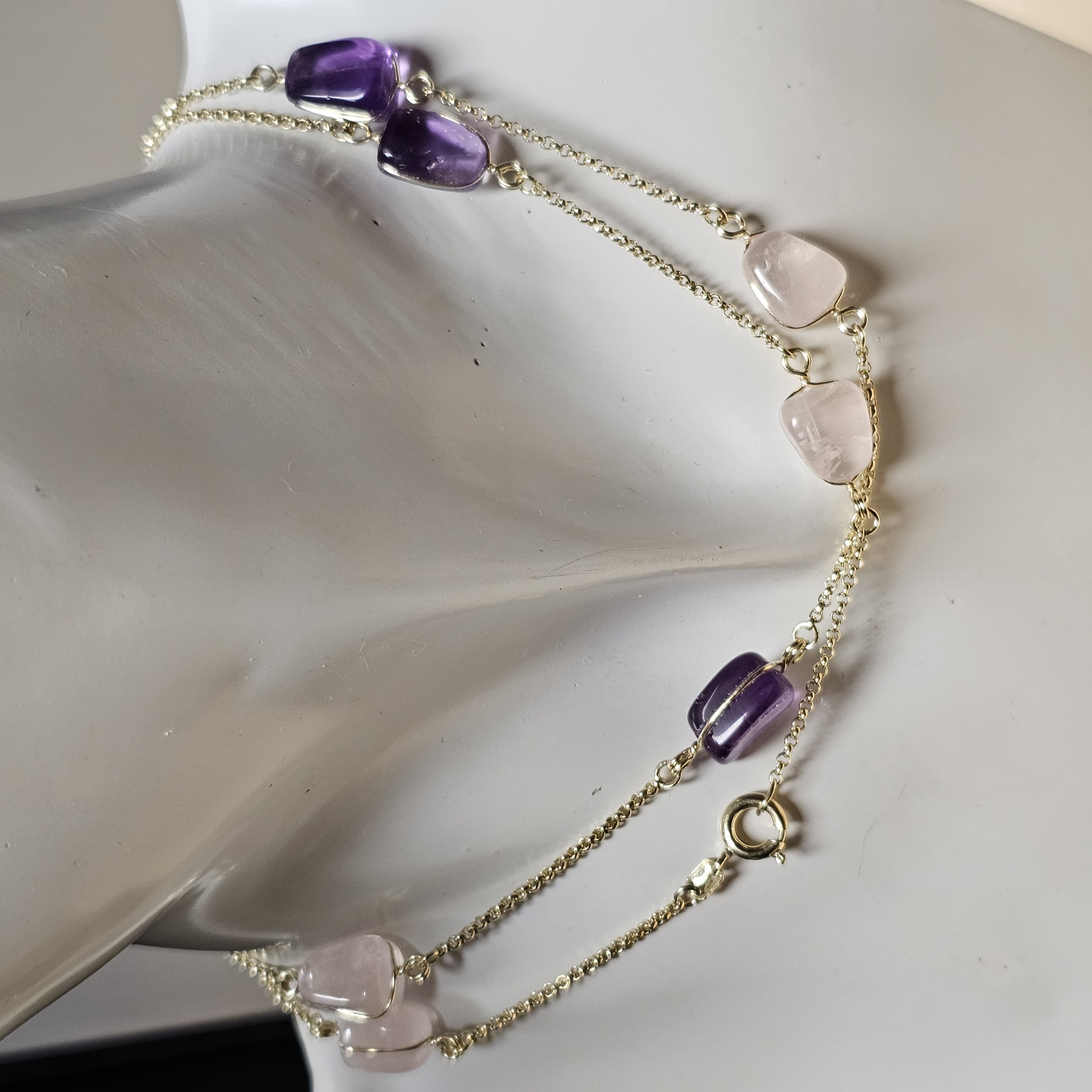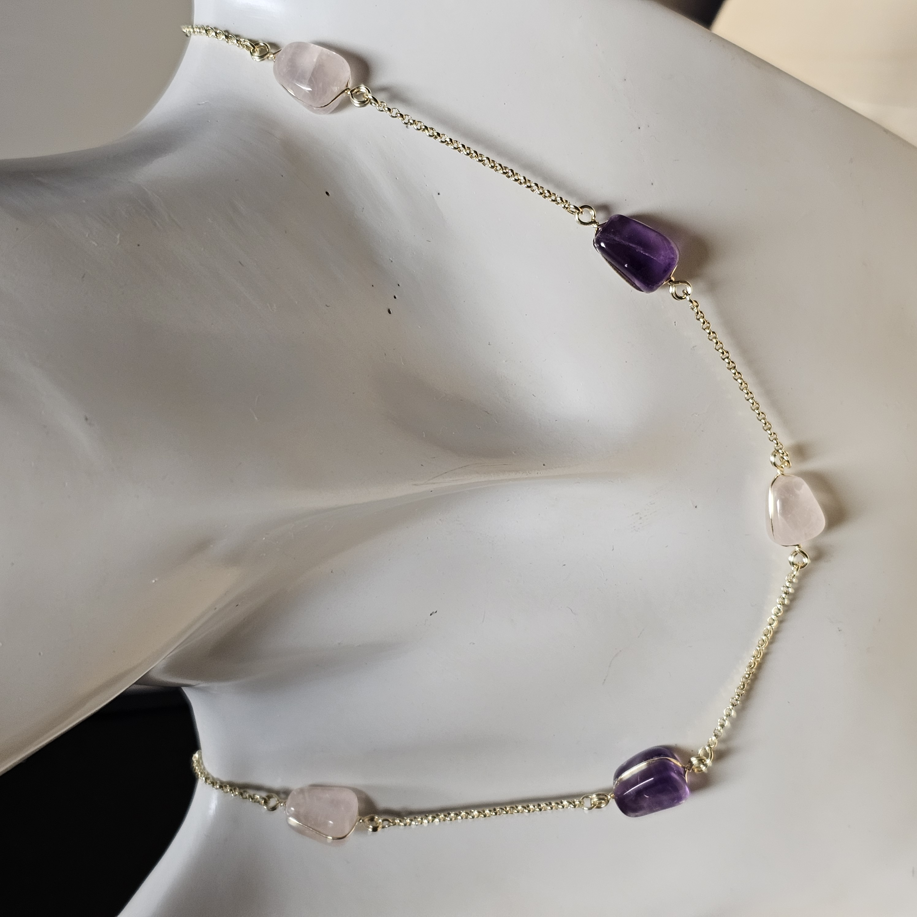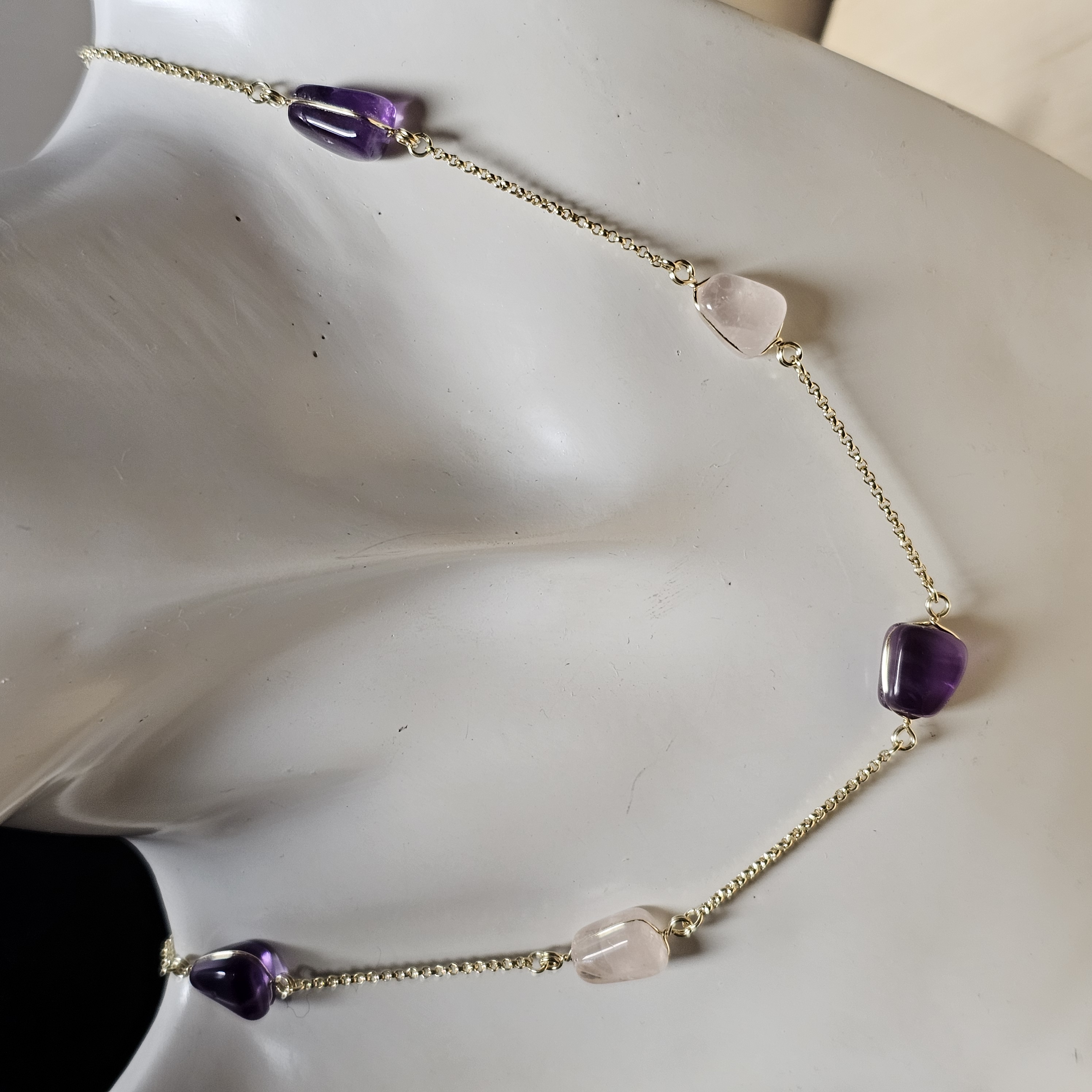 Schöne Kette / Gliederkette American Doublé vergoldet, abwechselnd mit Amethyst & Rosenquarz Steinen besetzt. Ein hübsches Vintage-Schmuckstück.