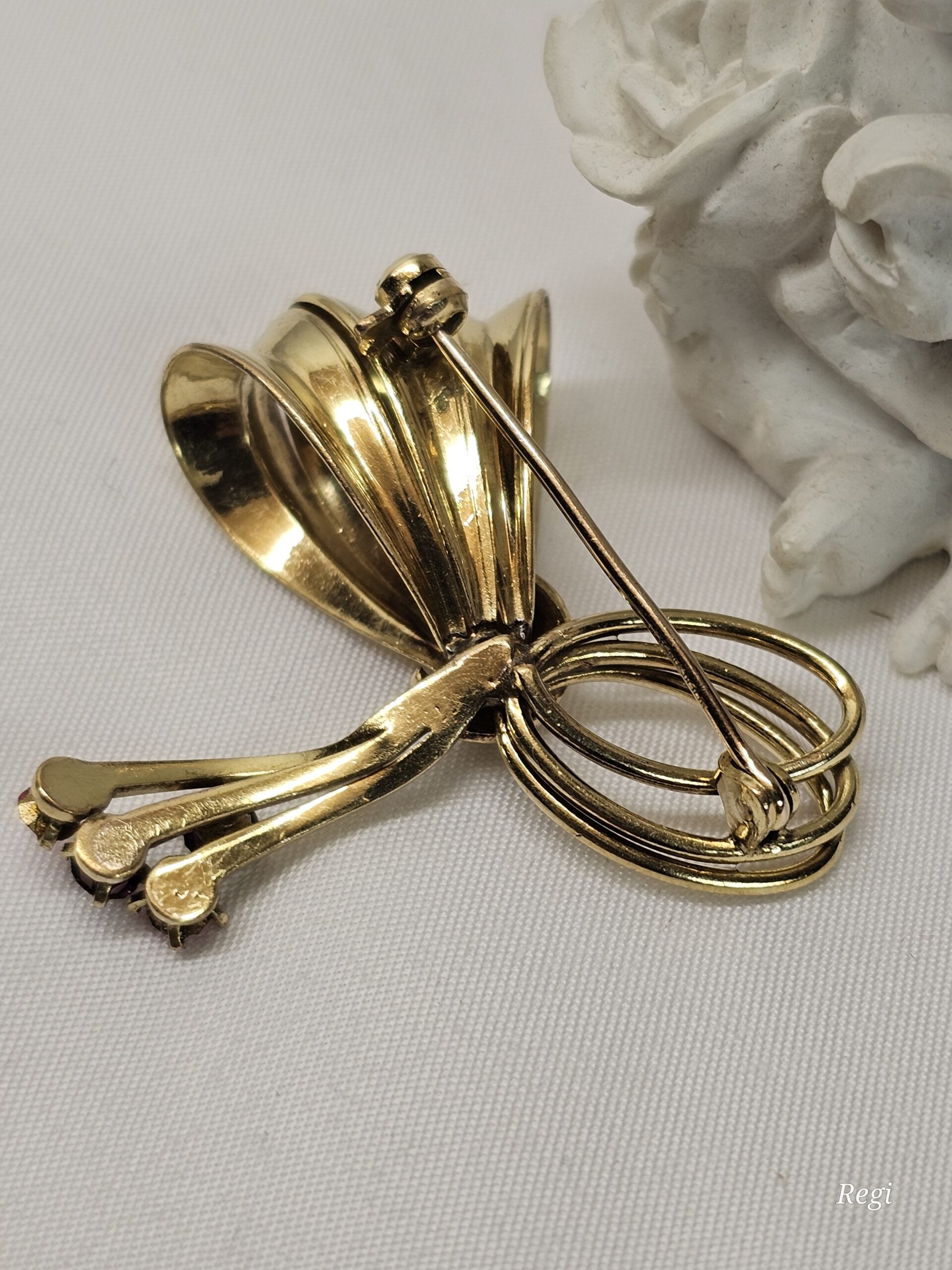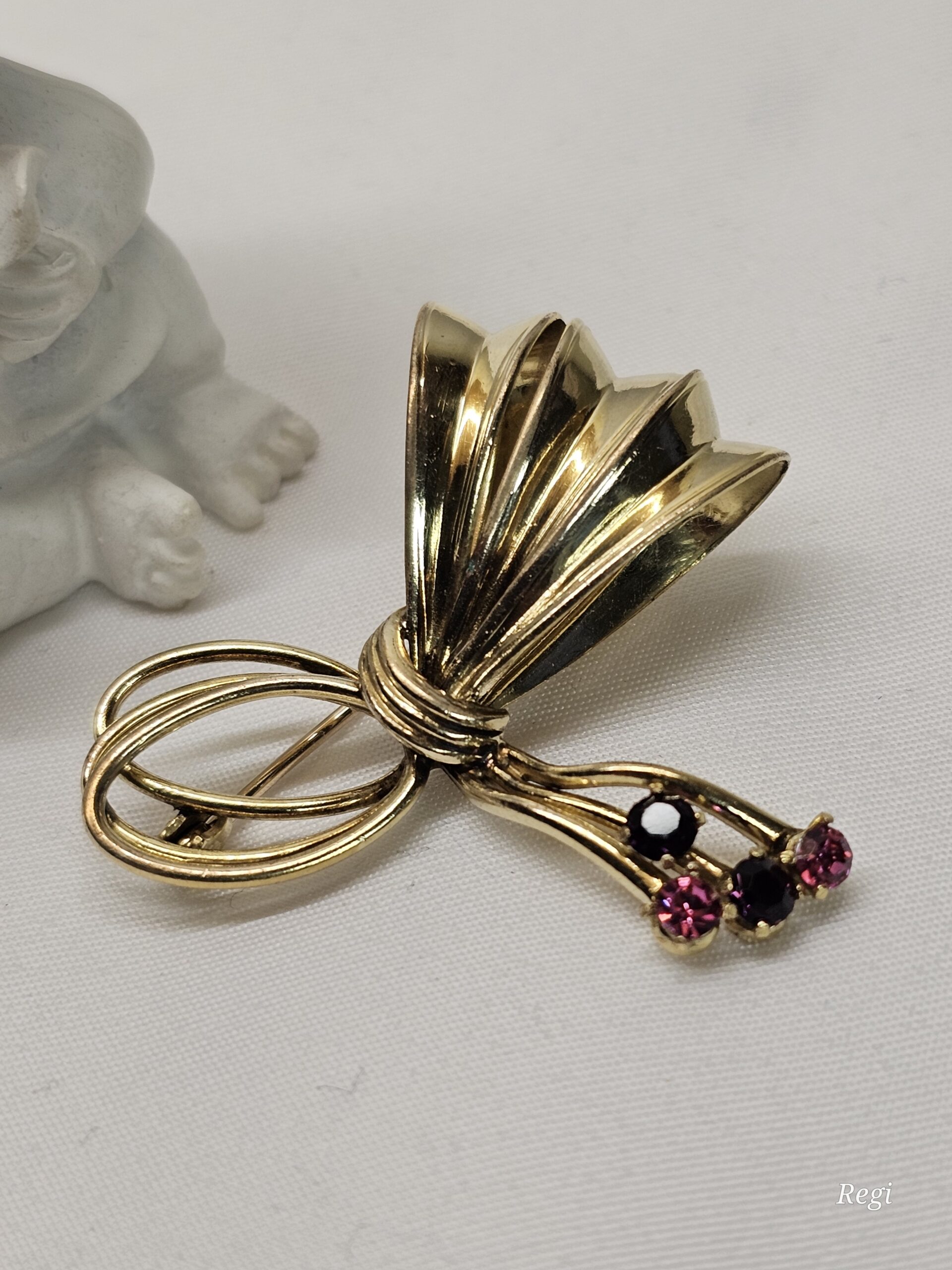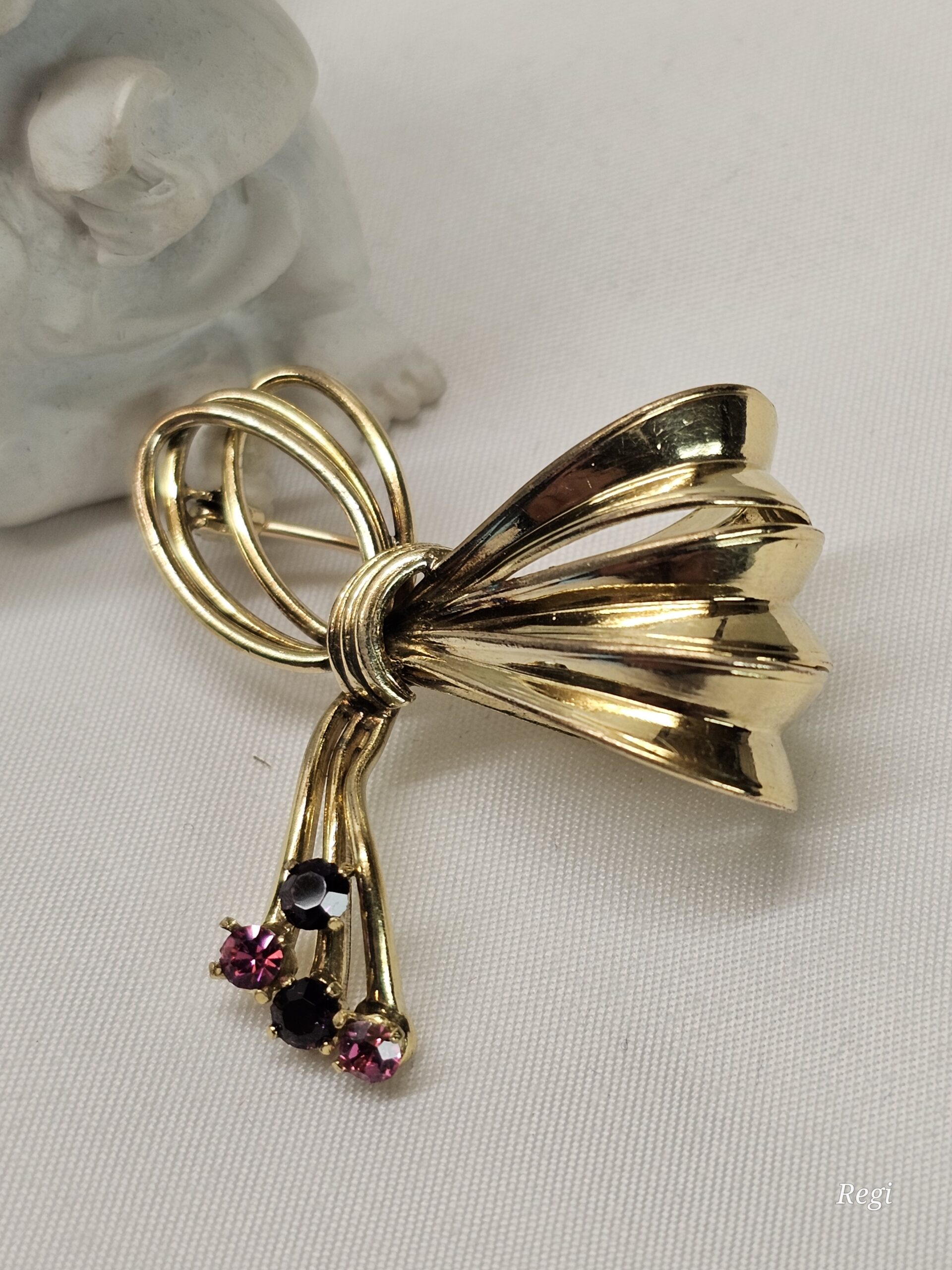 Brosche /Anstecknadel Schleife Doublé vergoldet mit je 2 lila und rosa Kristallsteinen.