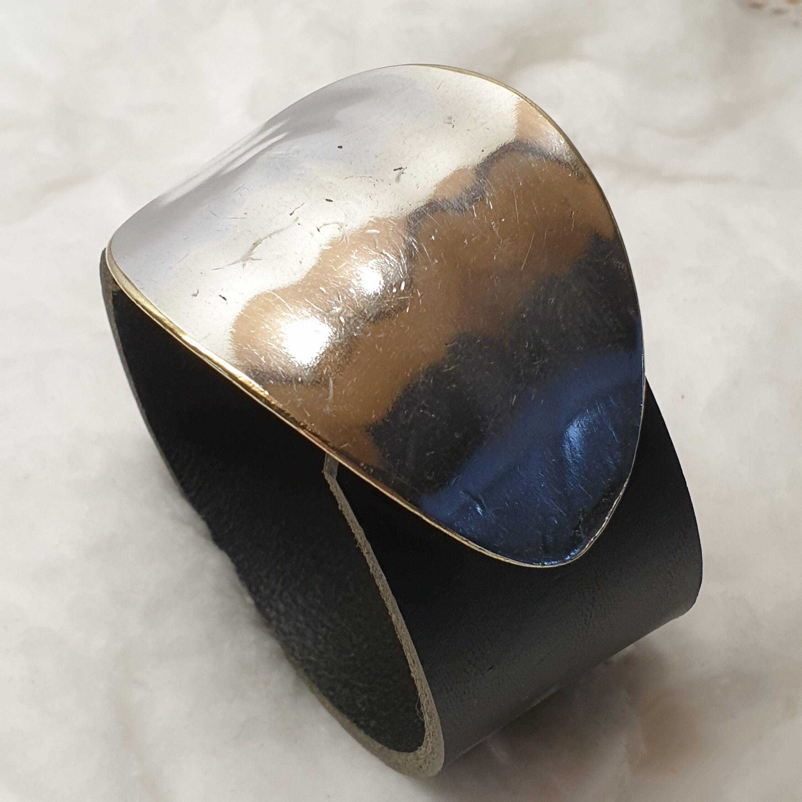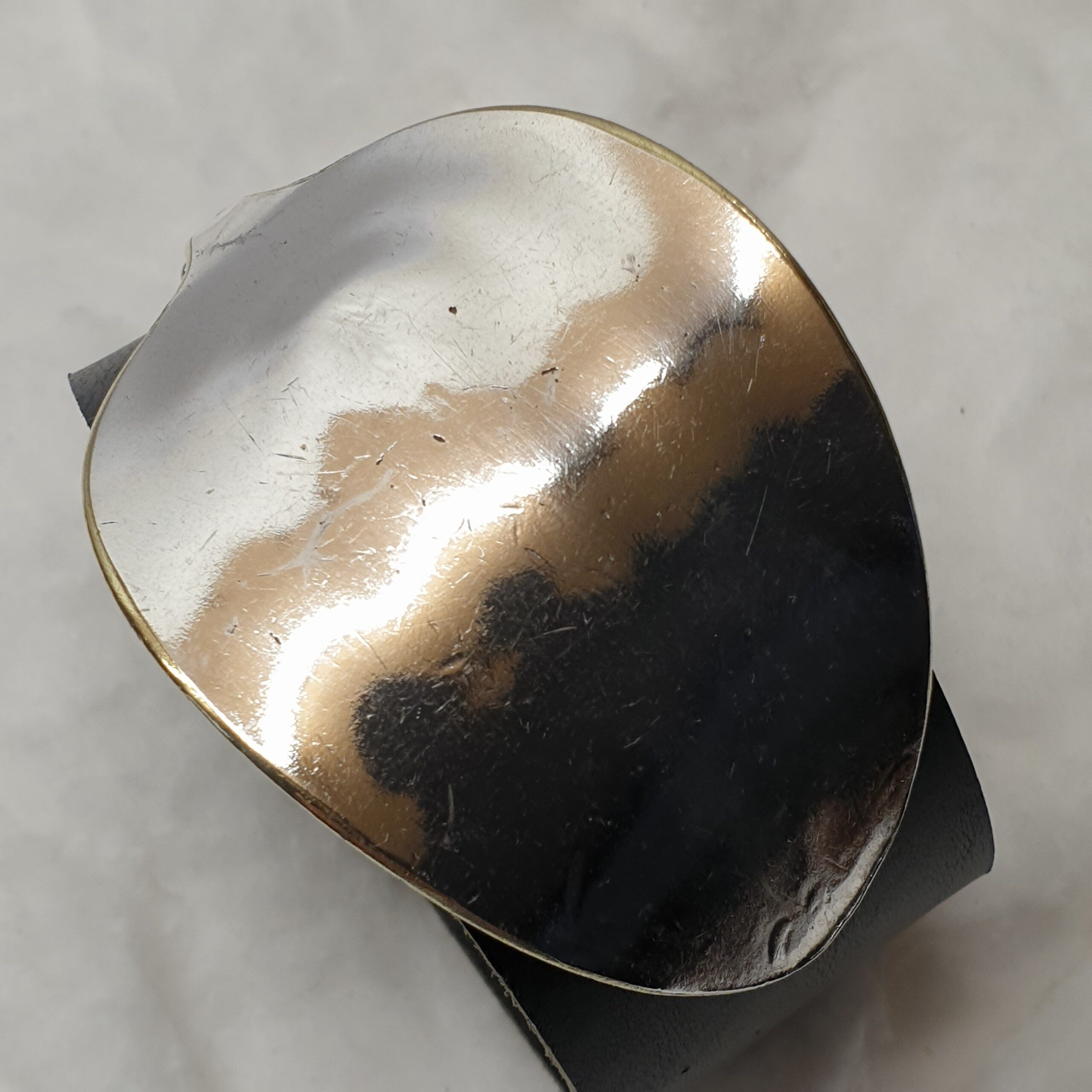 Die Schnalle/Schließe ist glänzend und hat eine messingfarbene Umrandung.