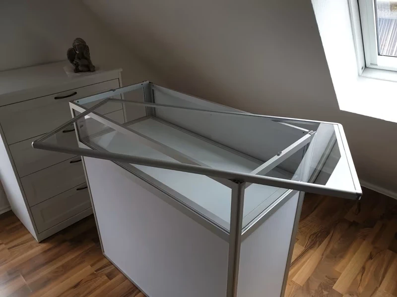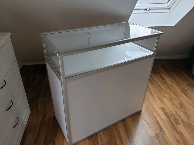 Zustand: Neuwertig Die Messetheke wurde aus der Originalverpackung entnommen und in einem Easy Flighcase Transportkoffer neu eingelagert.