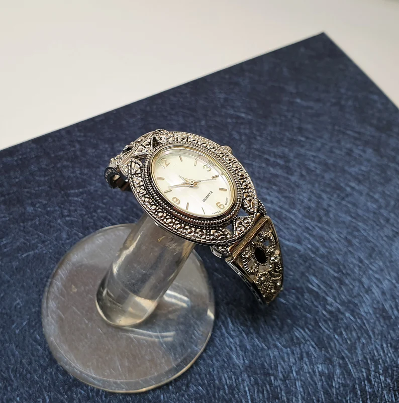 Nostalgische Damenuhr mit ovalem Perlmutt-Ziffernblatt