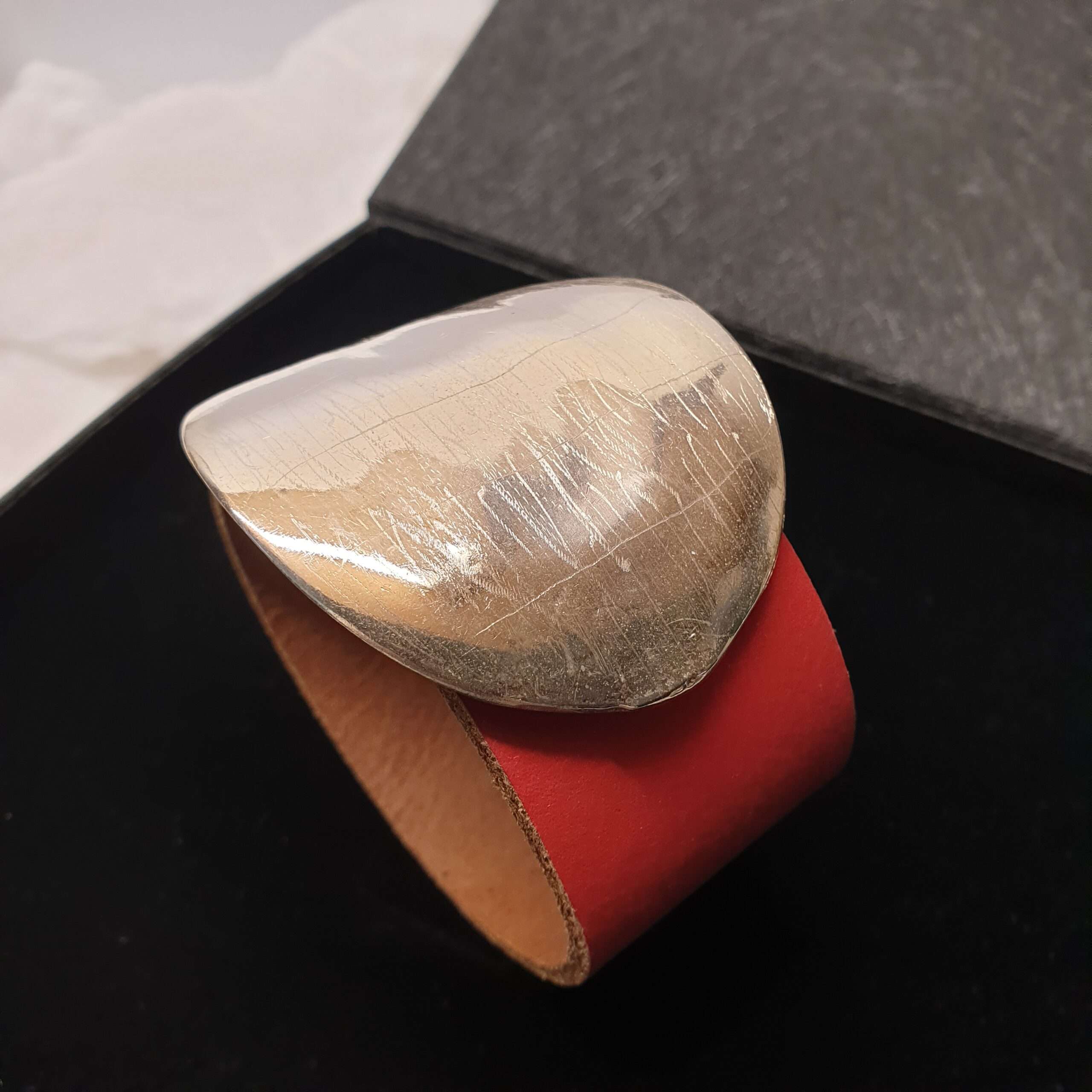 Die Schnalle/Schließe ist glänzend. Das Lederband wird oben an der Schließe