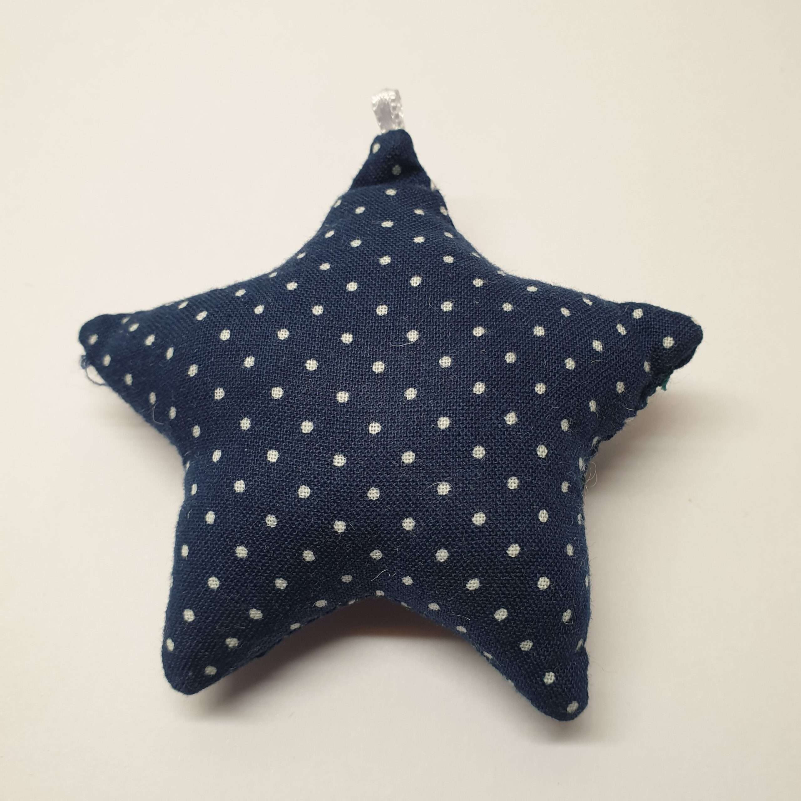 Stoff-Stern, handgenäht. Stoff in der Farbe Dunkelblau mit kleinen weißen Punkten und weißem kleinen Schlaufenbändchen.