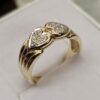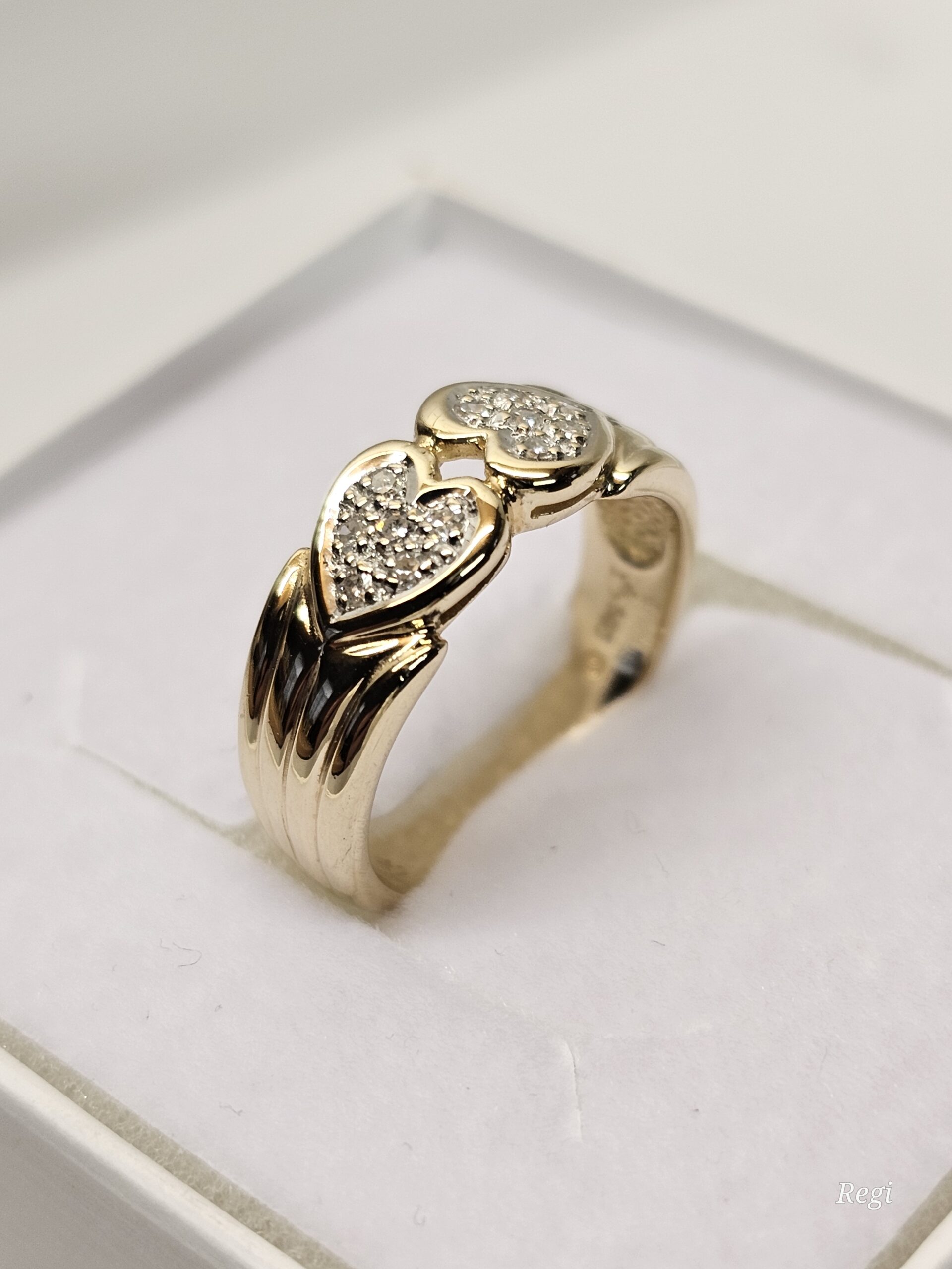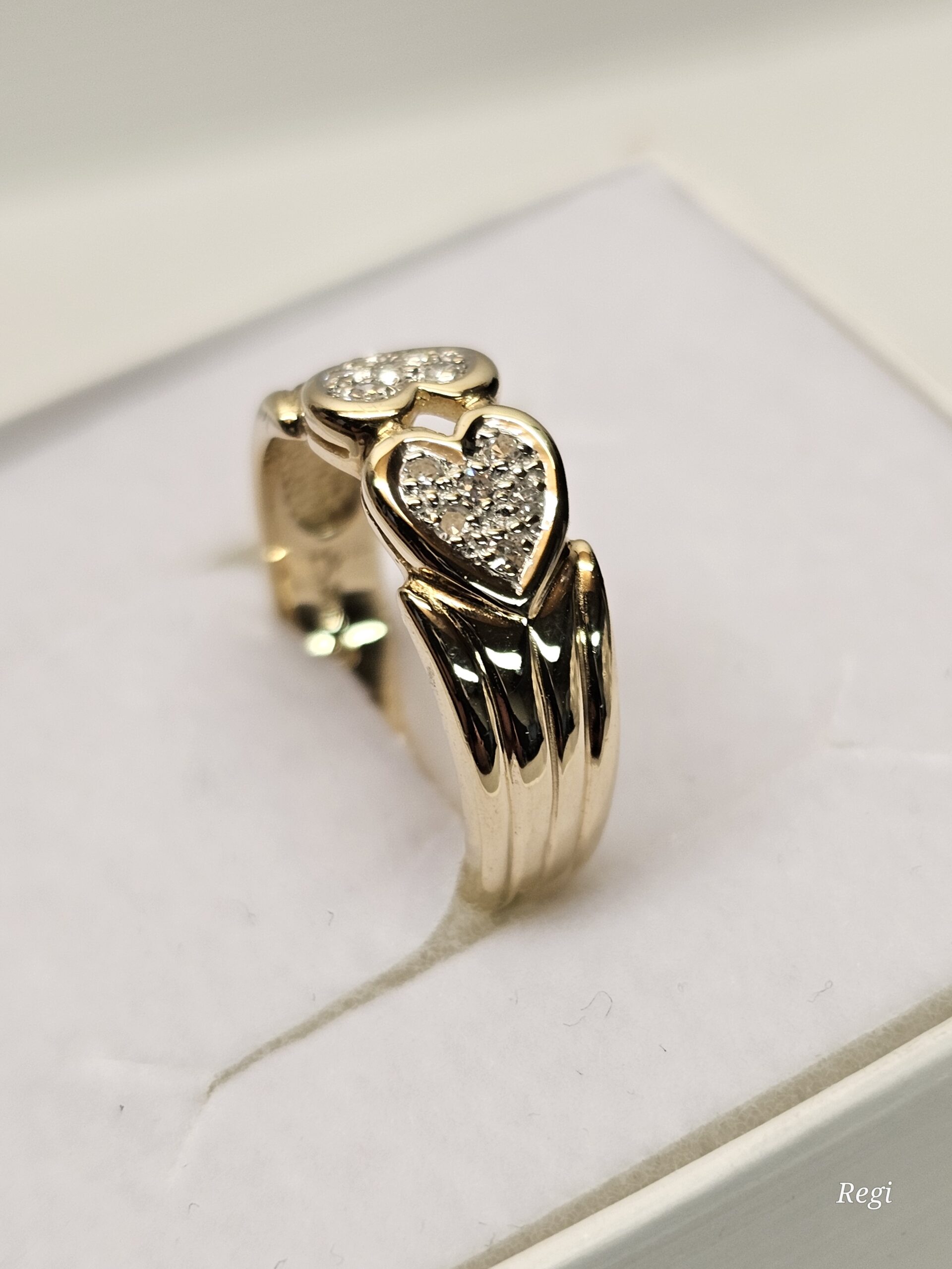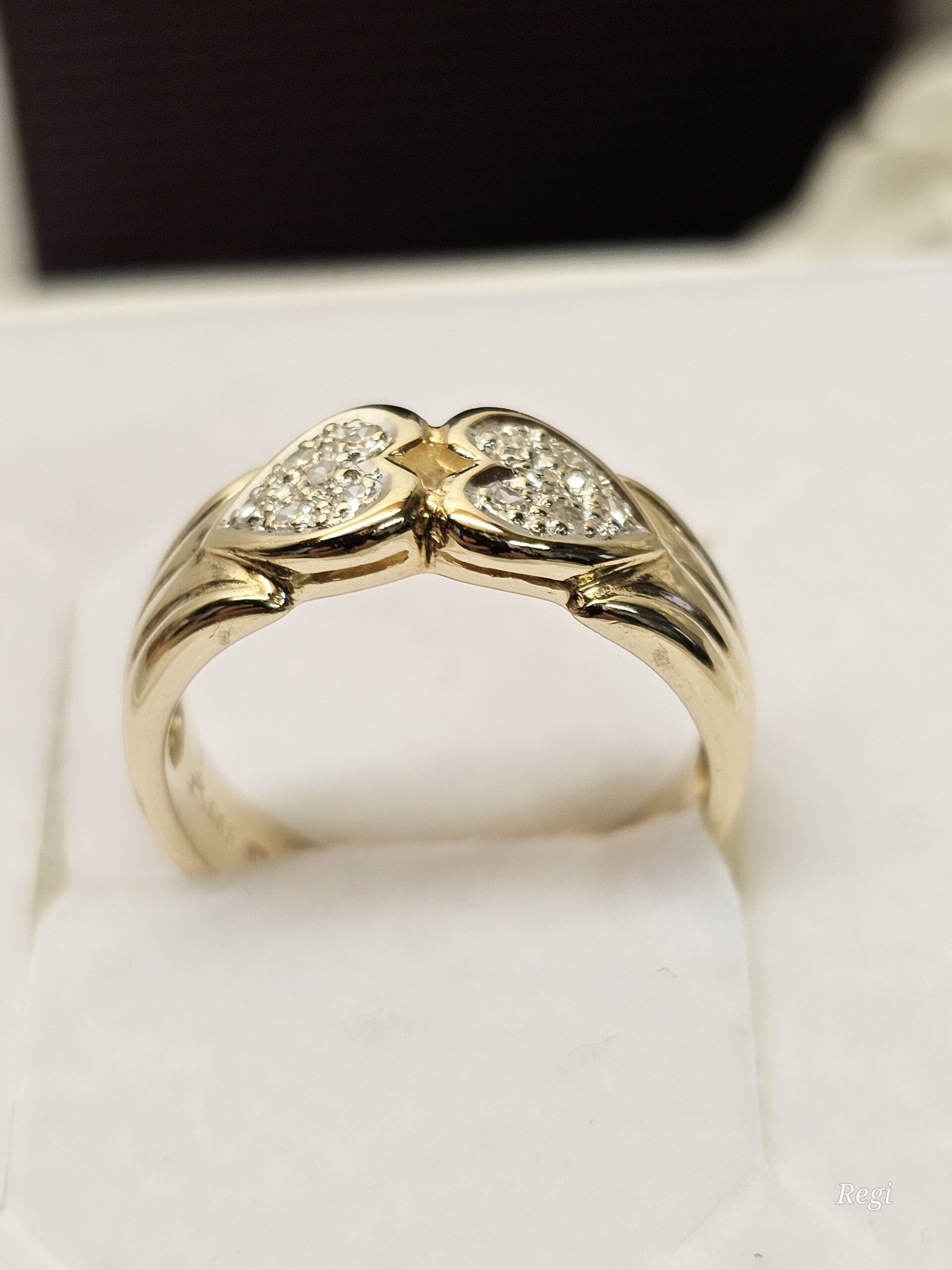 Wunderschöner Ring aus Gold 585. Am Ringkopf ist das schöne Stück mit zwei Herzchen gestaltet und mit kleinsten Diamantsteinchen verziert, die auf einem teilplatinierten Untergrund sitzen.