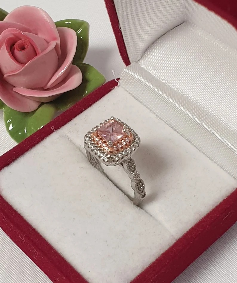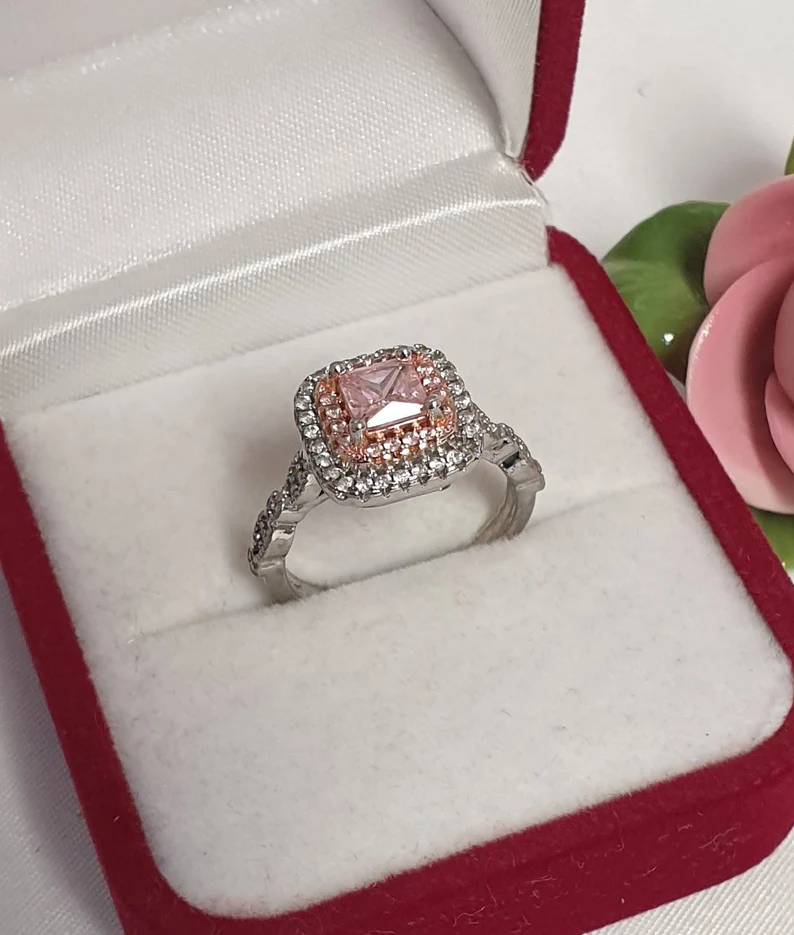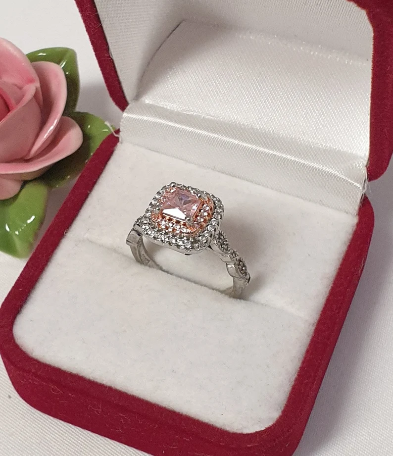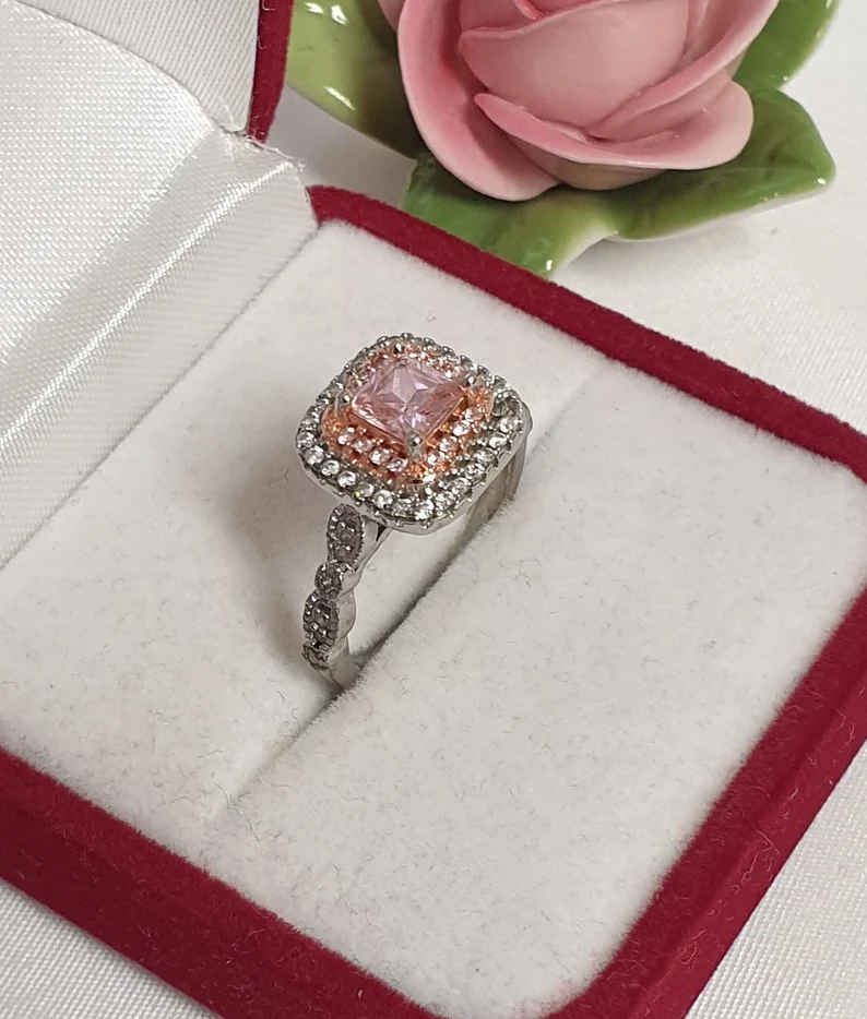Silberring Silber 925, edles Design mit einer Rotgold-Teilvergoldung auf dem Ringkopf, verziert mit rosafarbenen und klaren Kristallsteinchen.