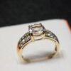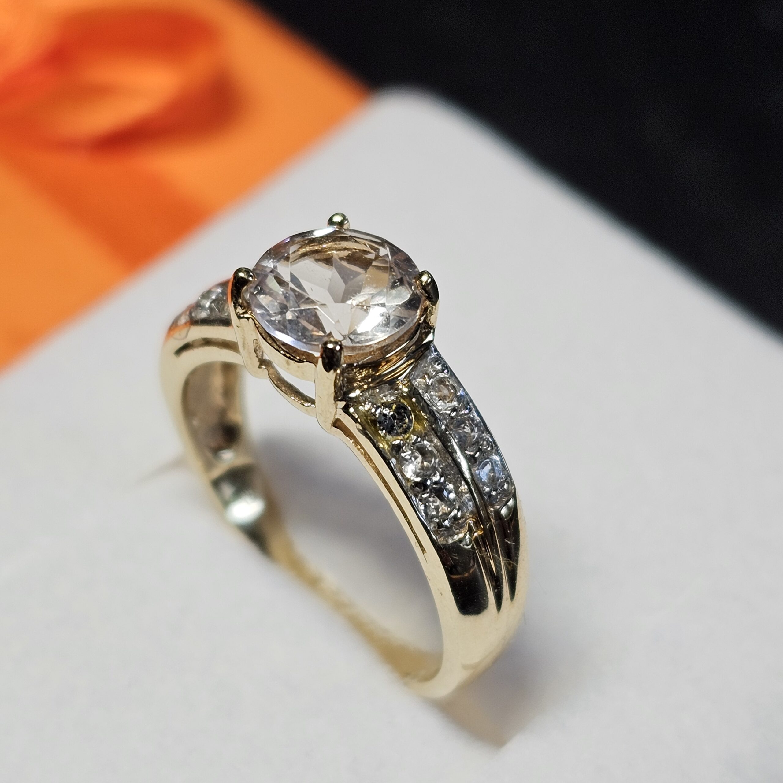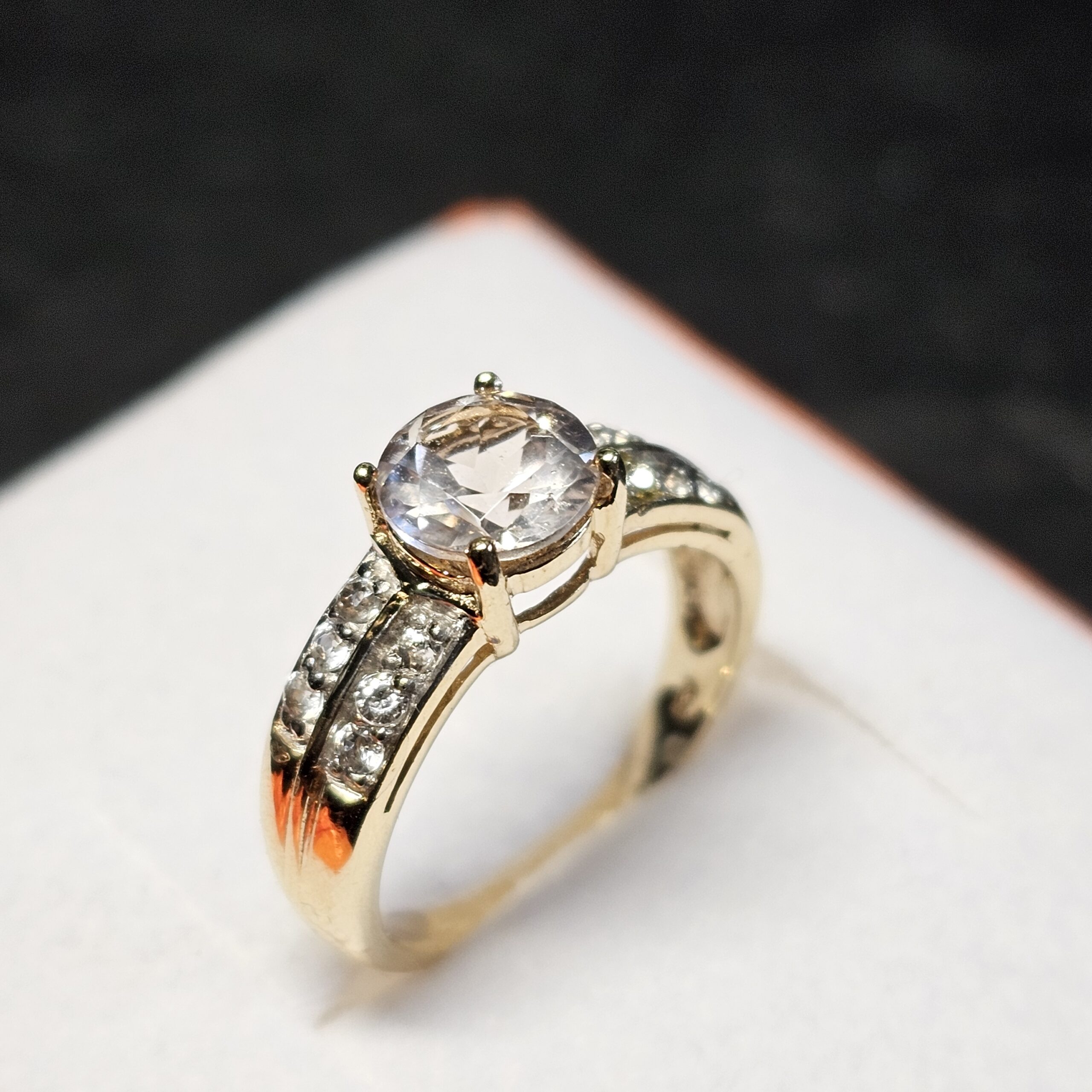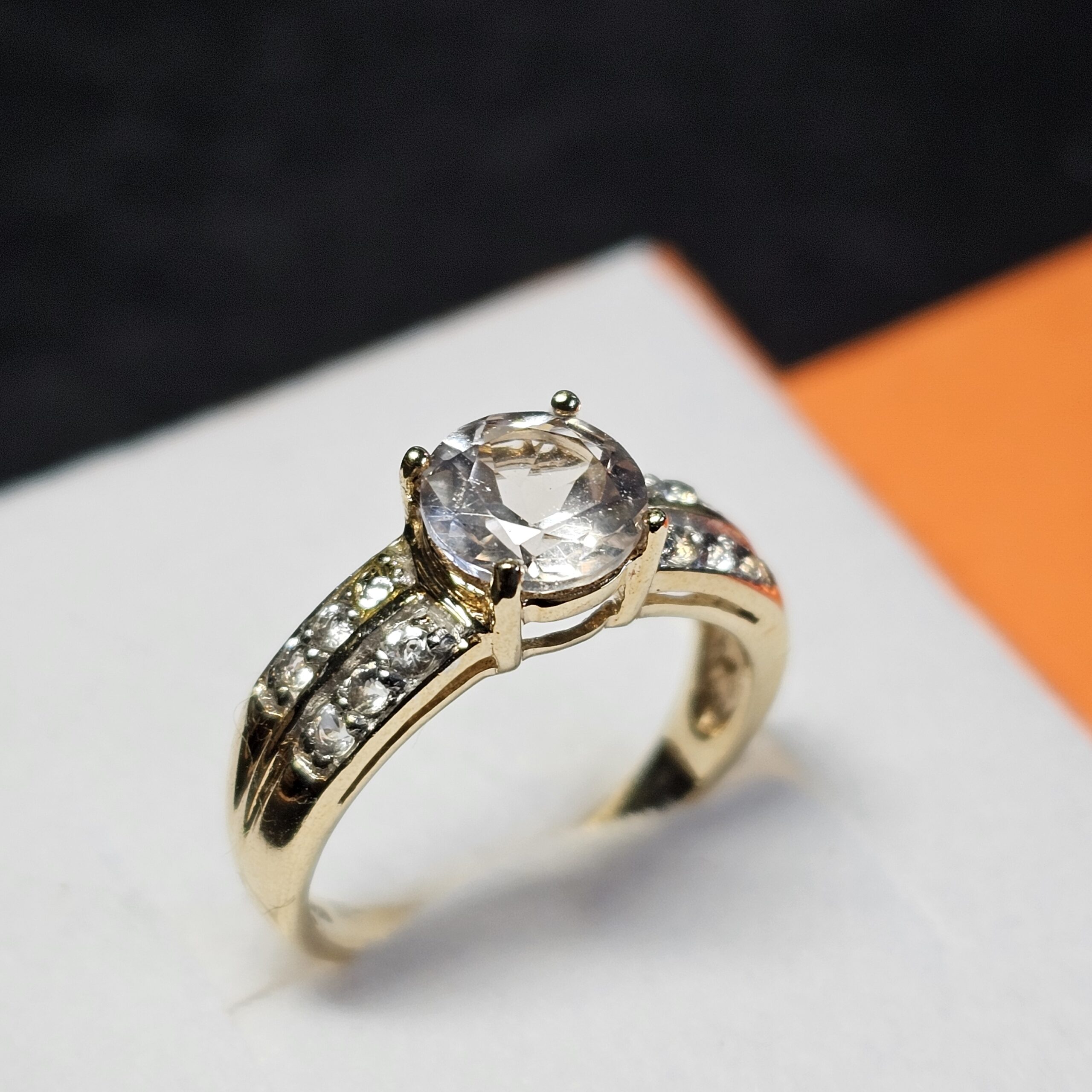 Toller Ring aus Gold 375, ein schöner Kristallstein schmückt den Ringkopf. Links und rechts daneben seitlich an der Ringschiene entlang sind in einer 2er Reihen kleine Kristallsteinchen angebracht.