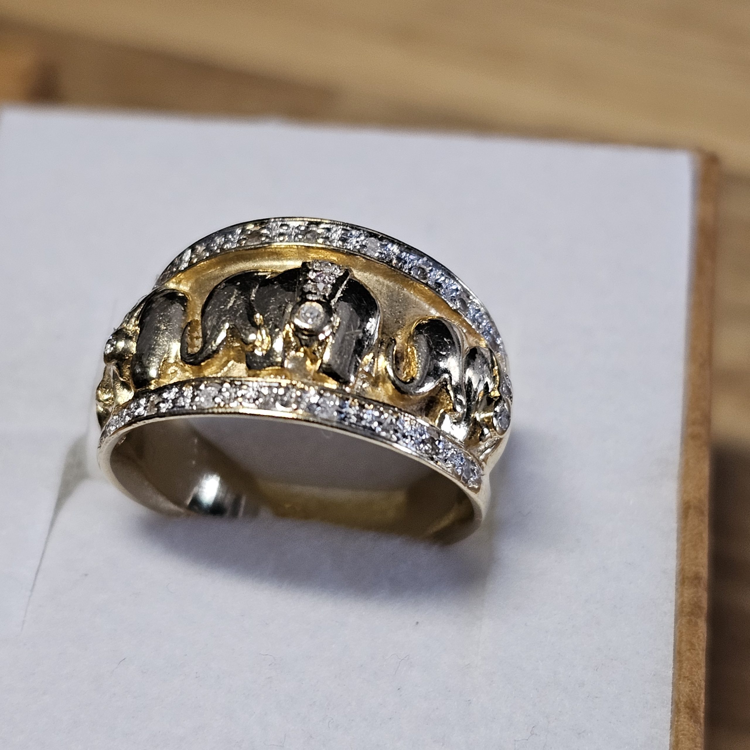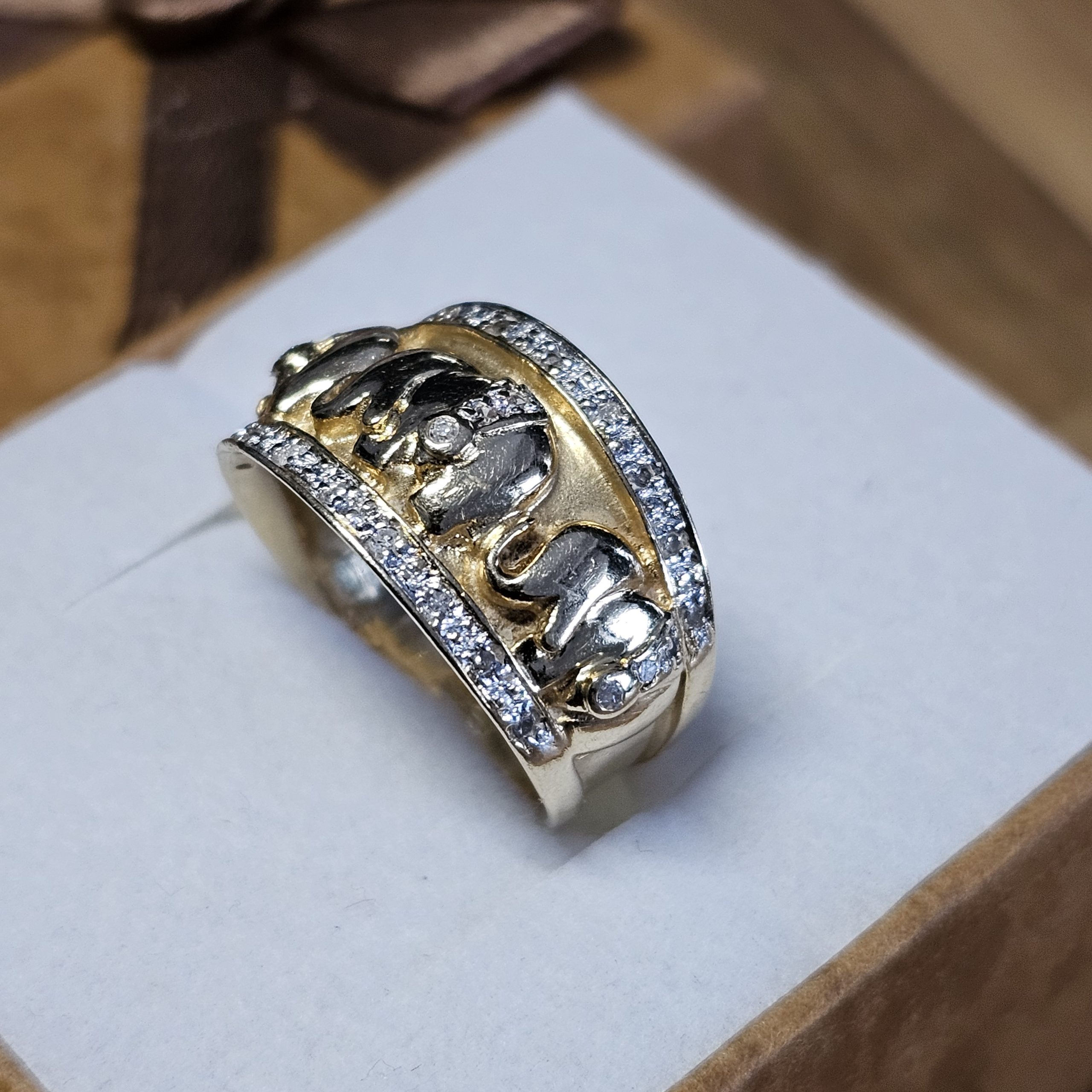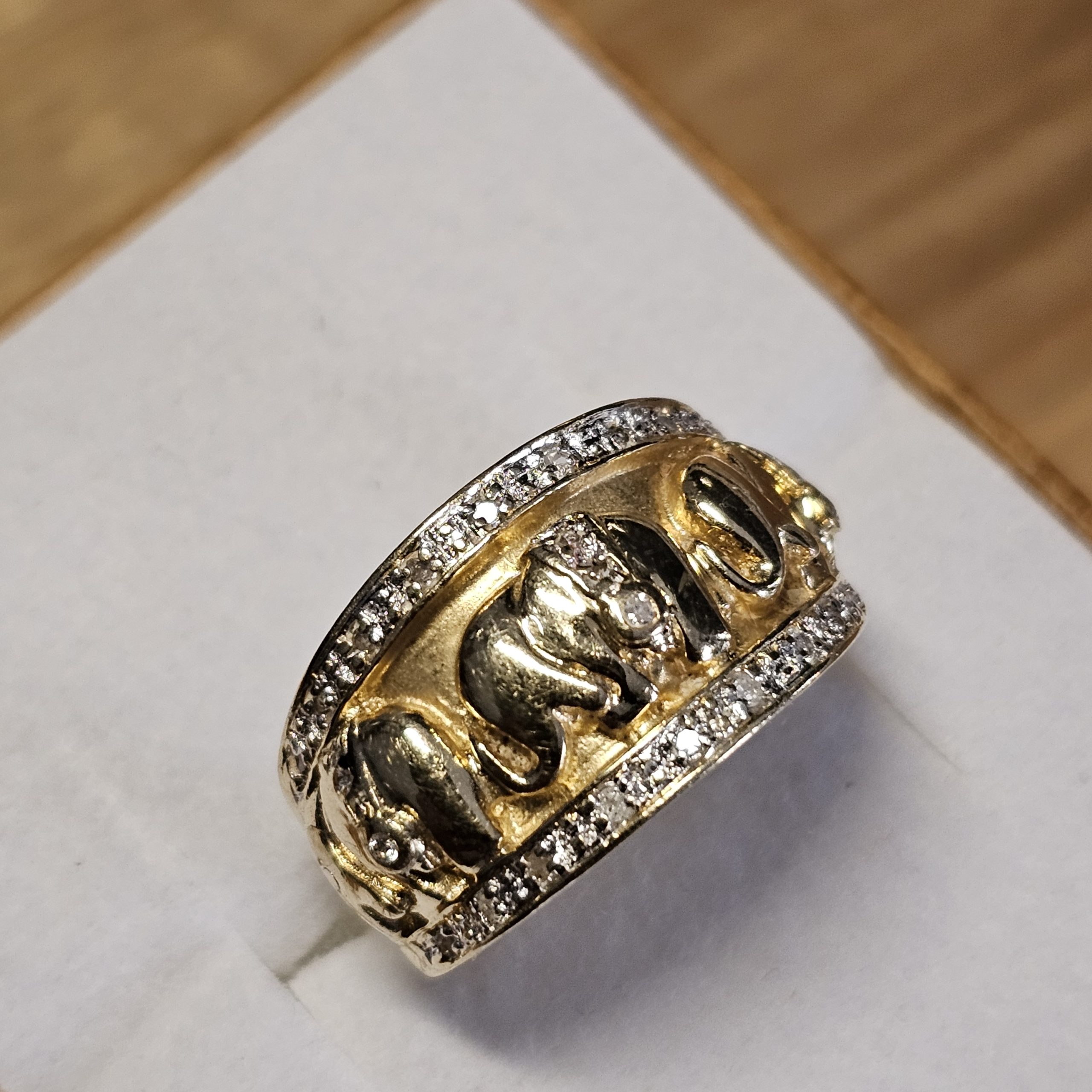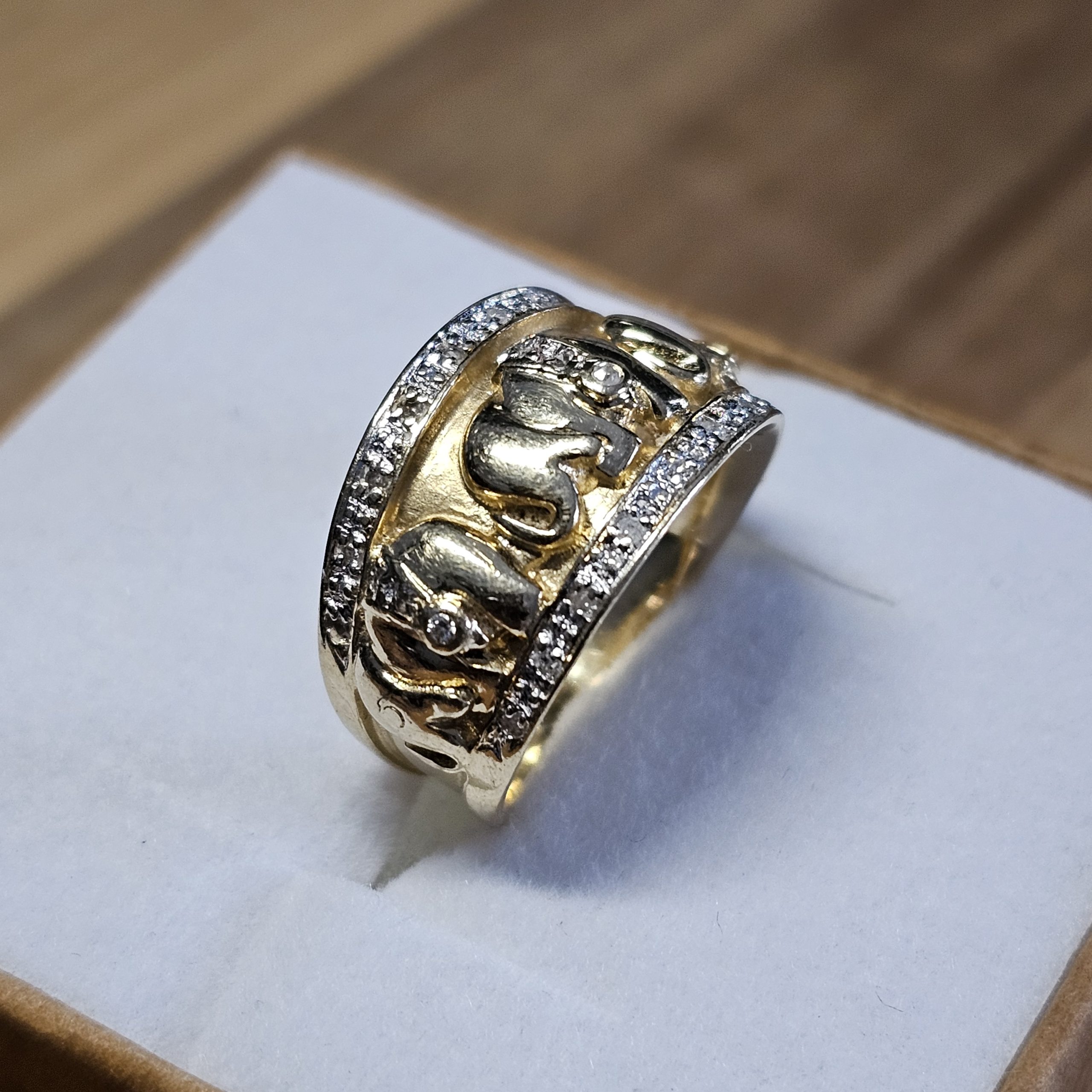 Hübscher Ring aus Gold 585. Auf dem Ringkopf sind 3 Stück Elefanten dargstellt, sie tragen jeweils auf dem Rückenband 3 Stck. kleinste Diamantsteinchen, der Ringkopfrand ist auf jeder Seite ebenfalls mit kleinsten Diamantsteinchen besetzt.