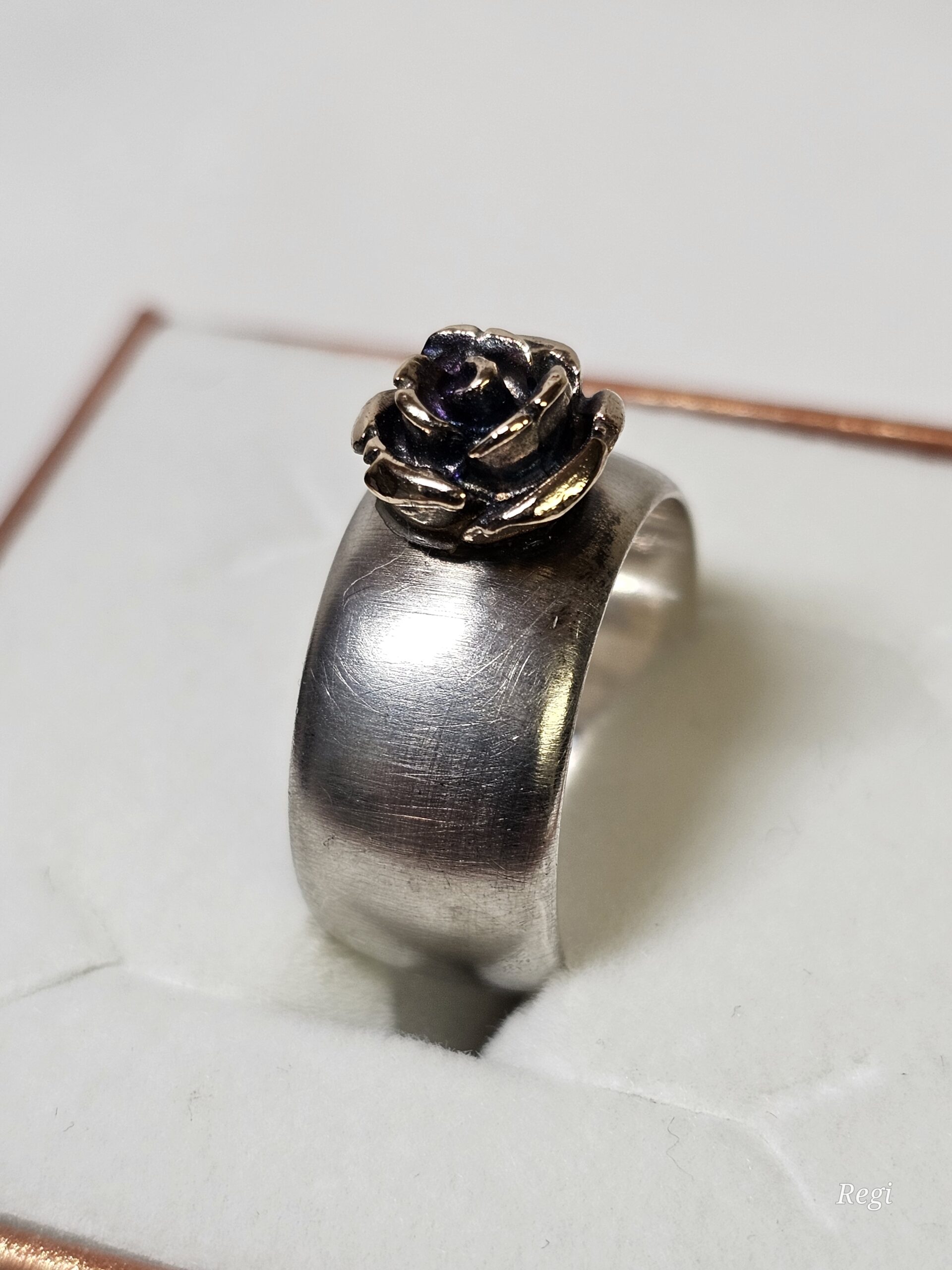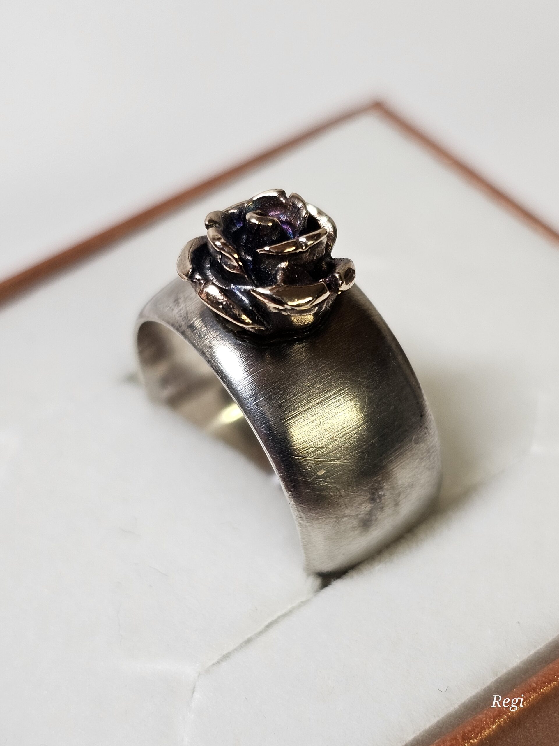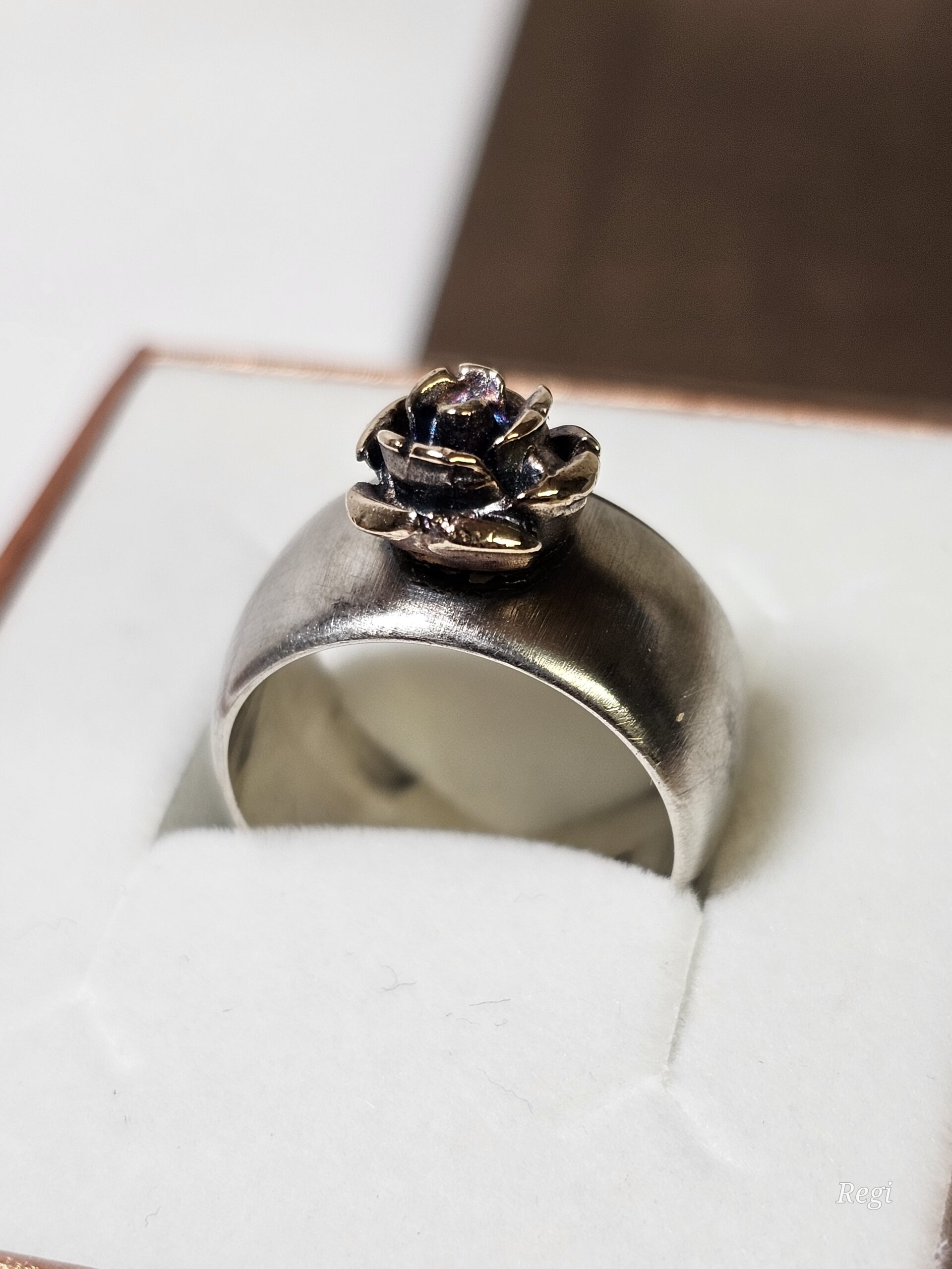 Hübscher Ring aus Silber 925. Eine teilvergoldete Rosenblüte schmückt den Ringkopf.