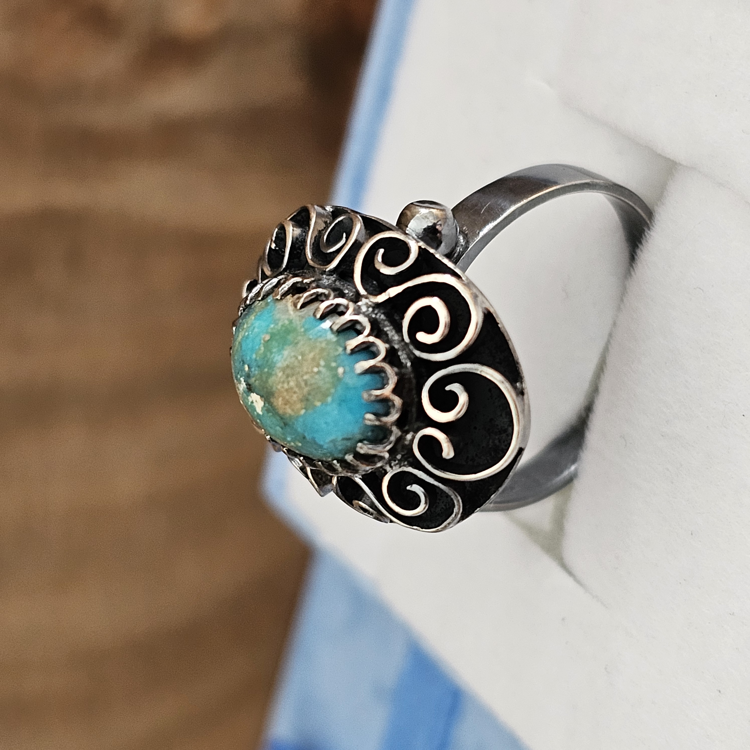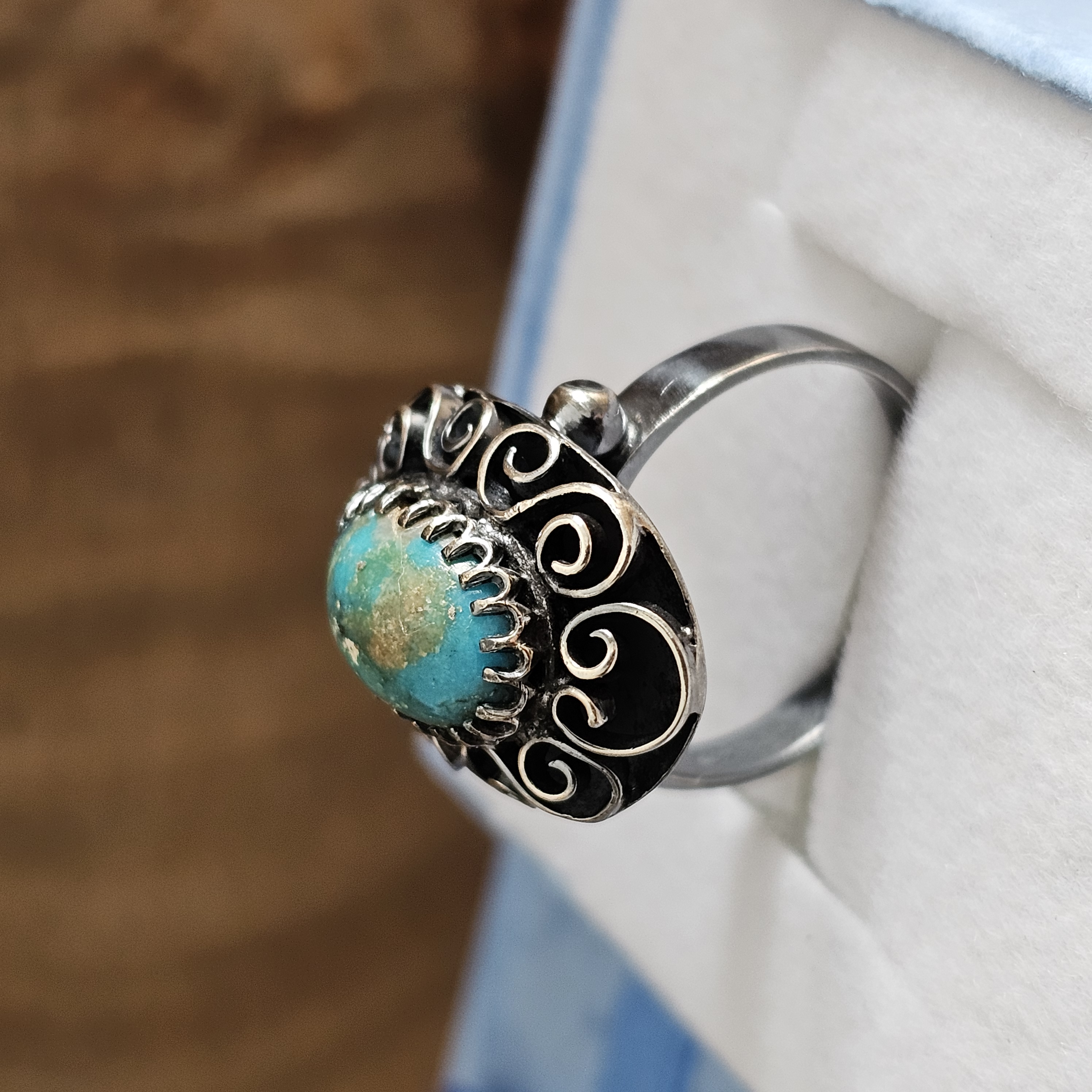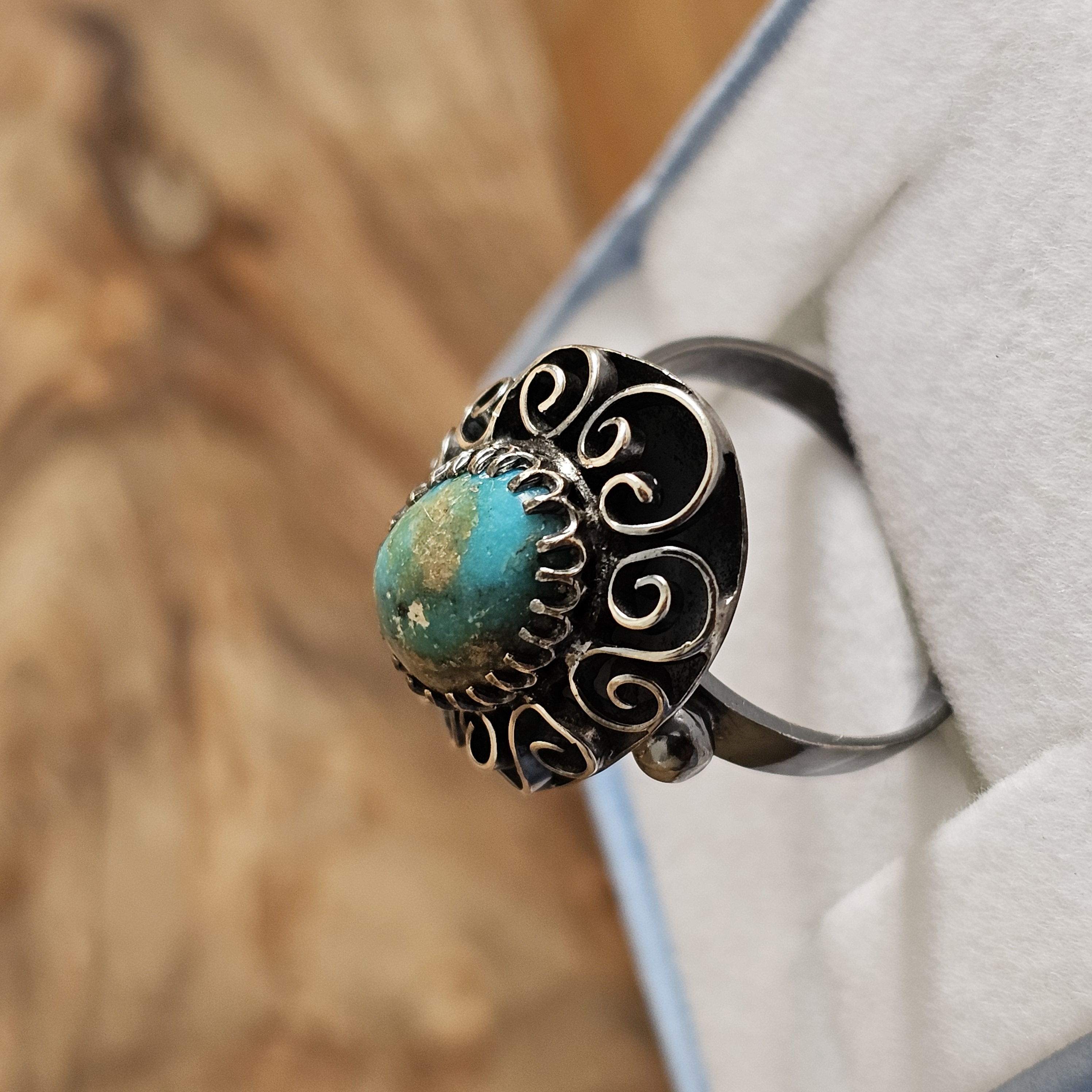 Nostalgischer Silberring mit einem schönen Türkis-Rohstein. Aufwendig gearbeitete Fassung. Ein schönes Einzelstück.
