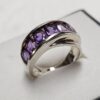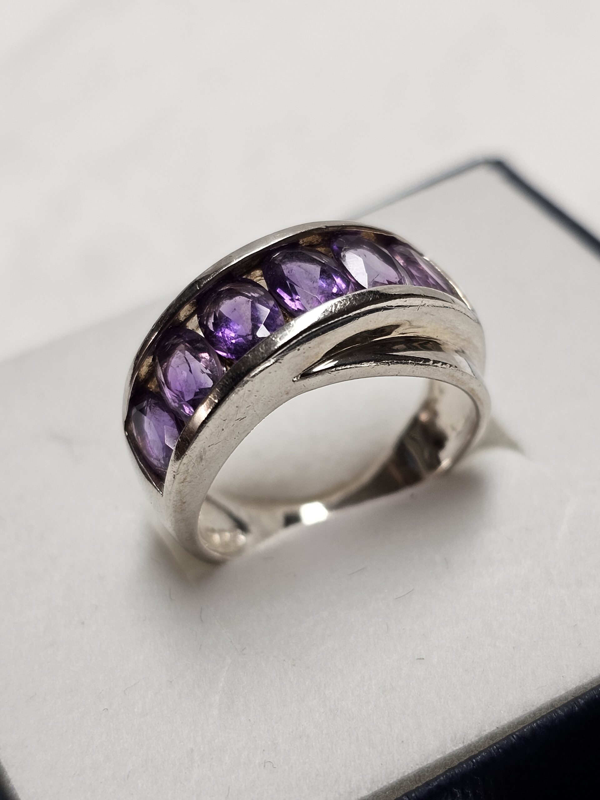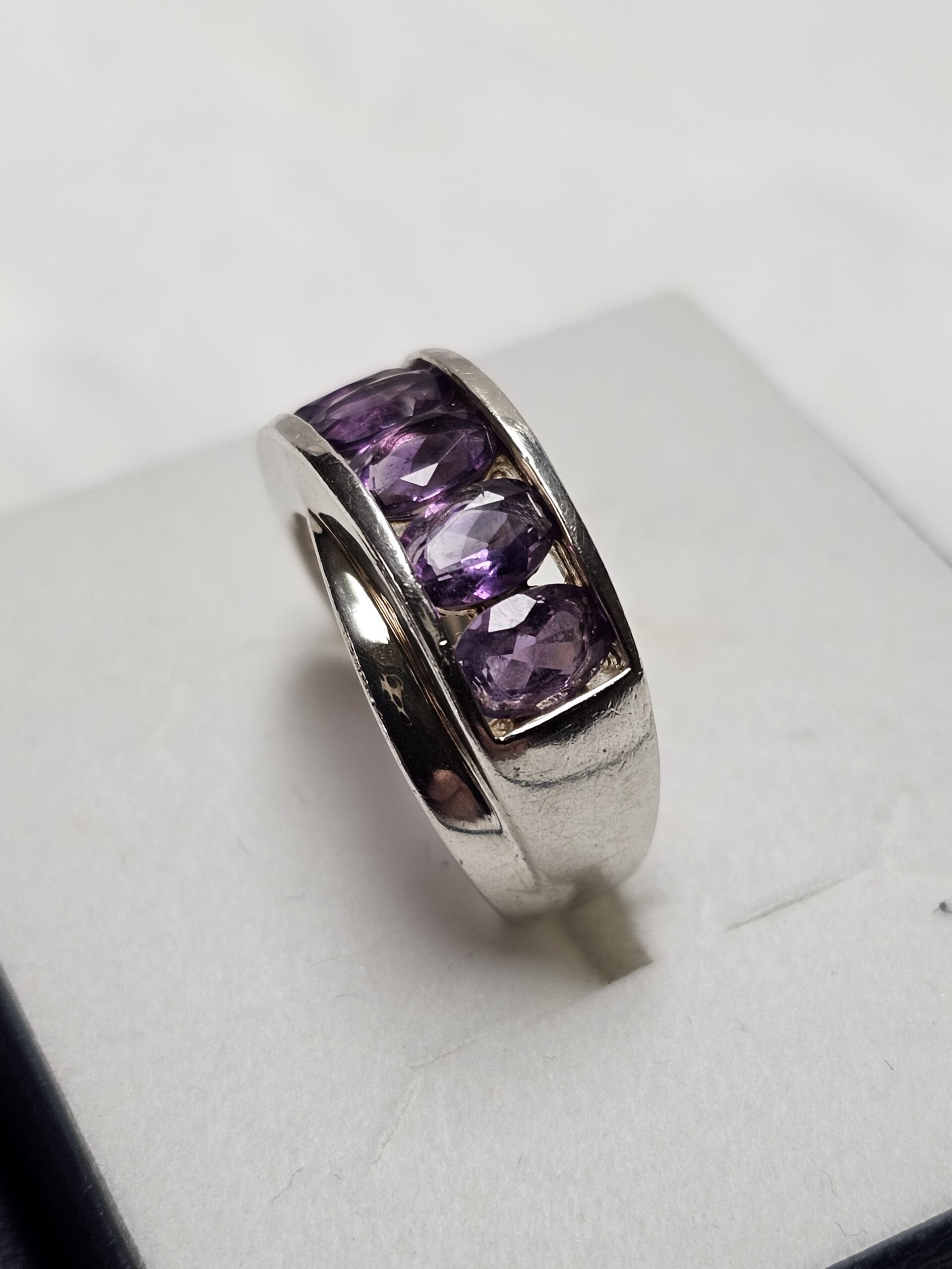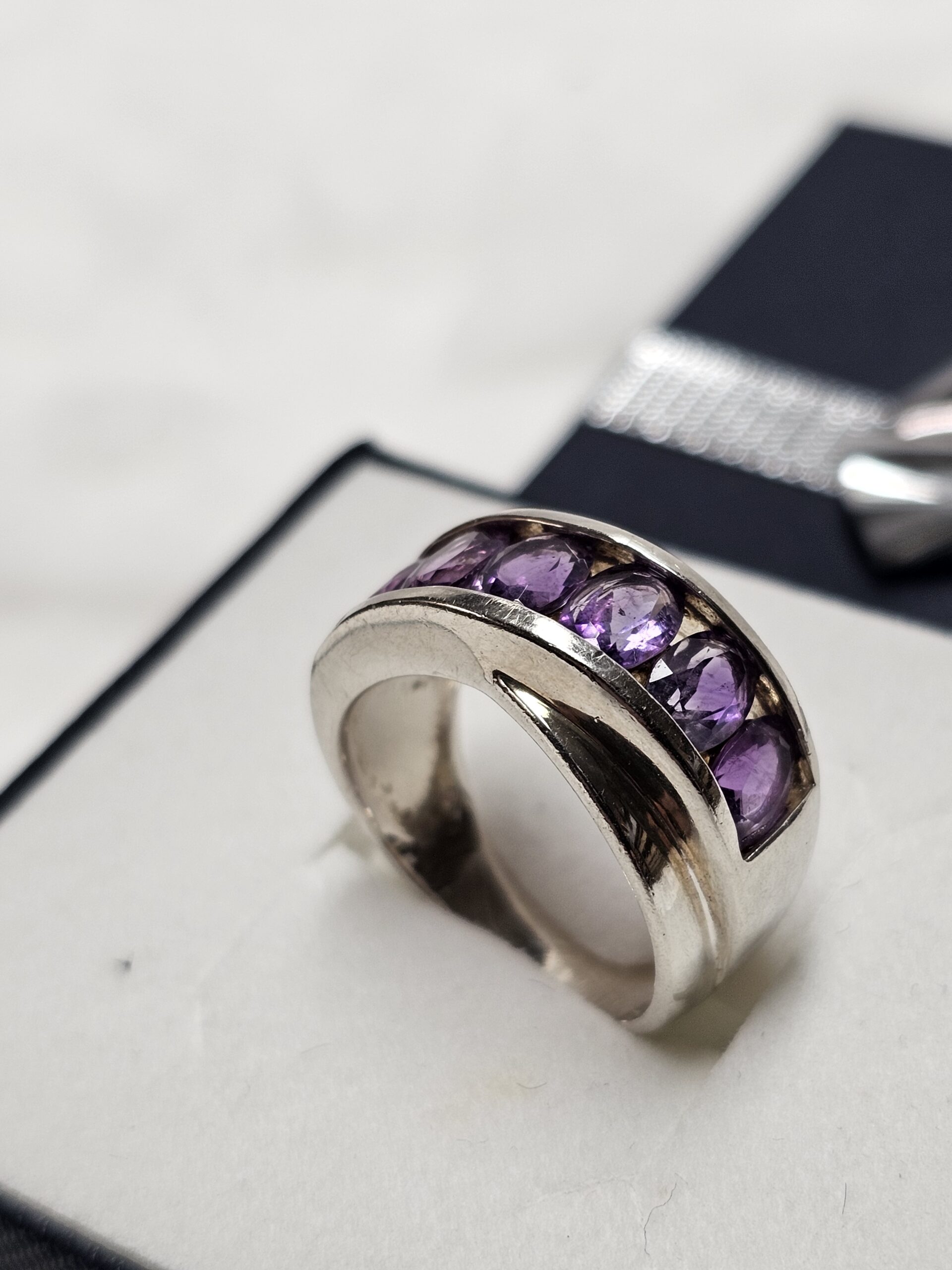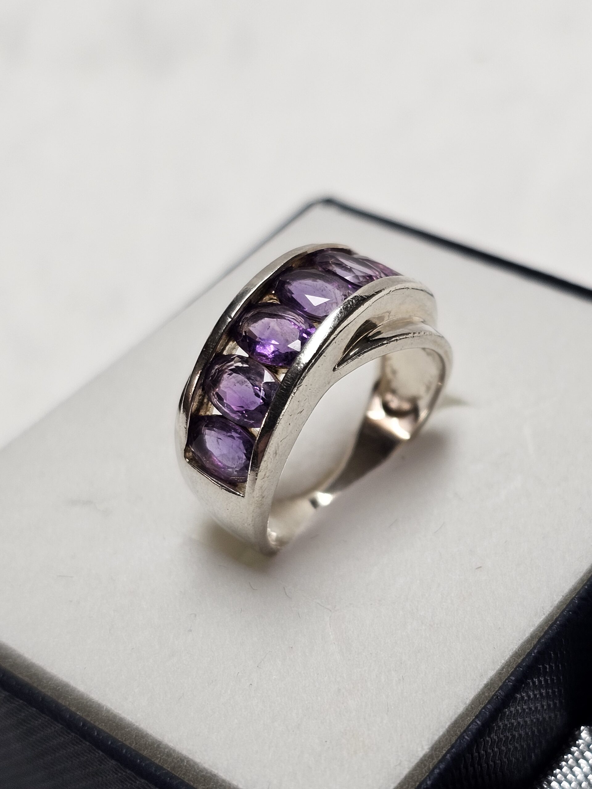 Eleganter Silberring aus Silber 925, im Ringkopfbereich mit angedeuteter Wickeloptik gestaltet. Tolle Amethyst Steine sind etwas seitlich verlaufend, angebracht.