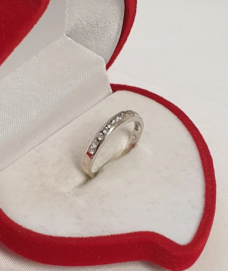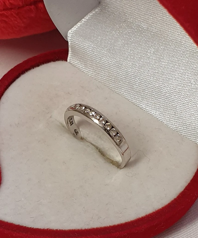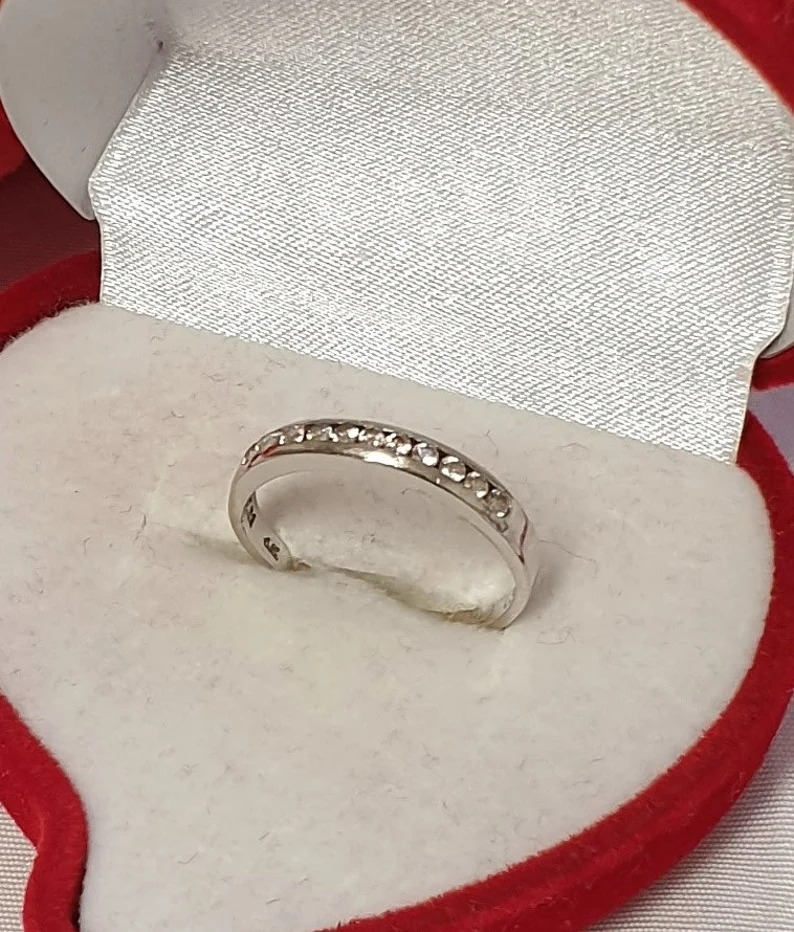 Hübscher Weißgoldring 585 mit Widmung „Chris“. Der Ringkopfbereich ist mit klaren Kristallen besetzt.