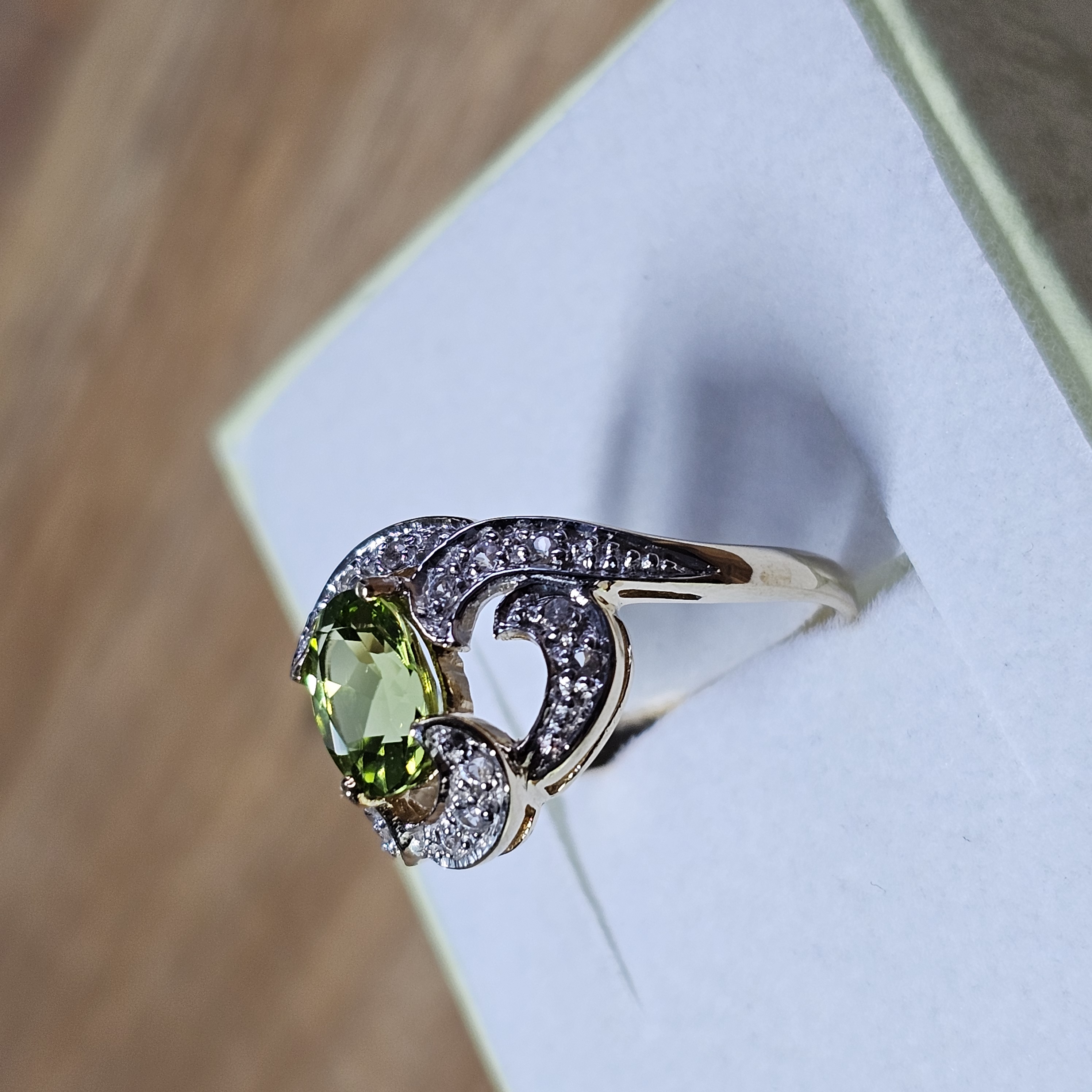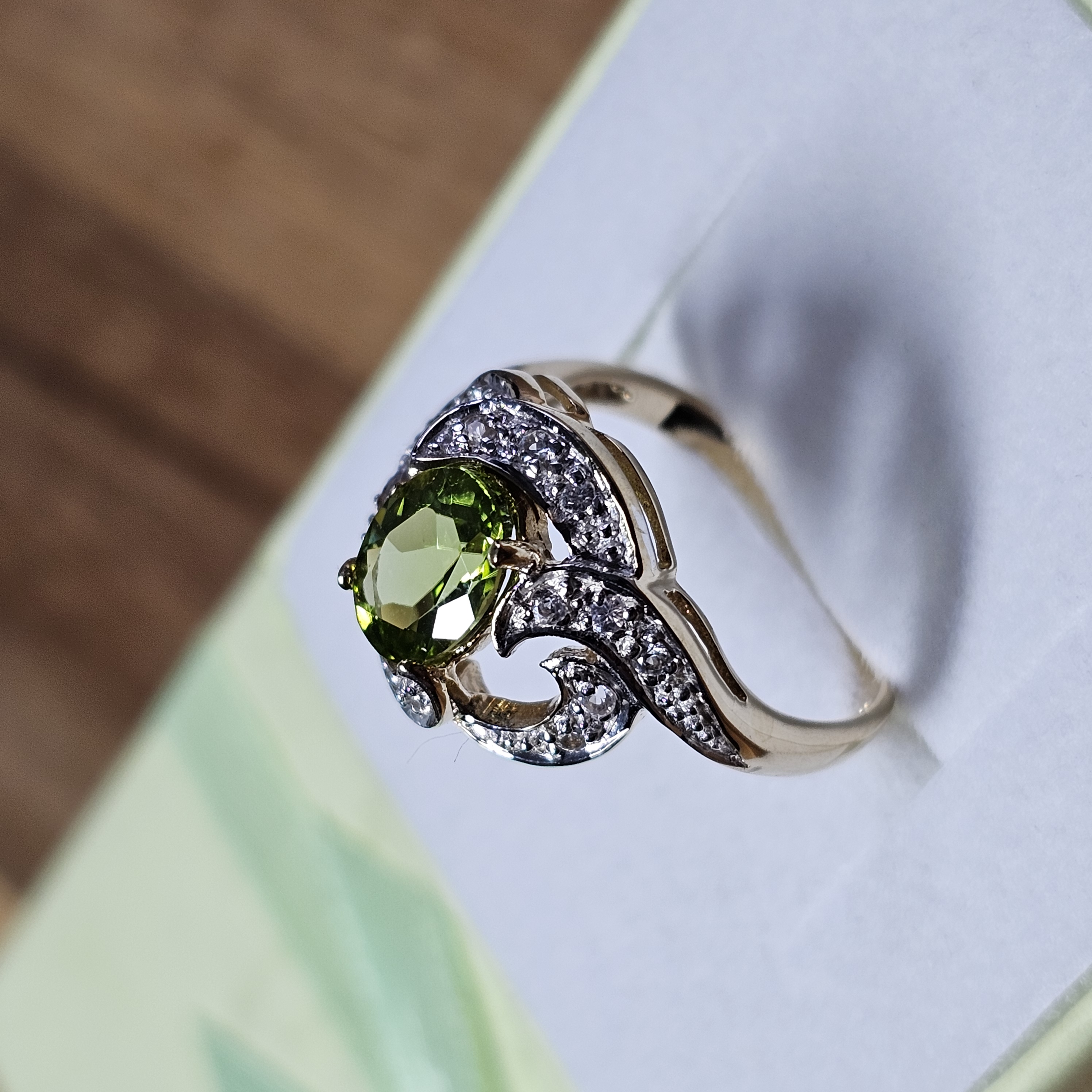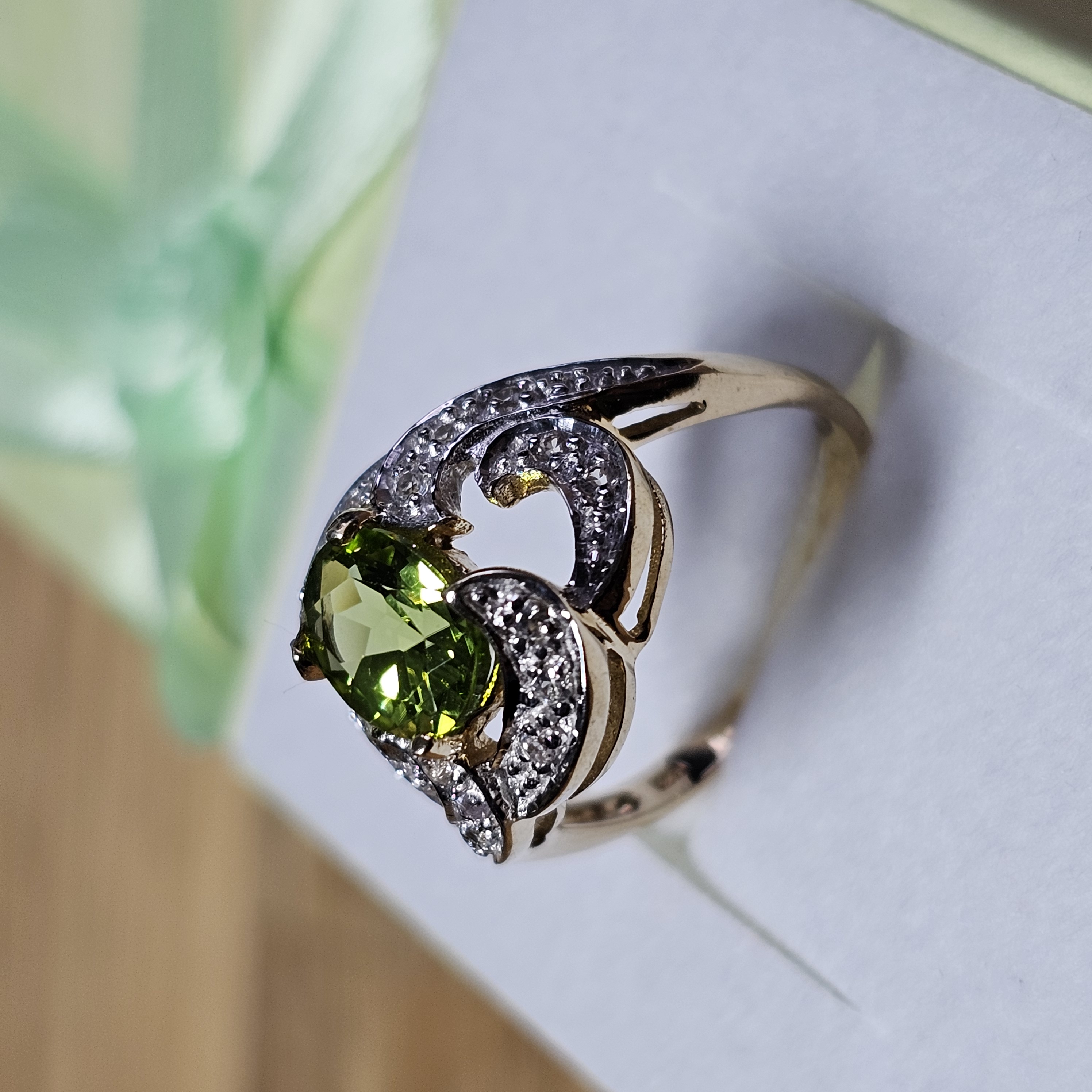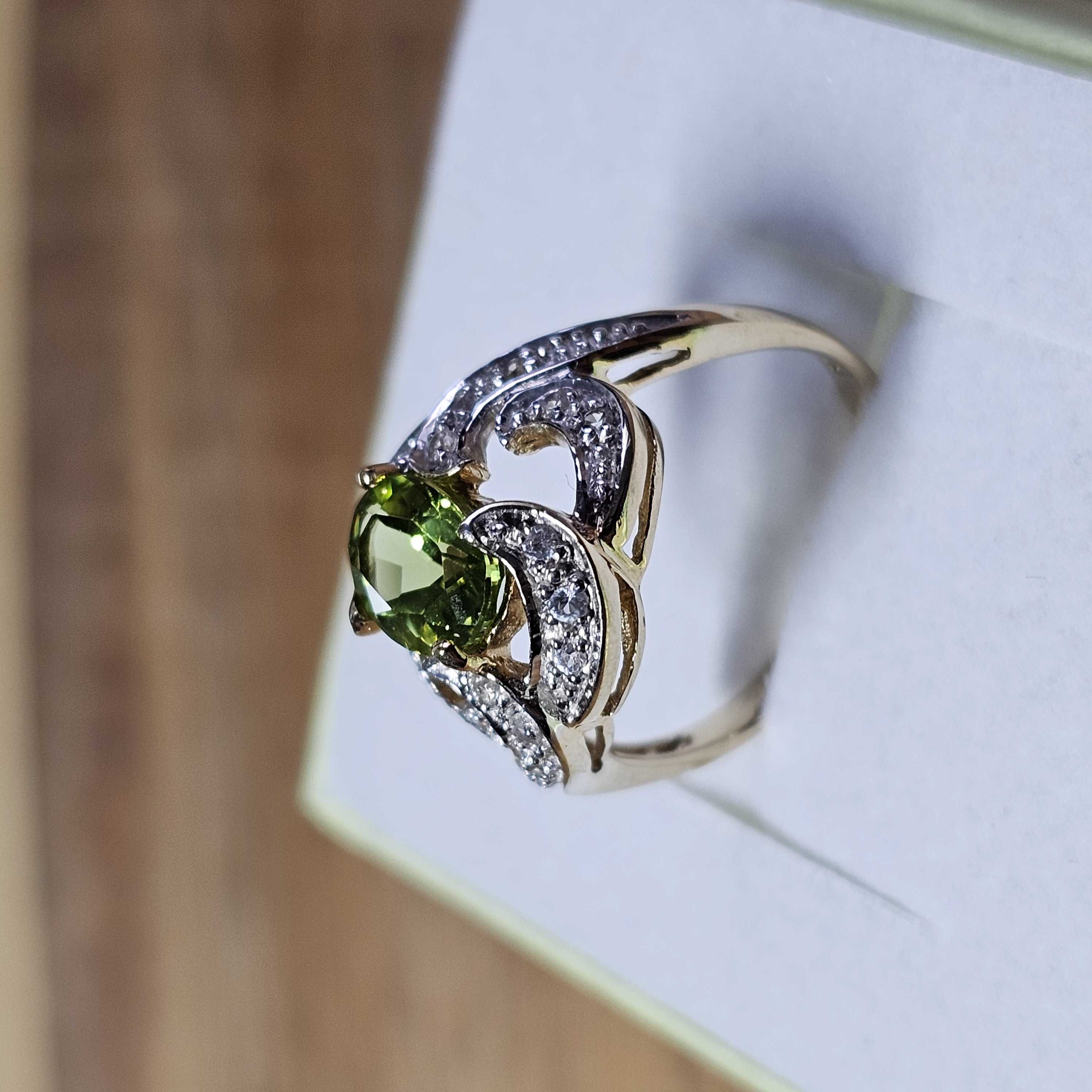 Eleganter Goldring aus Gold 375. Auf dem traumhaft schön gestalteten Ringkopf sitzt ein Peridot. Der teilplatinierte Untergrund wird von klaren Topassteinchen geschmückt.
