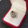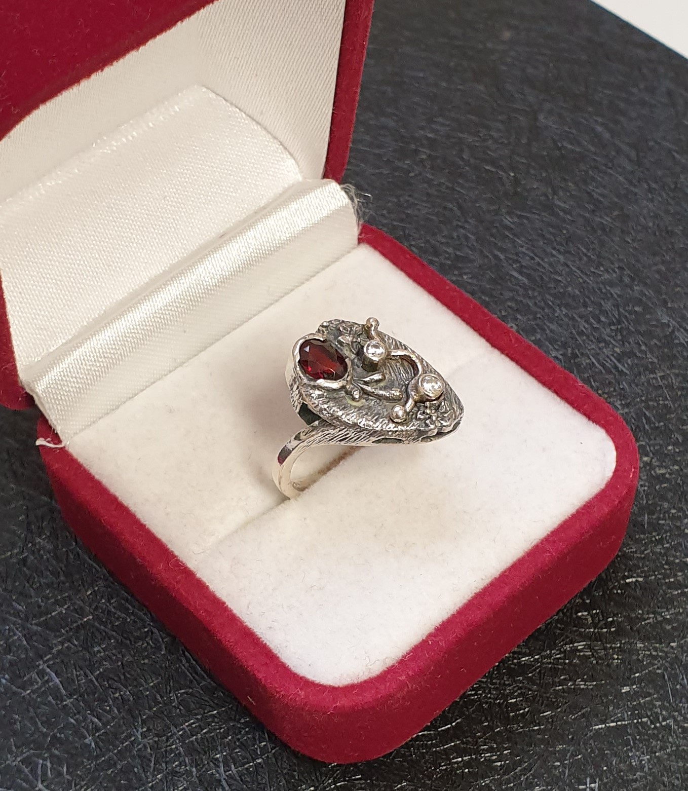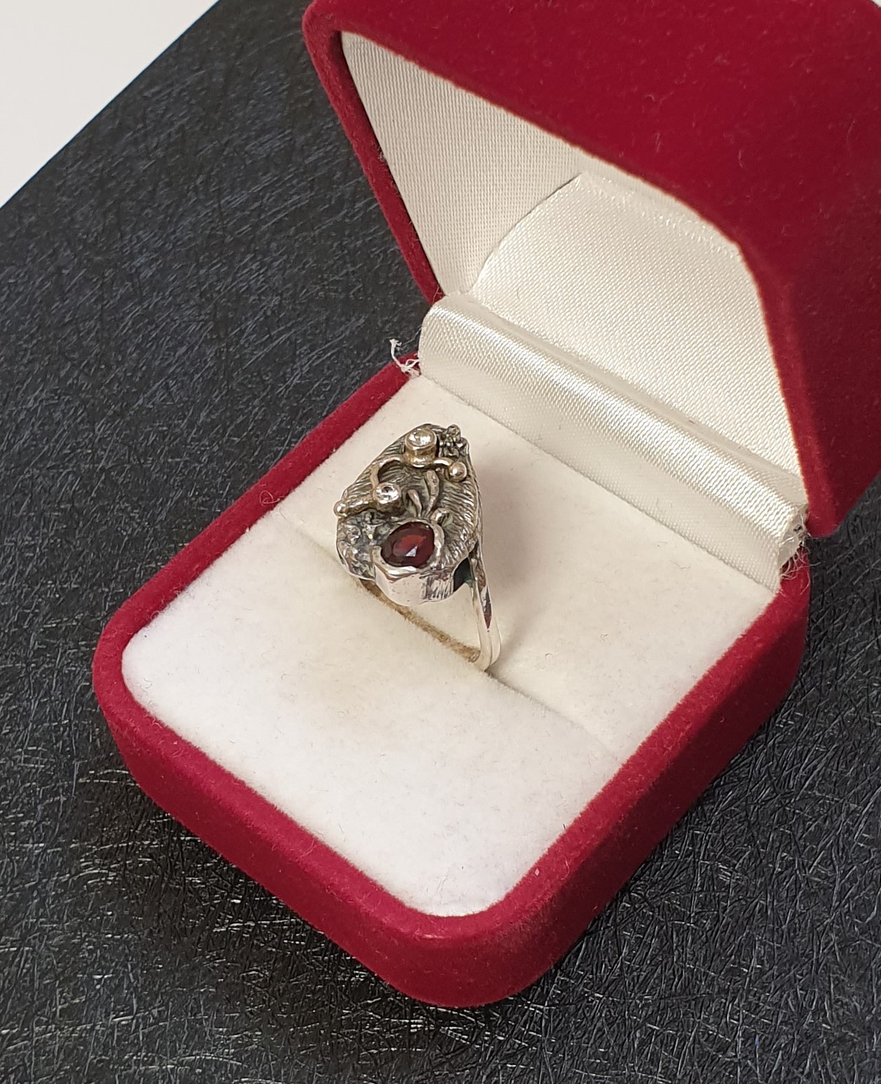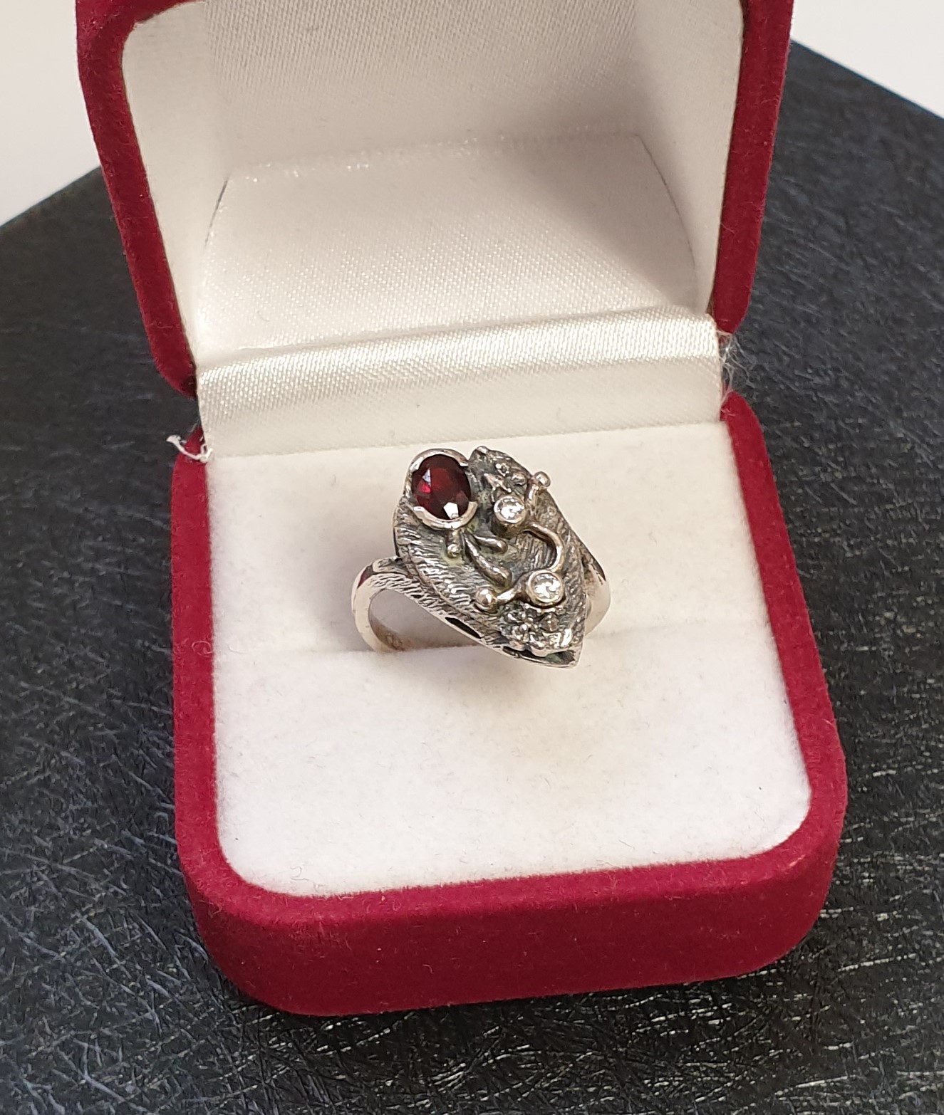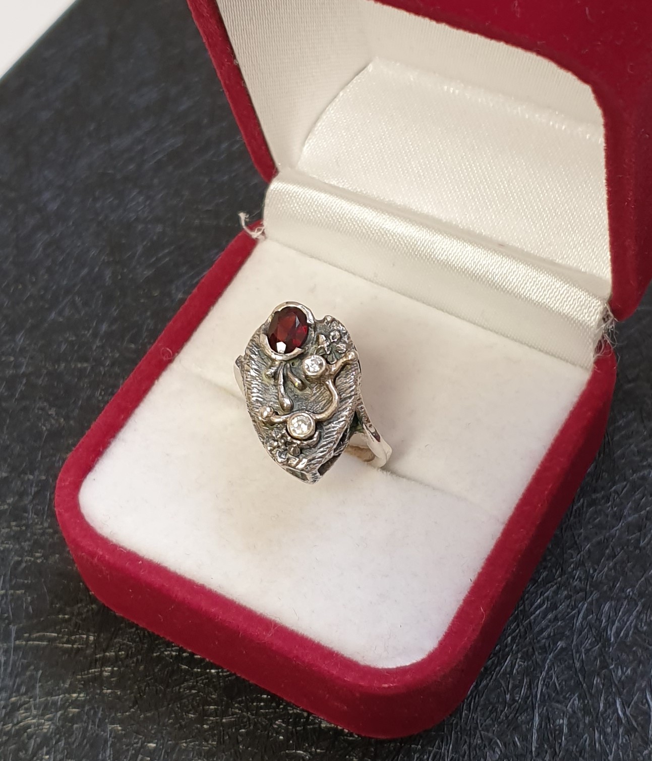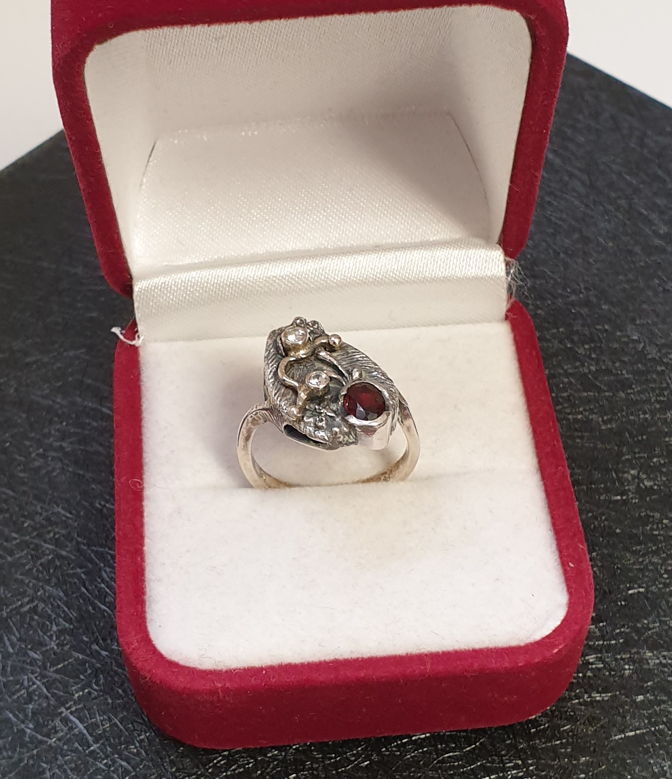 Nostalgischer Ring Silber 835. Aufwendig gestalteter Ringkopf, besetzt mit einem Granat und zwei klaren Kristallsteinchen.