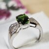 Weißgoldring mit einem schönen rechteckigen Turmalin im Farbton grün. Links und rechts sind auf dem Verlauf des Ringkopfes kleinste Diamantsteinchen gesetzt.