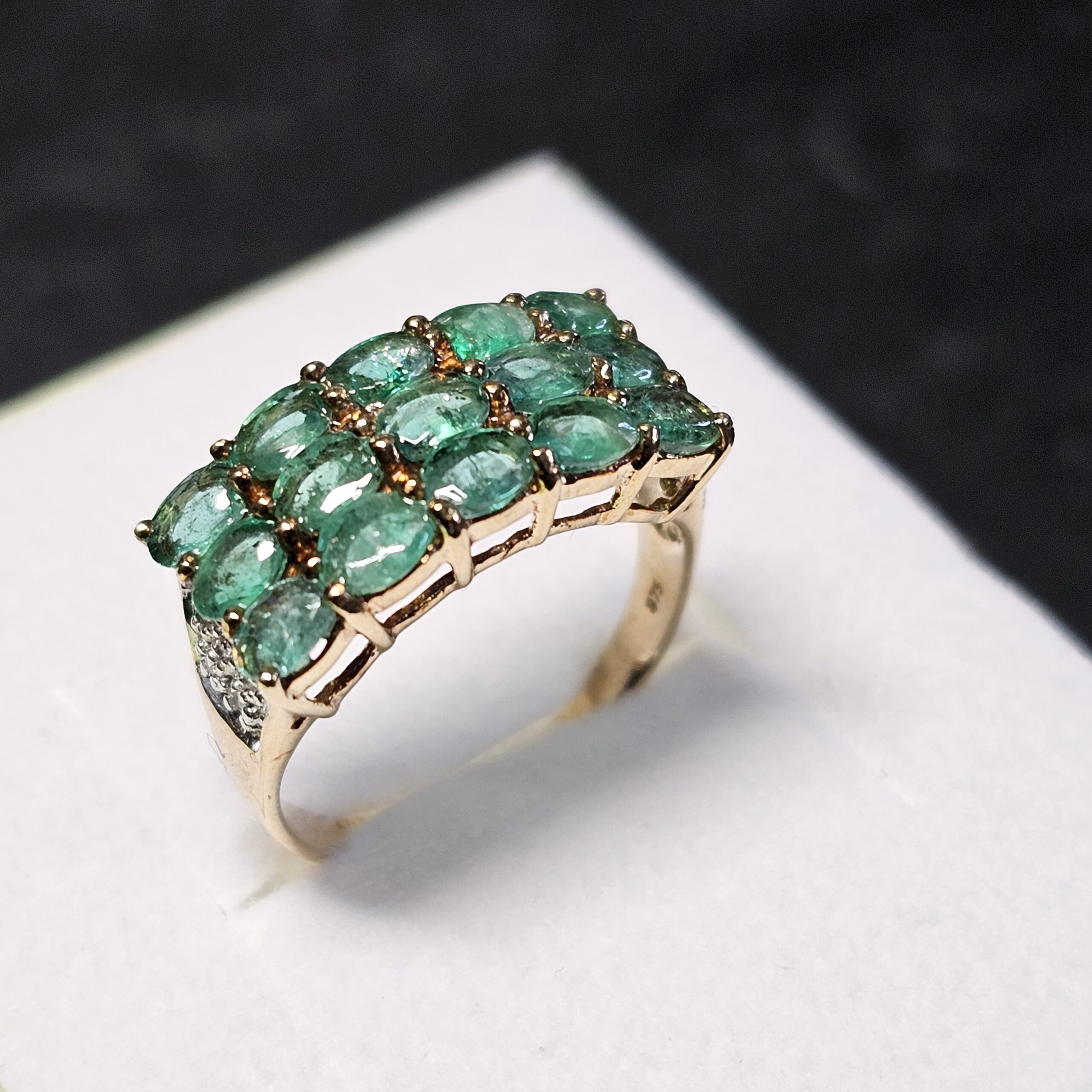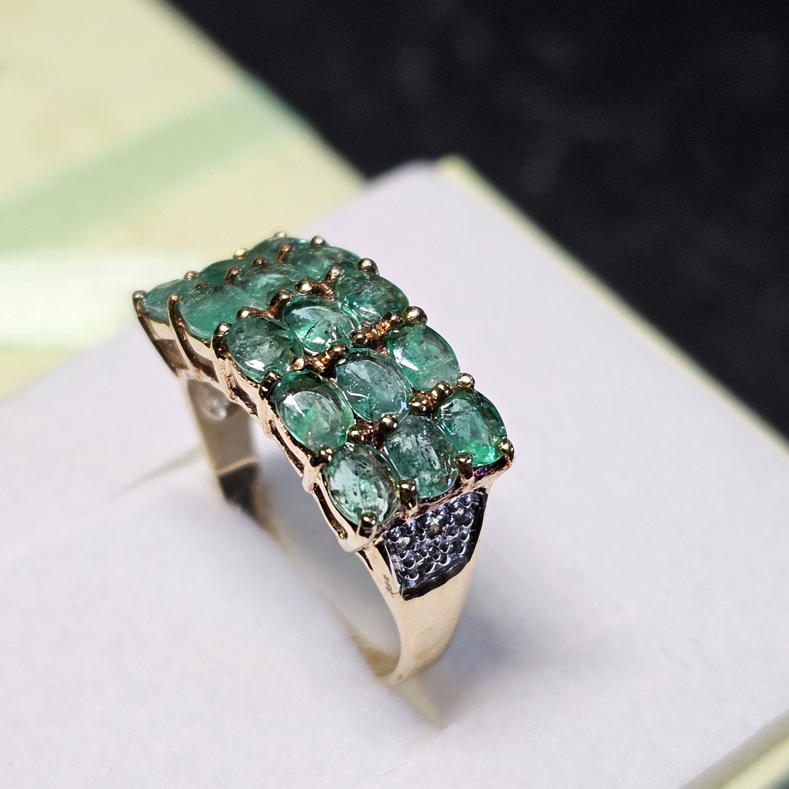 Toller nostalgischer Ring Gold 375, geschmückt mit wunderschönen Smaragd-Steinchen. Der Ringkopf ist links und rechts oberhalb der Ringschiene teilplatiniert und je mit 5 Stck. kleinen klaren Kristallsteinchen besetzt.