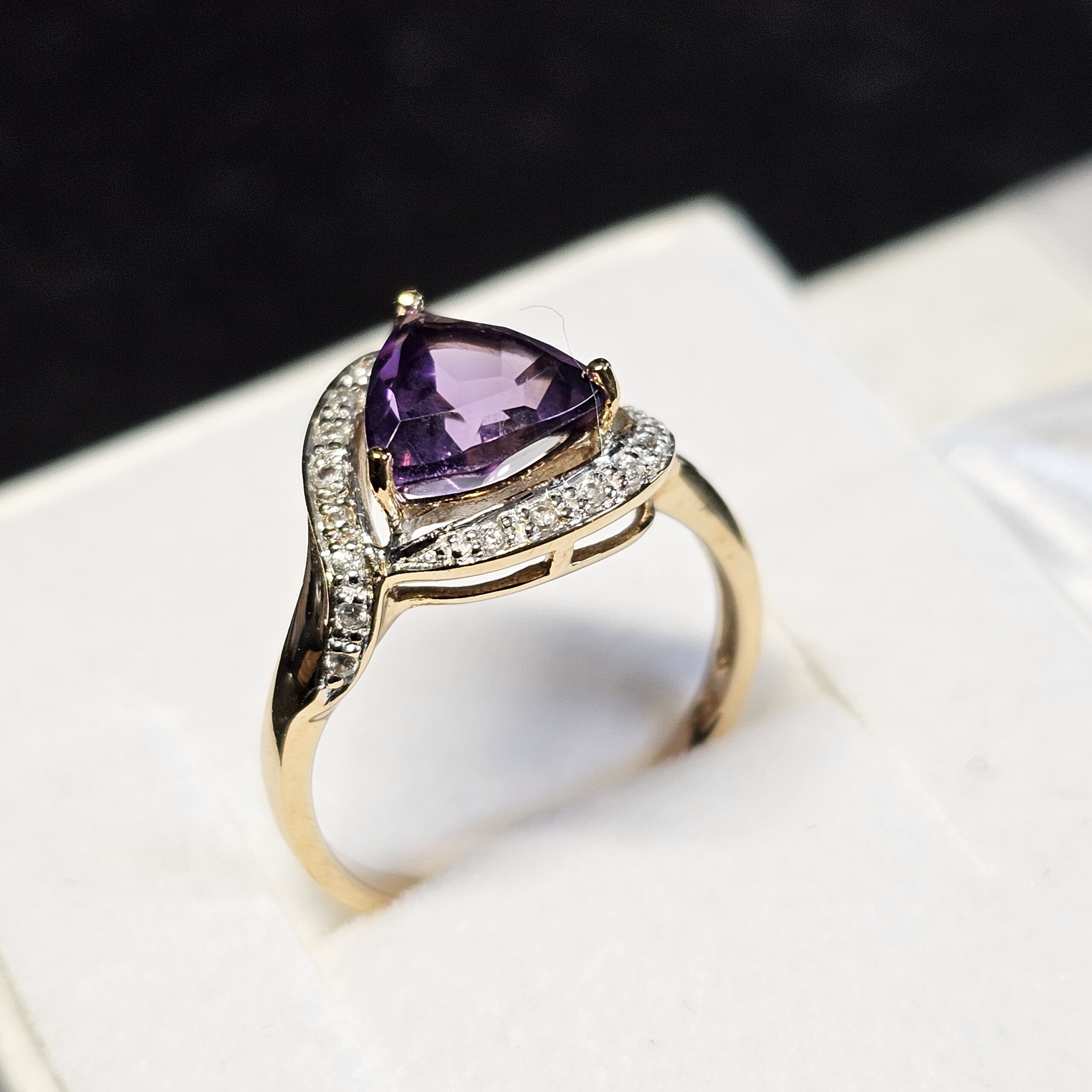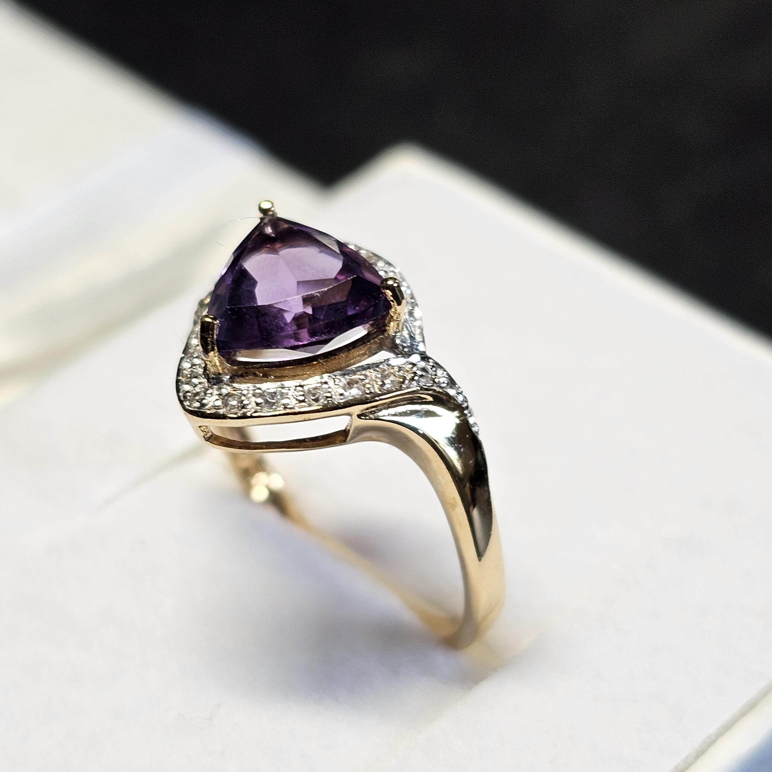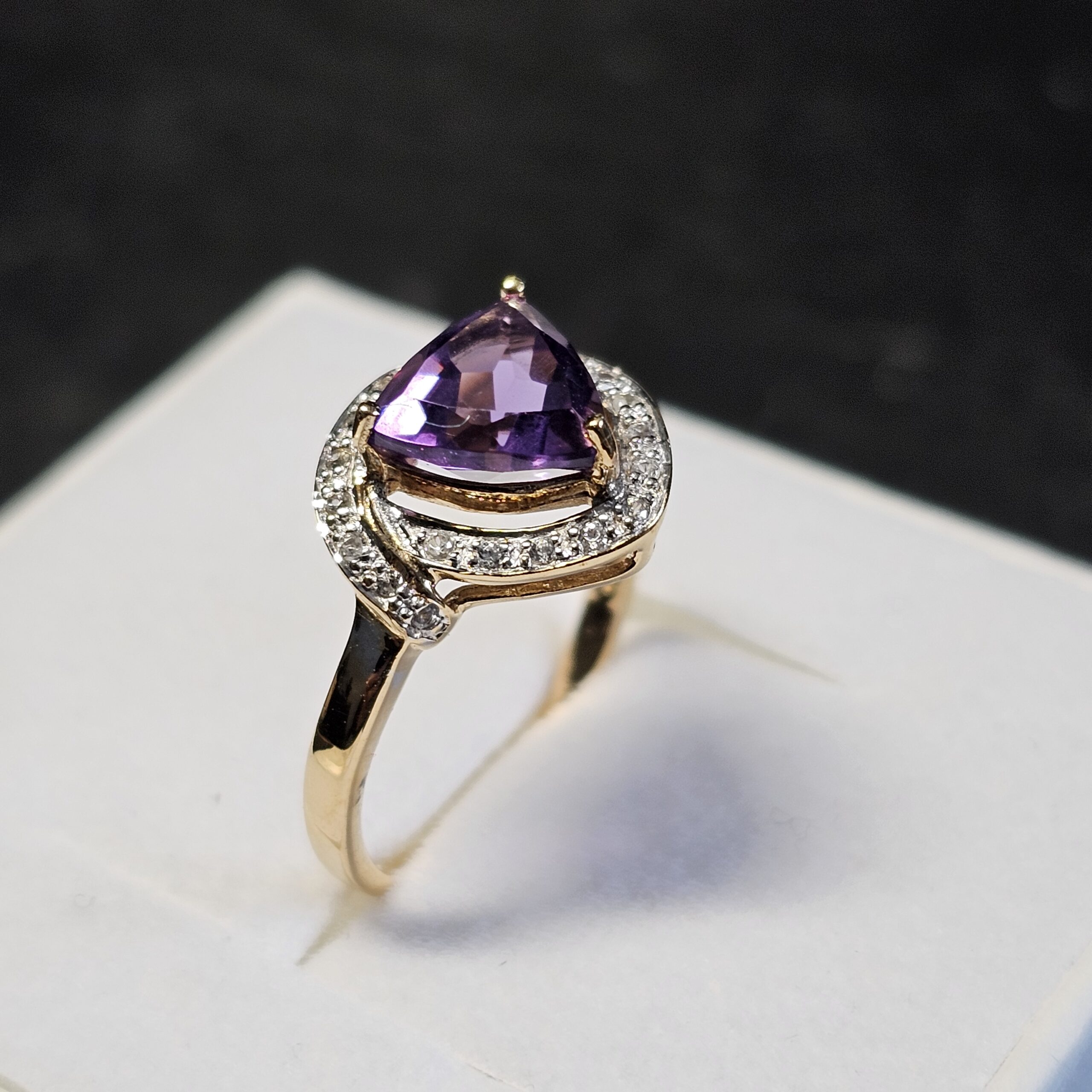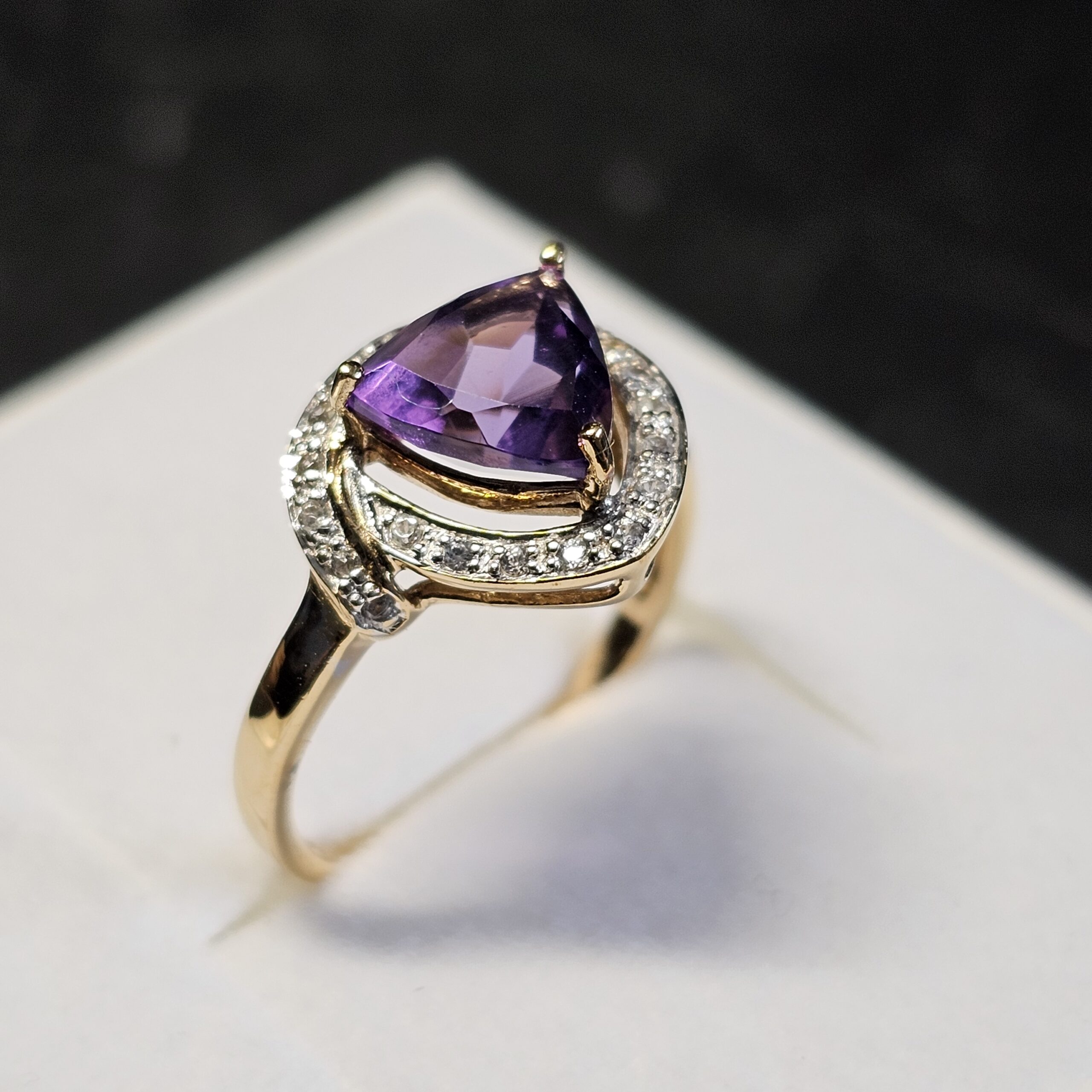 Toller Goldring Gold 375. Der nostalgische Ring ist mit einem Amethyst und vielen klaren Kristallsteinchen auf teilplatinierter Oberfläche verziert.