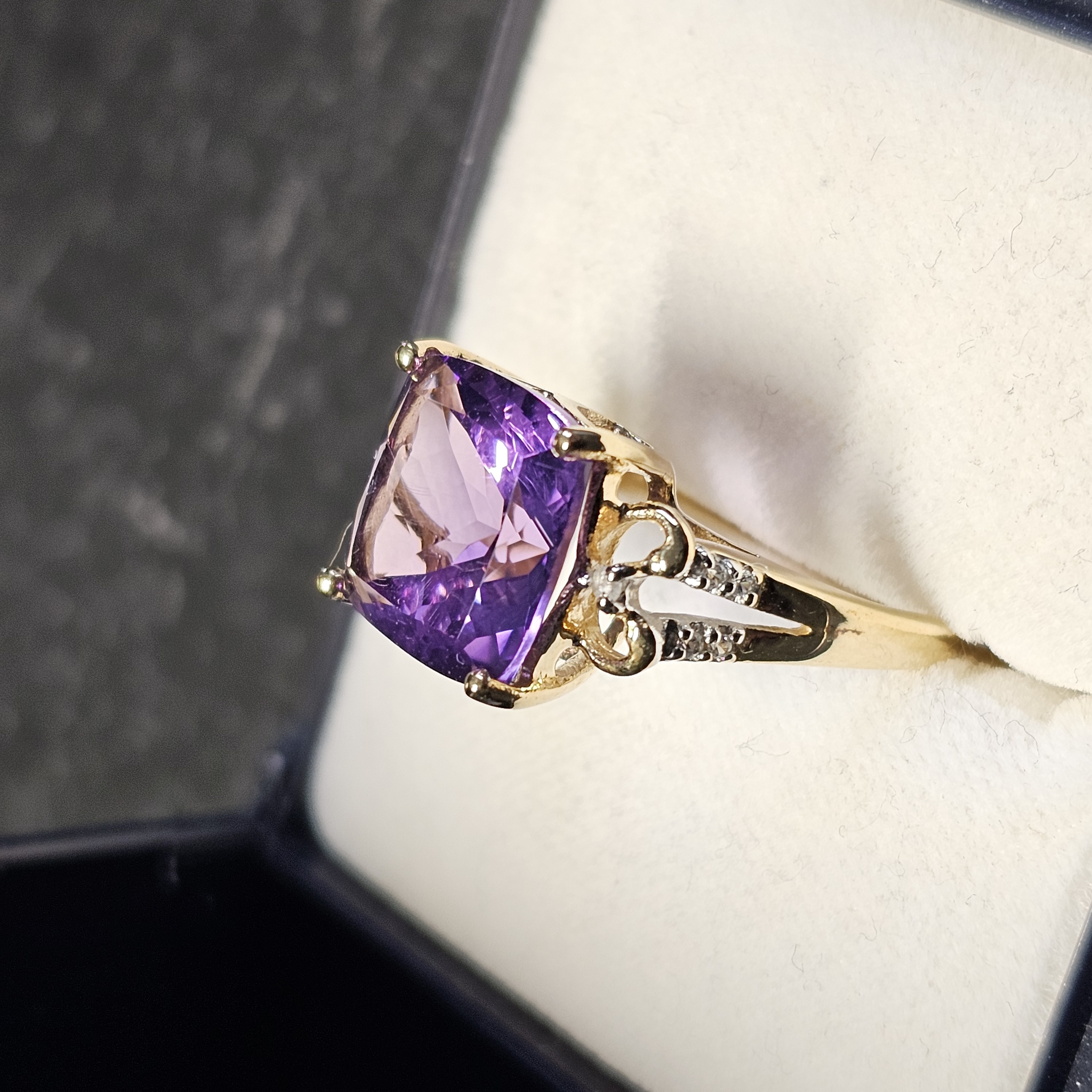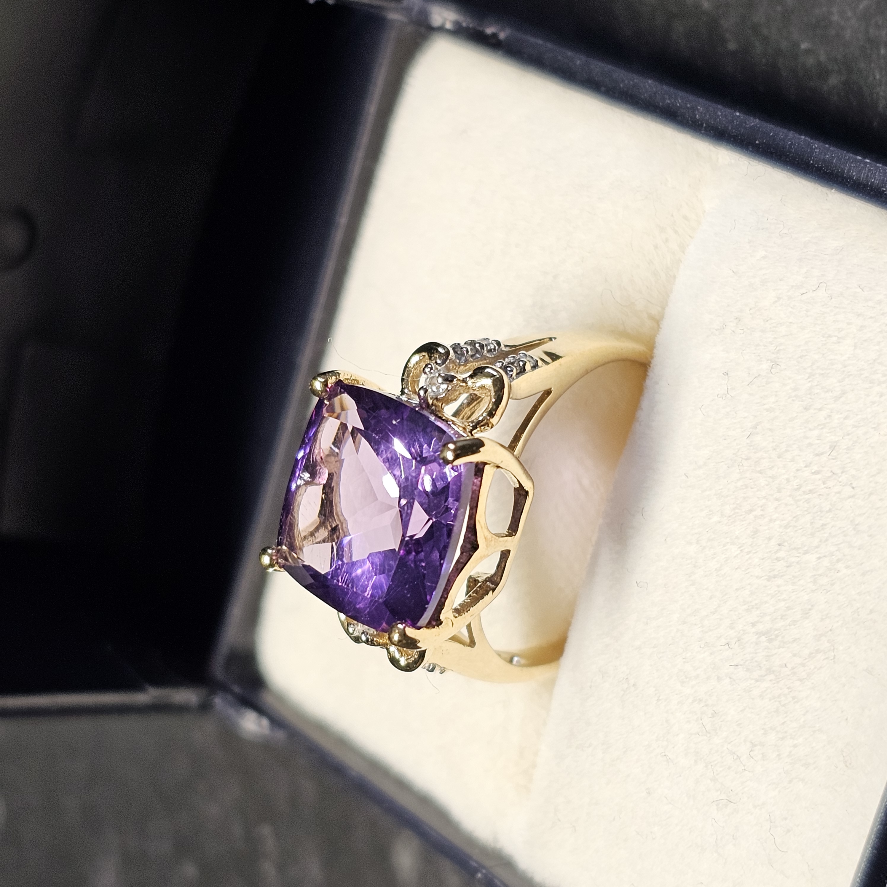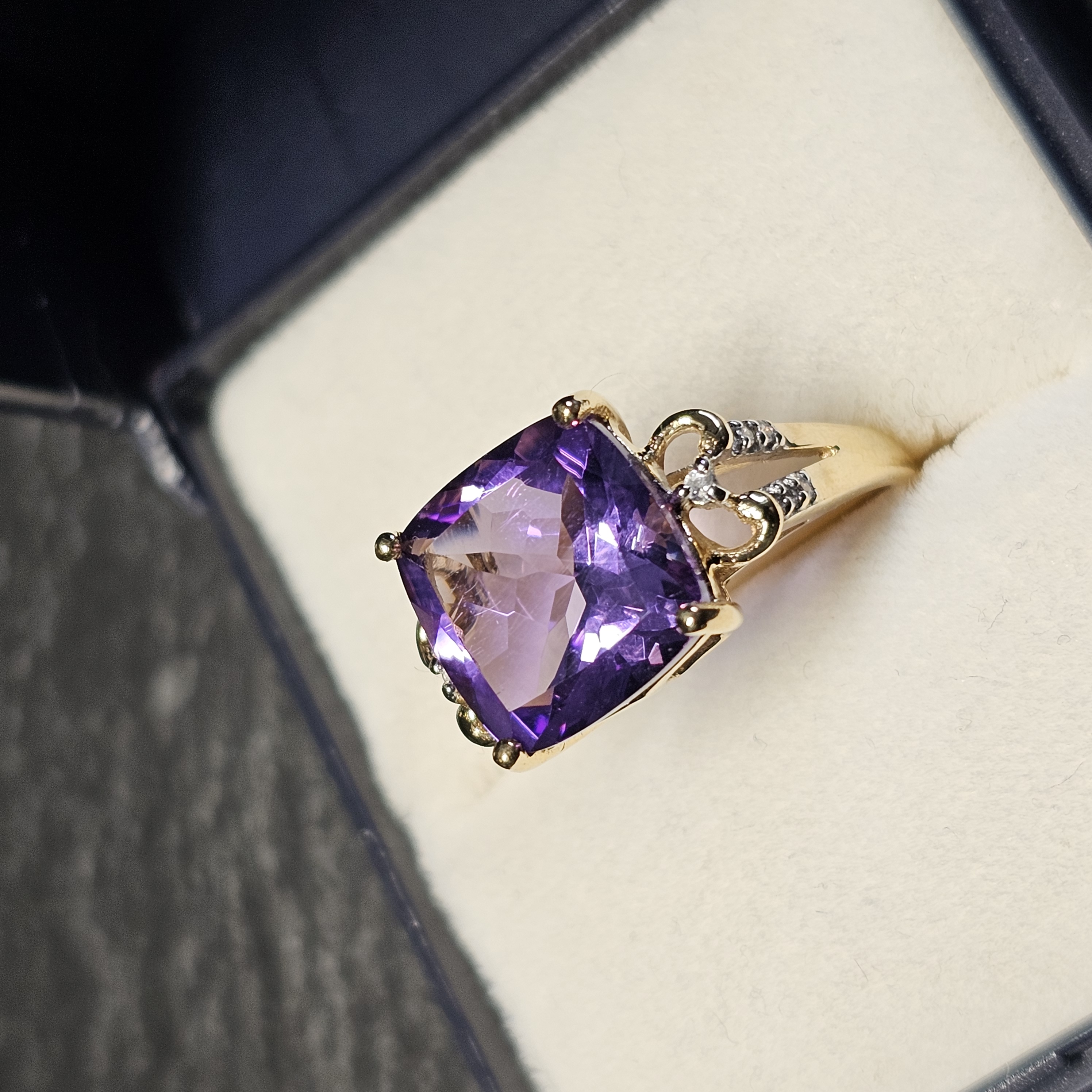 Toller nostalgischer Goldring Gold 375. Der hübsche Ring ist mit einem Amethyst mittig besetzt. Links und rechts neben dem Amethyst sitzt je ein kleines klares Kristallsteinchen nach oben schauend gesetzt. Auf teilplatinierter Oberfläche sitzen oben an der zweireihig verlaufenden Ringschiene auf jeder Schienenseite insgesamt 4 Stck. kleine klare Kristallsteinchen auf teilplatinierter Oberfläche verziert.