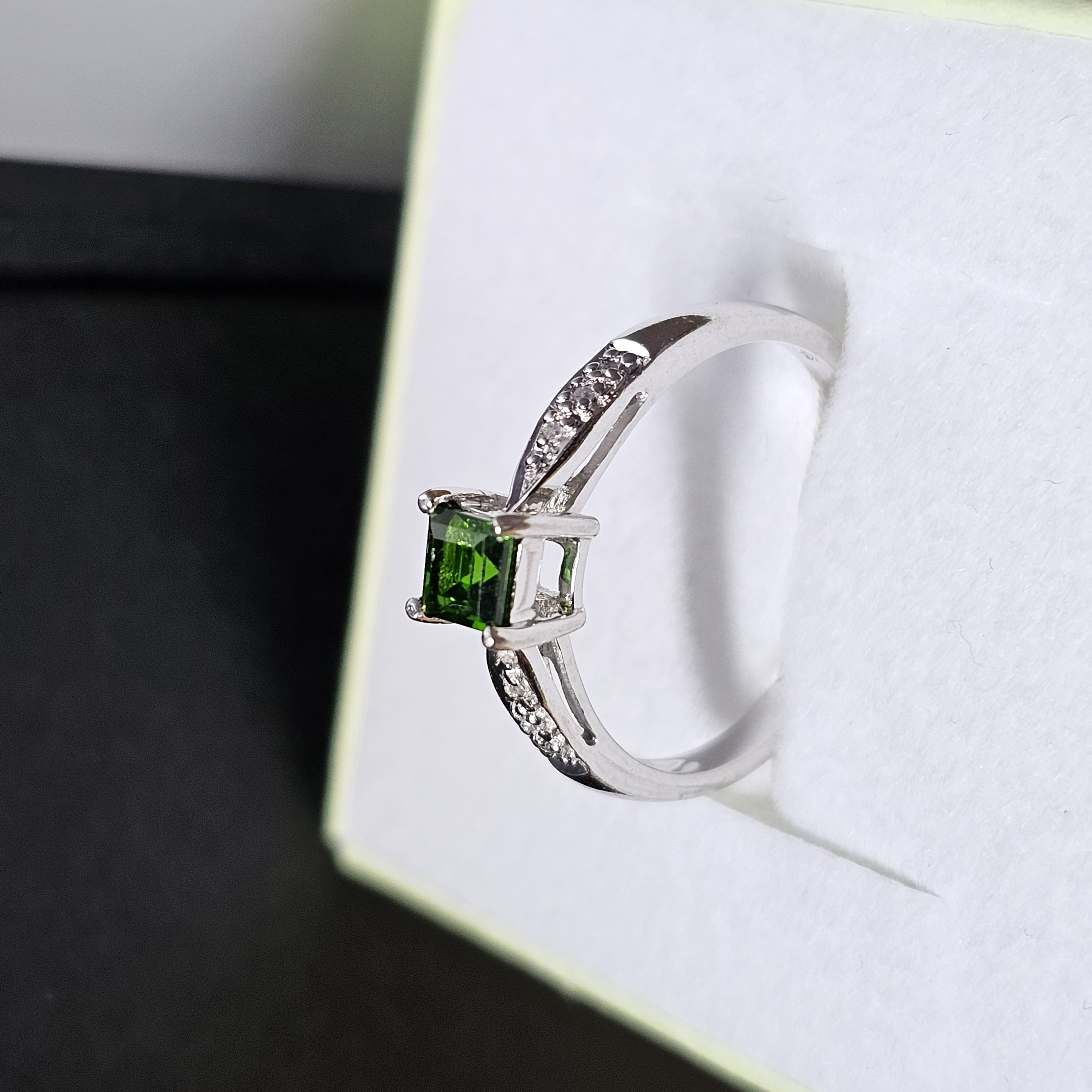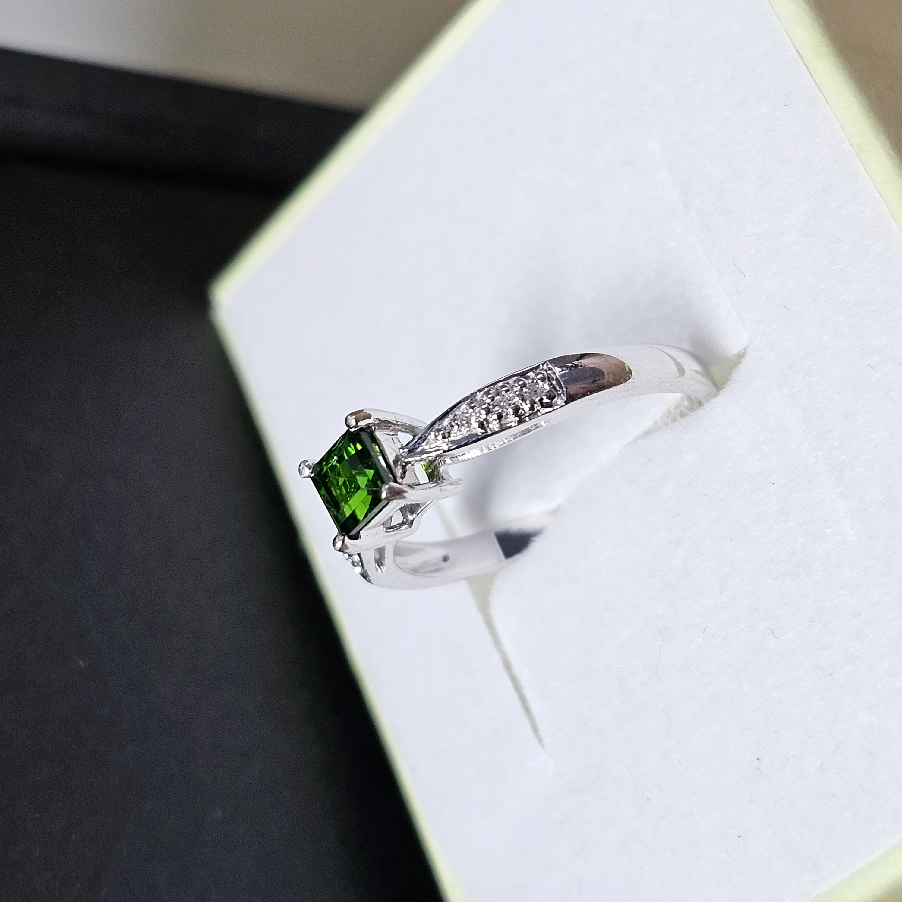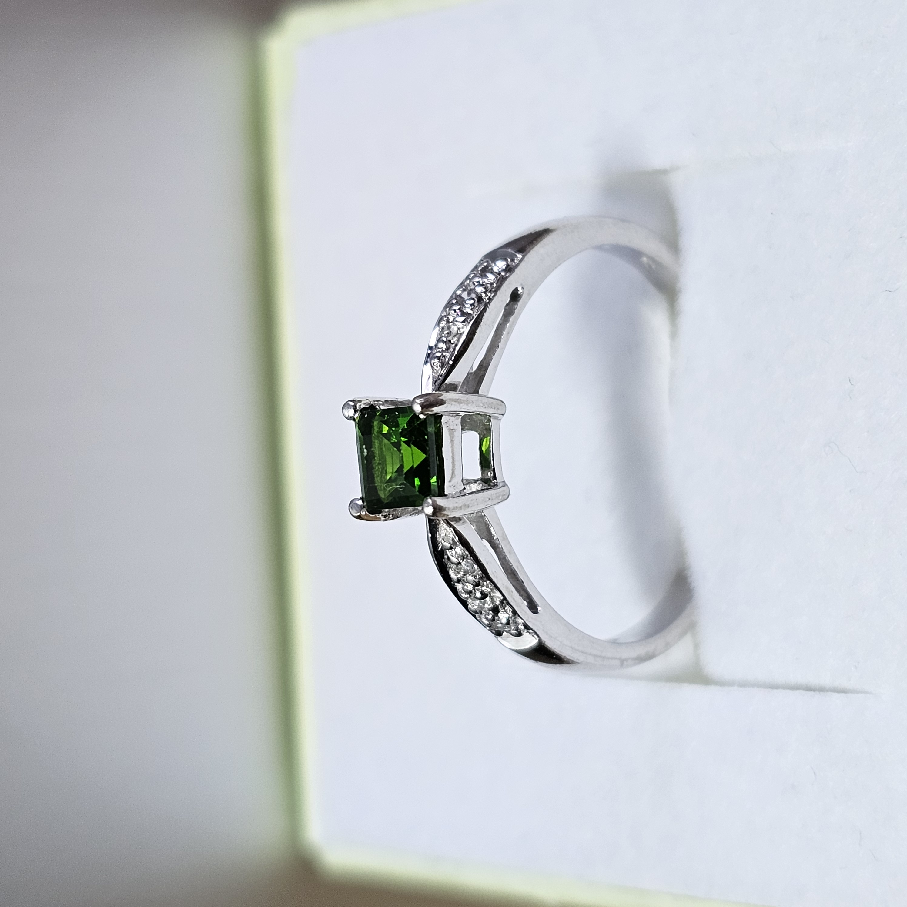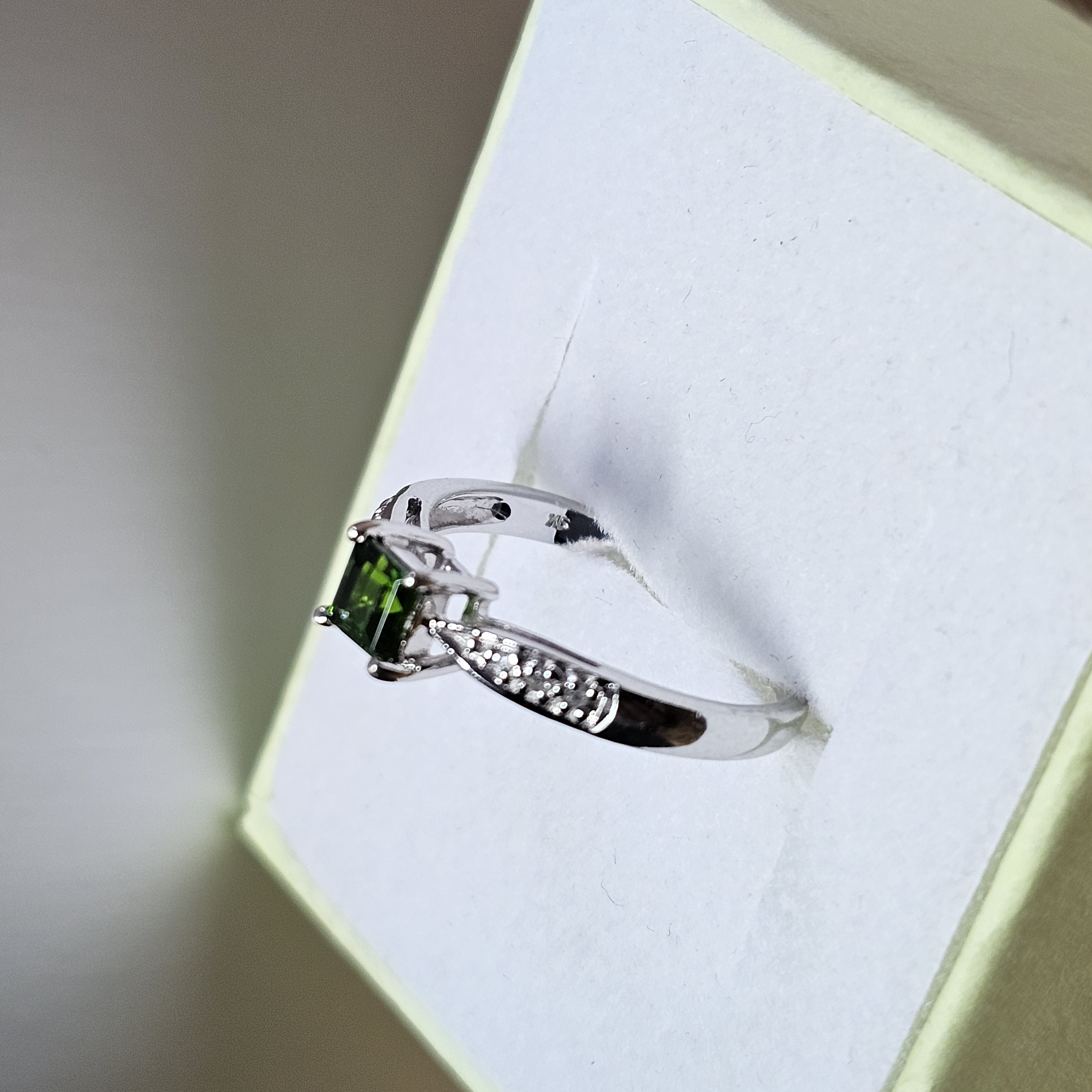 Edler Goldring aus Weißgold 375. Auf dem Ringkopf sitzt ein wunderschöner quadratischer Peridot.