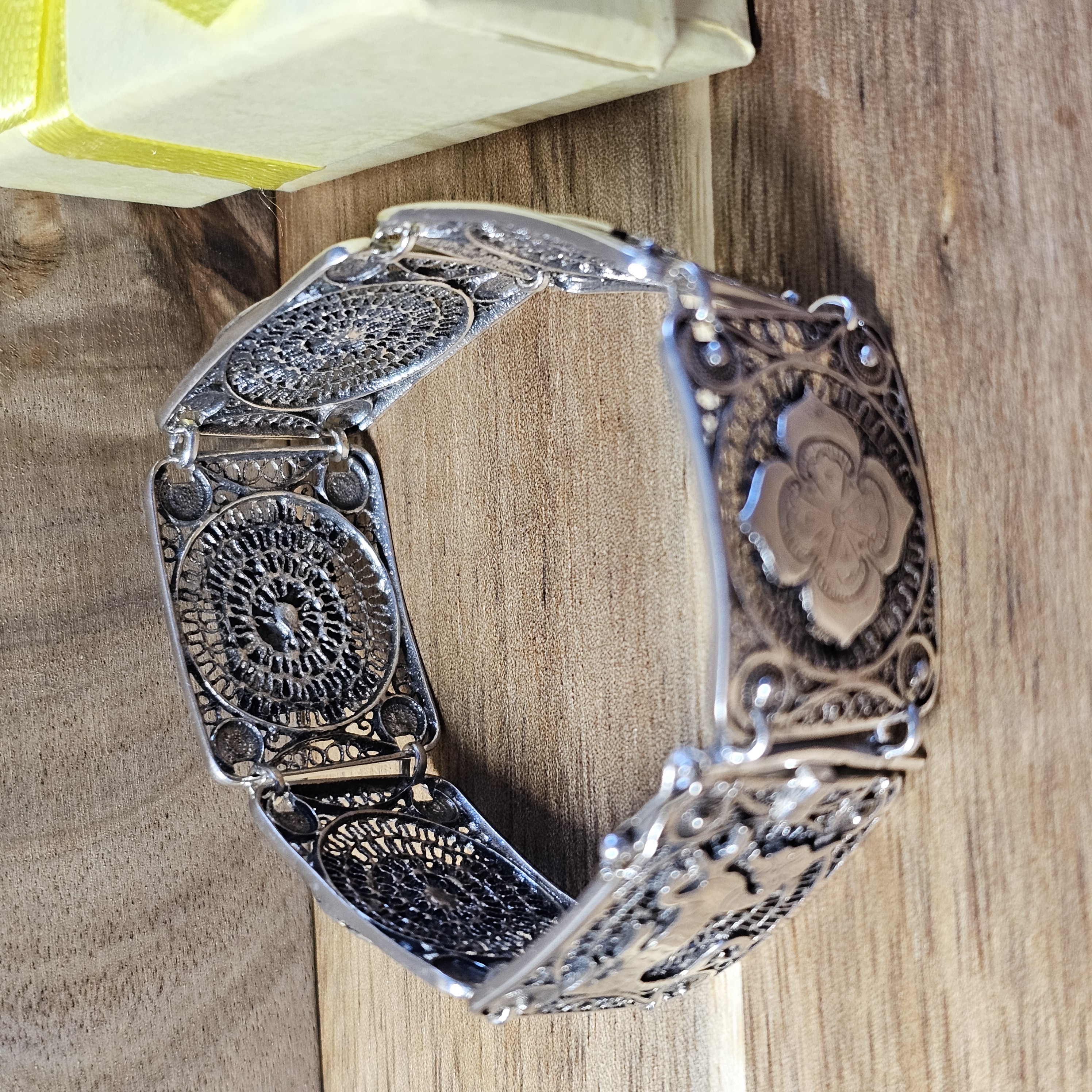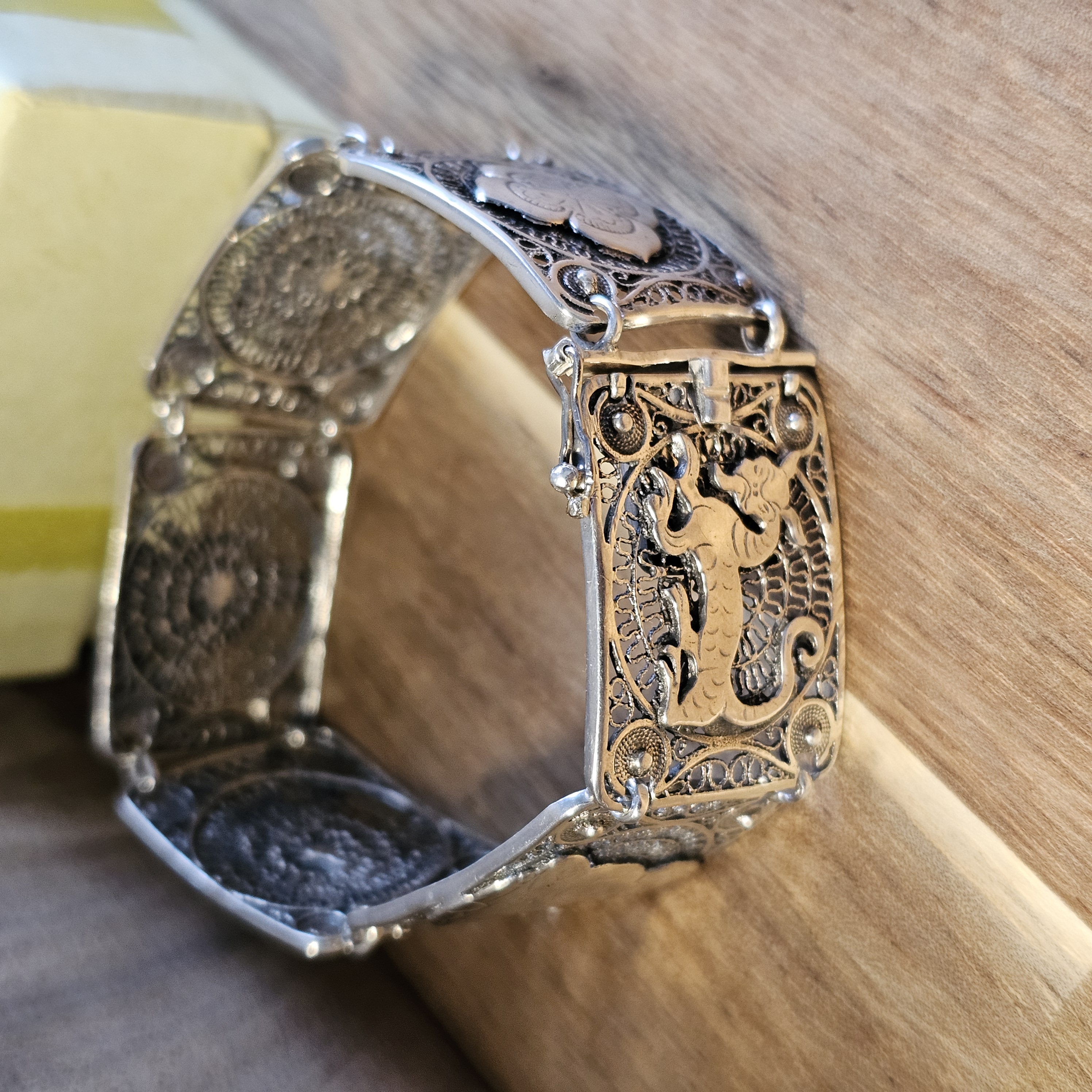 17,5 cm Art Deco Armband Gliederarmband filigran Silber Shabby Vintage Nostalgie asiatische Motive Drache Tempel Blüte selten rar SA525