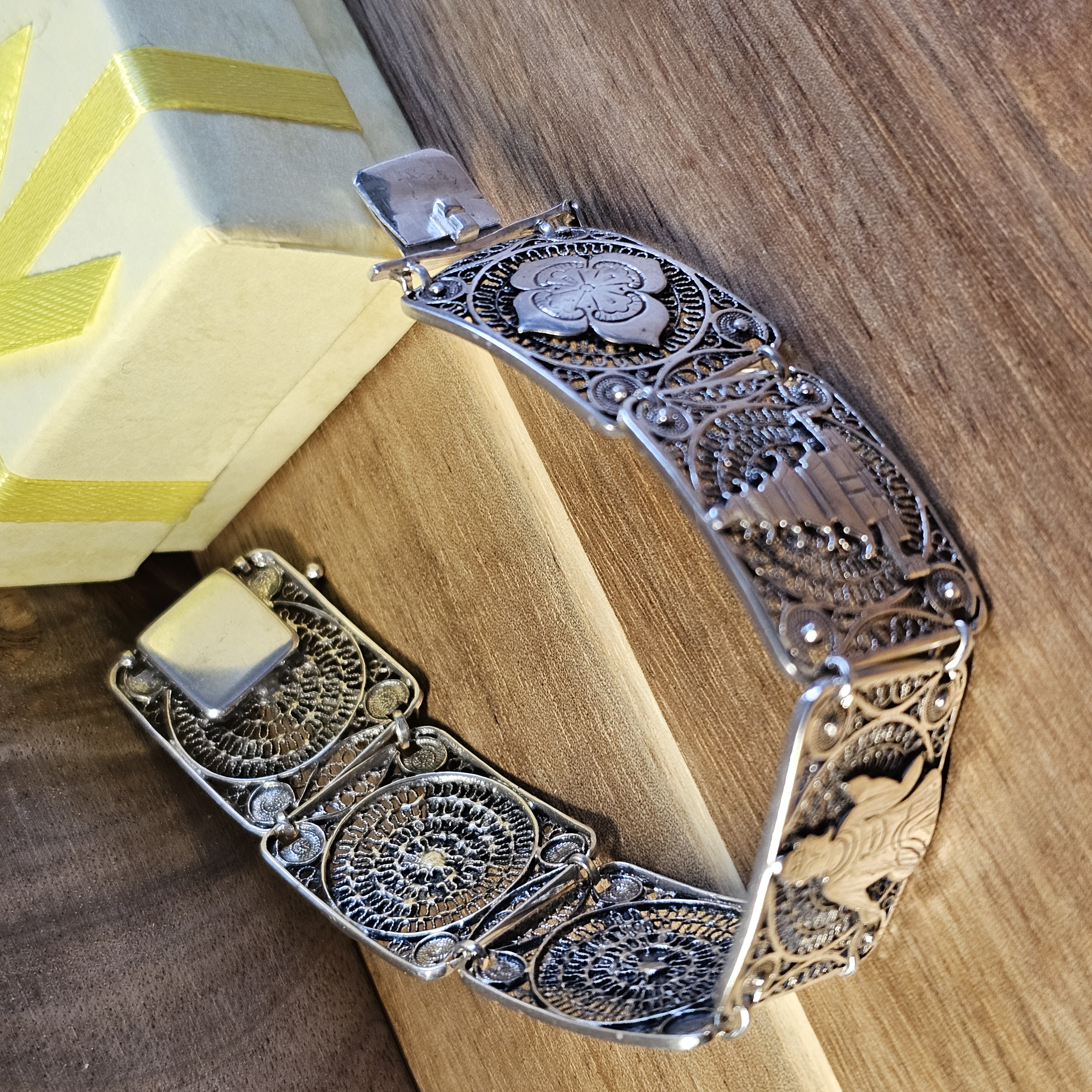 Art Deco Silberarmband Silber 835 (geprüft, nicht gepunzt) mit 6 Stck. wunderschön filigran ausgearbeiteten Gliedern mit asiatischen Motiven wie Drache, Tempel, Blüte… . Das schöne Stück verfügt über eine Steckschließe mit einem Sicherheitsverschluss.