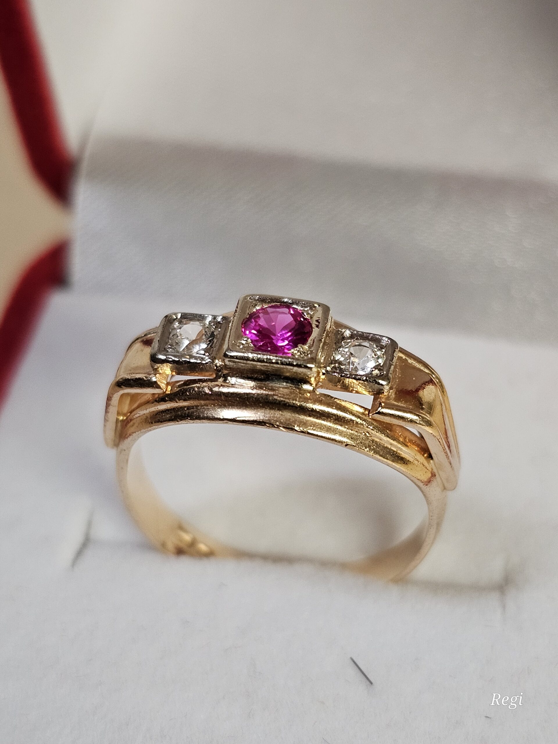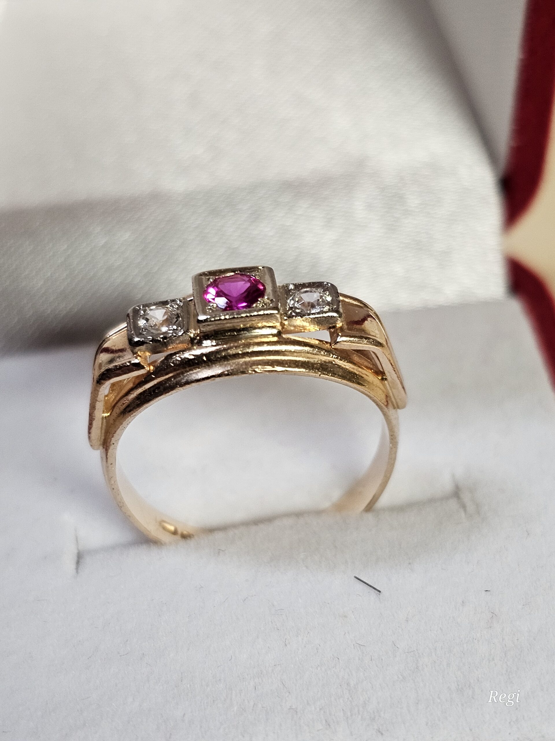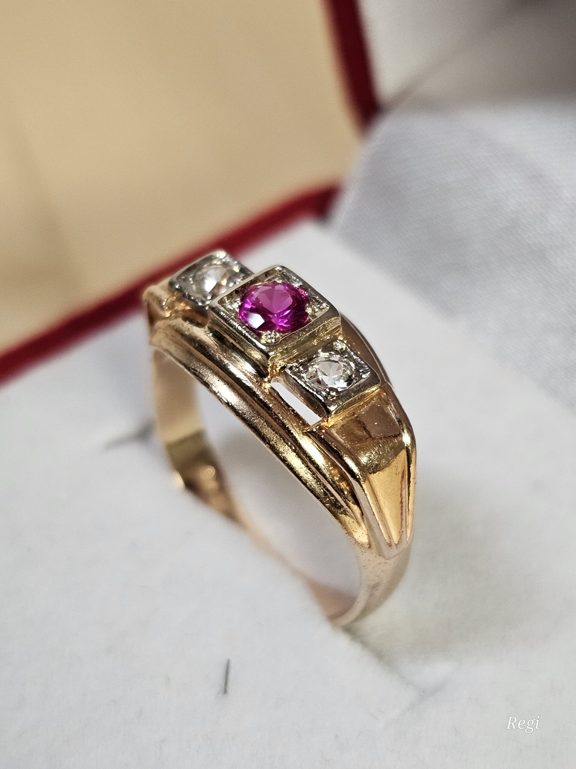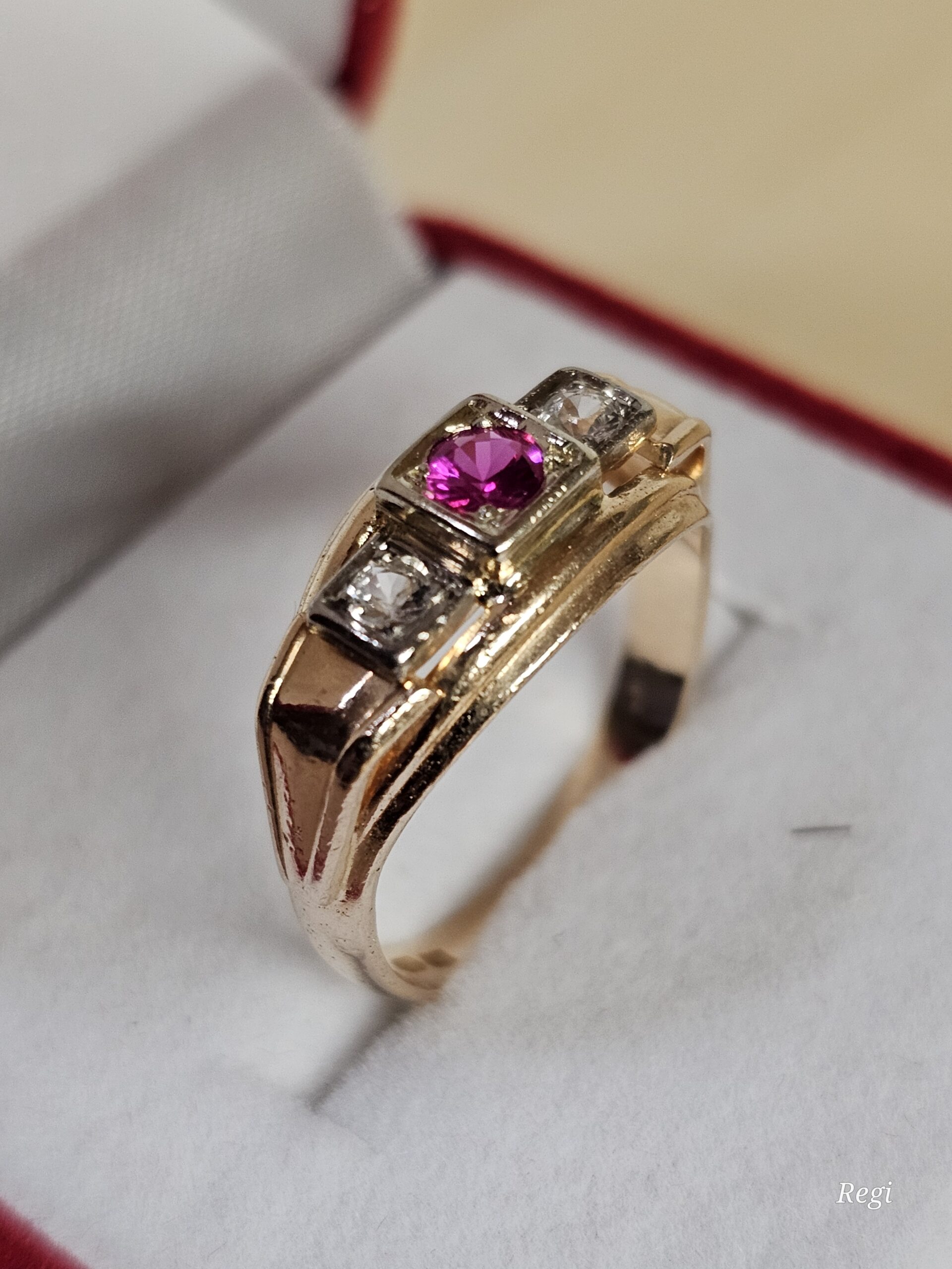 Der Ringkopf trägt einen Rubin und je zwei klare Kristallsteinchen.