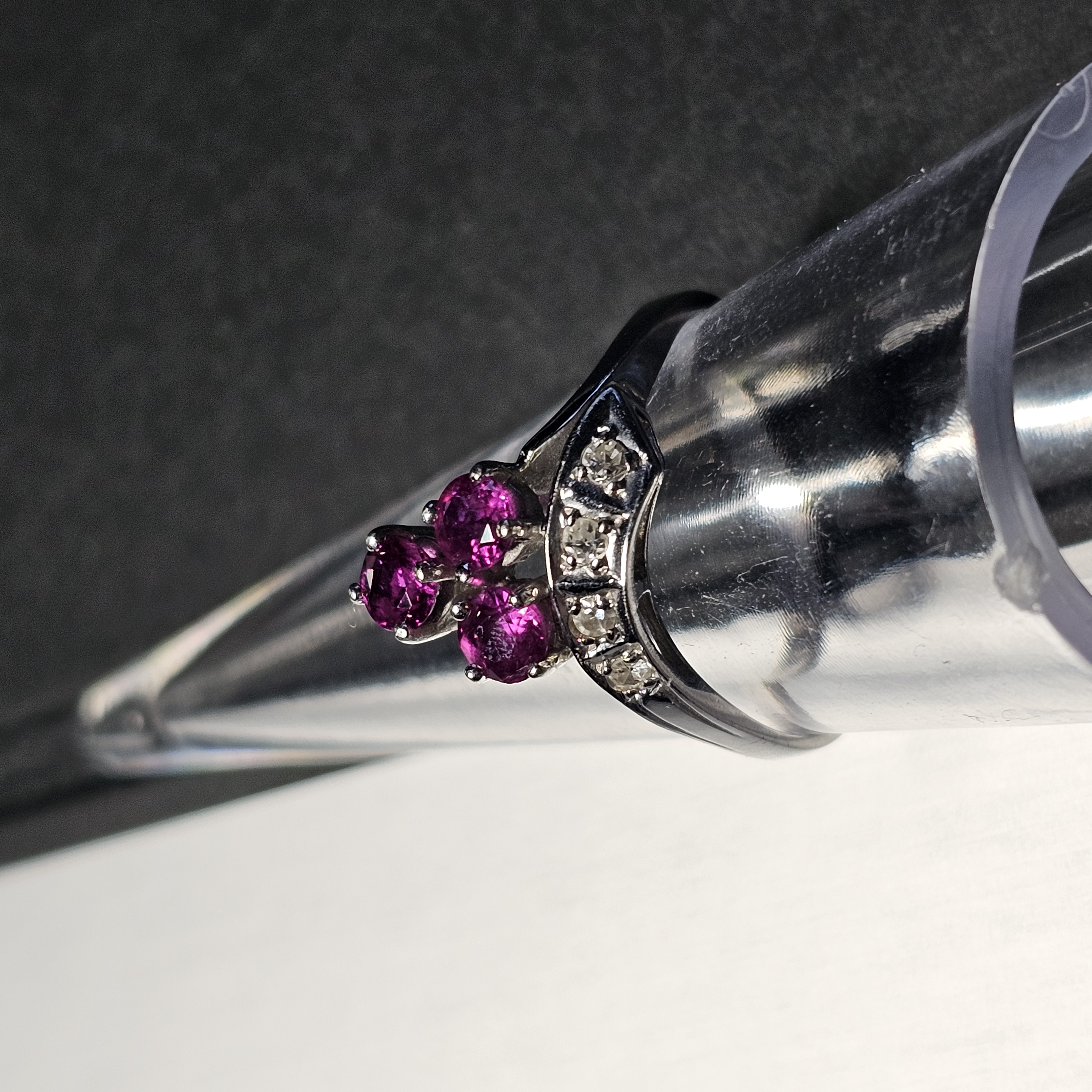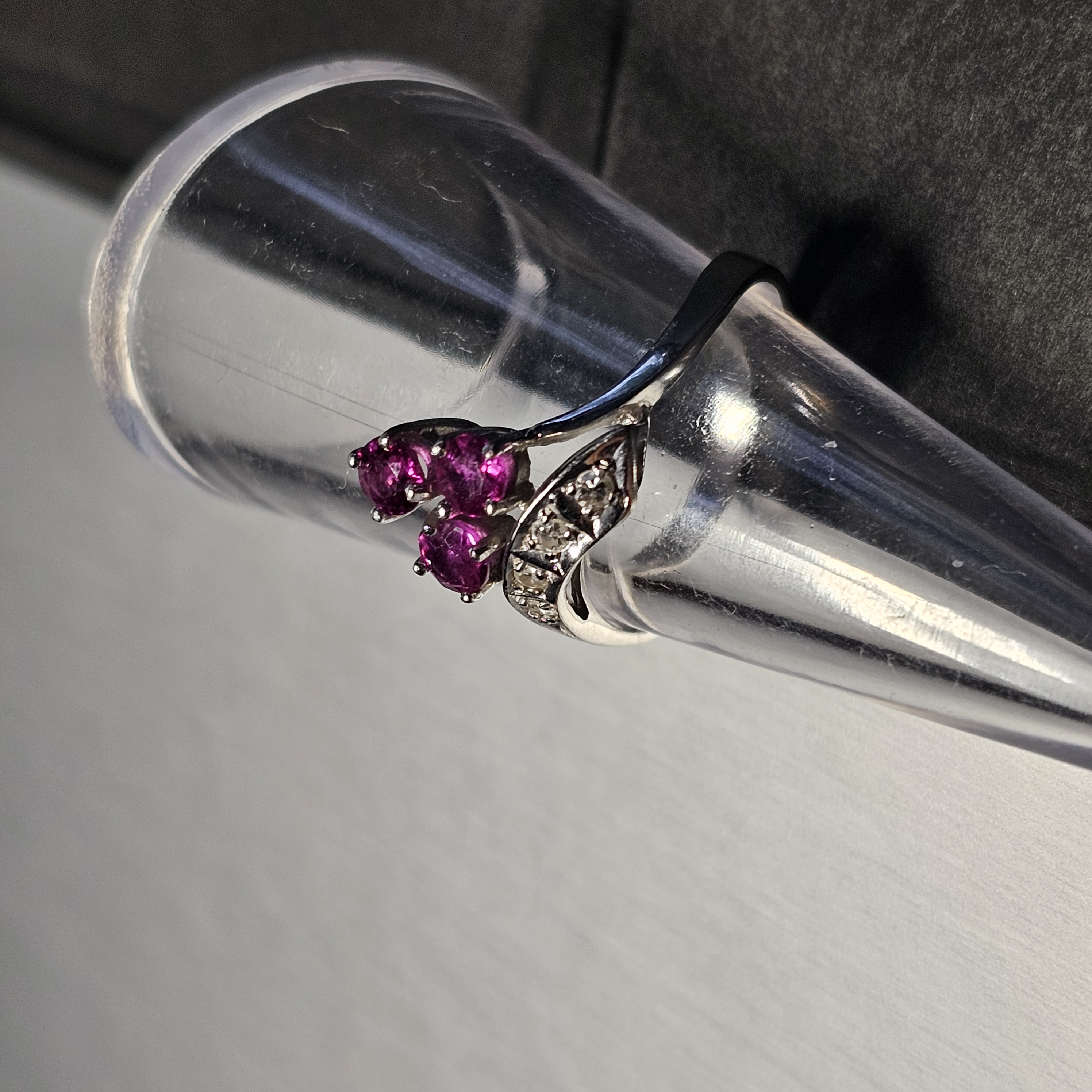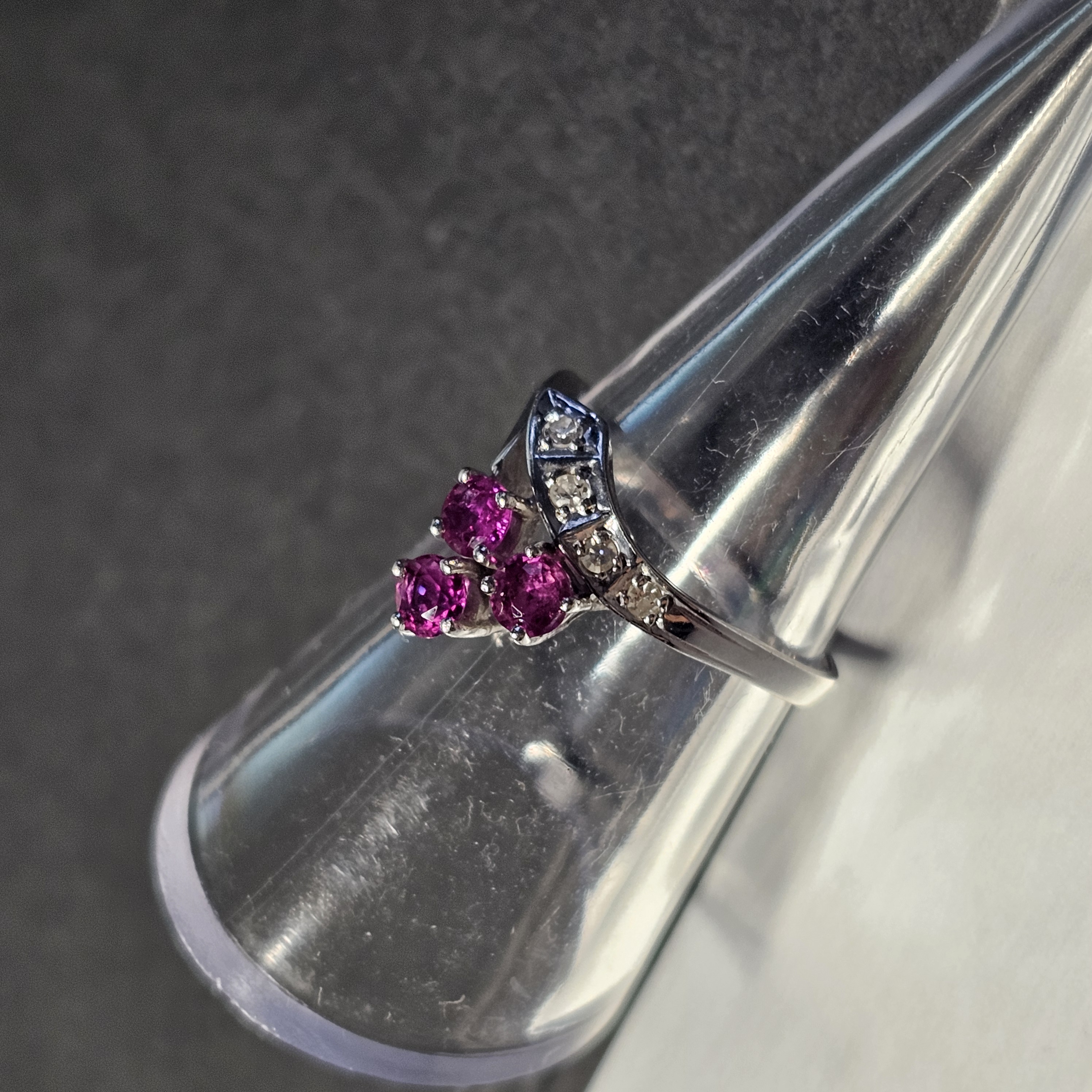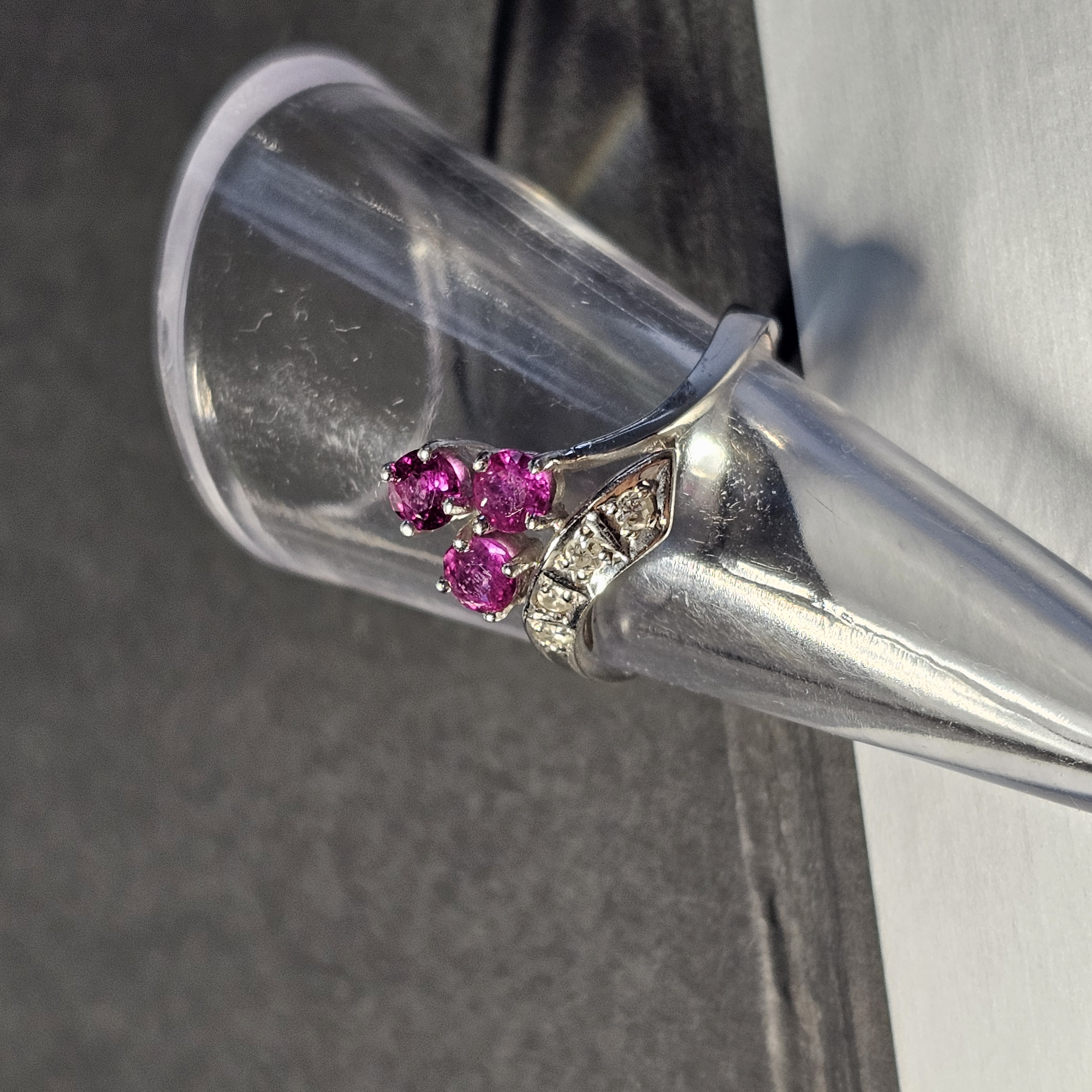 Wunderschöner Ring aus 585 Weißgold. Ein traumhaftes Vintage-Schmuckstück mittig sitzen 3 Stck. Rubine und seitlich sind in einer Reihe 4 Stck. kleine Diamanten gesetzt. Das Design ähnelt einer Wickeloptik.