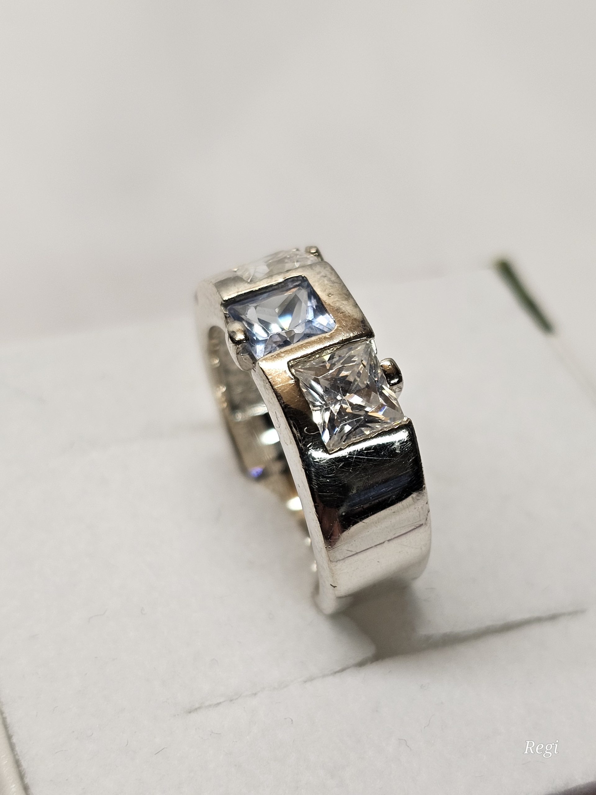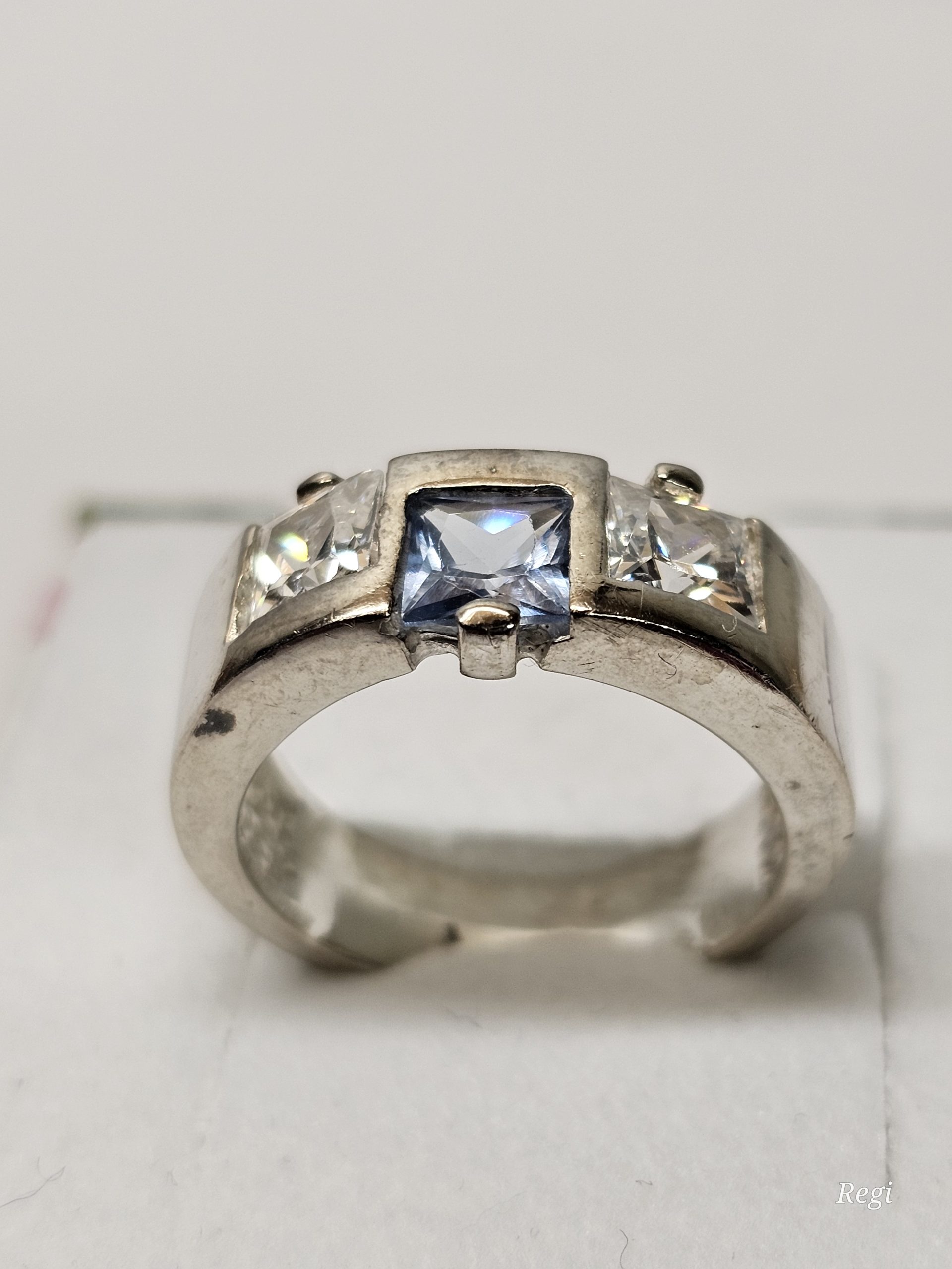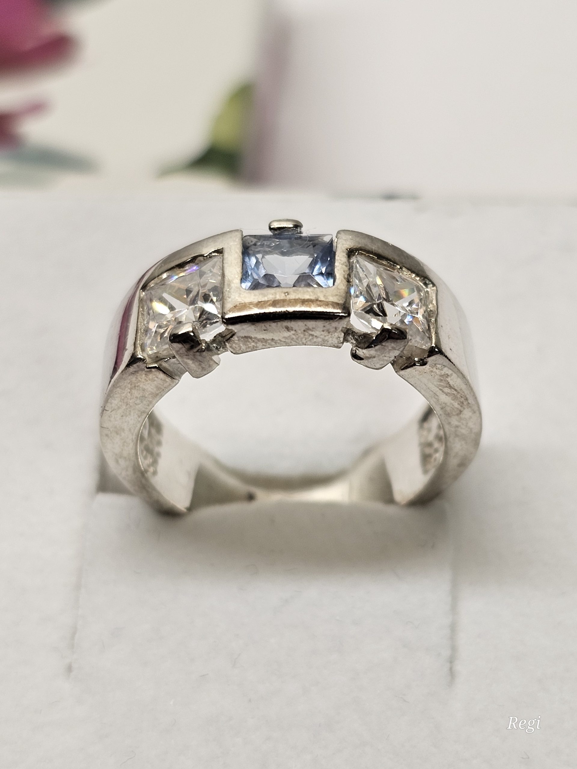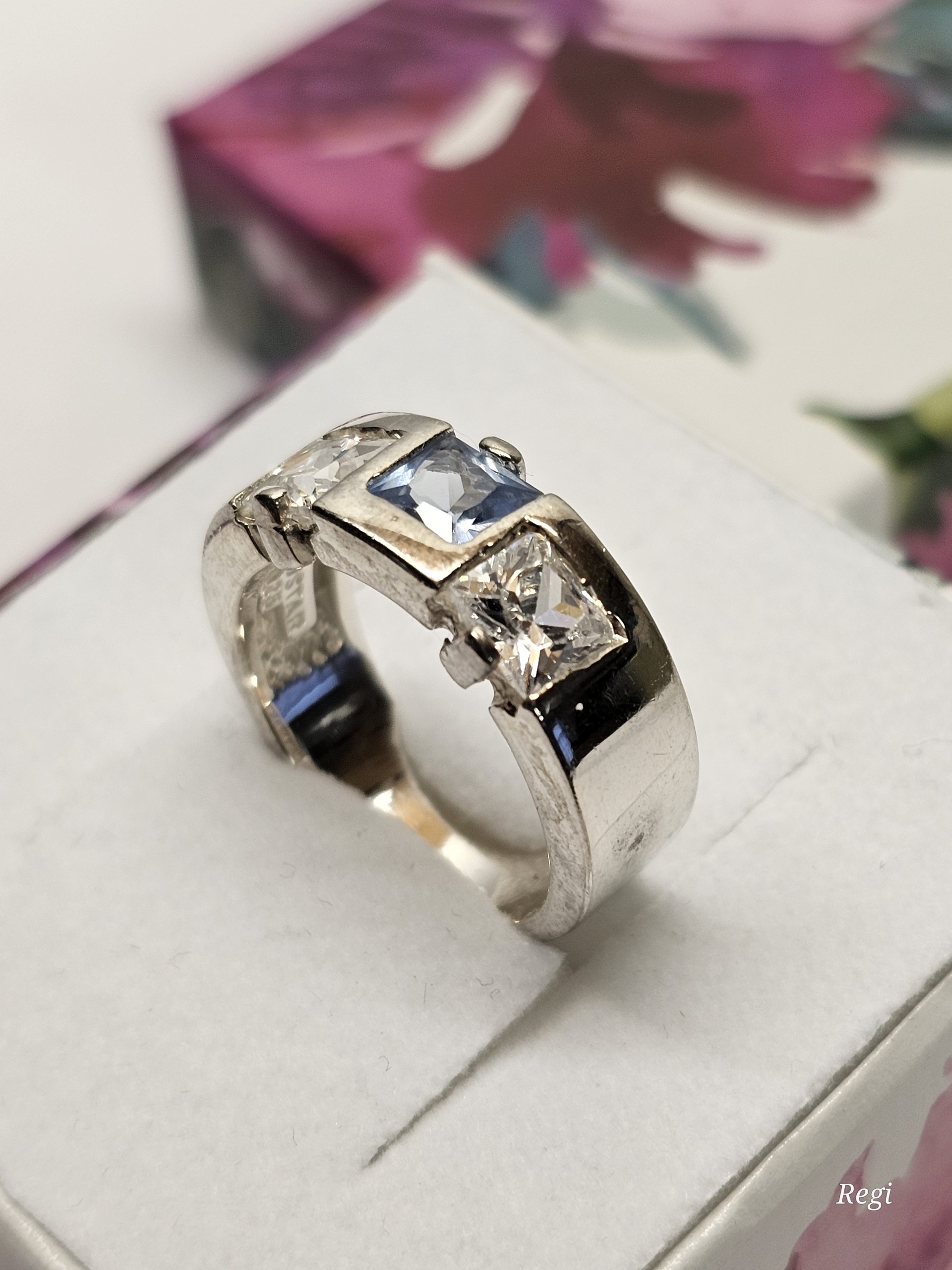 Schöner Ring Silber 925 besetzt mit quadratisch gestalteten Kristallsteinchen im Farbton 1 Stck. blau und 2 Stck. klar.