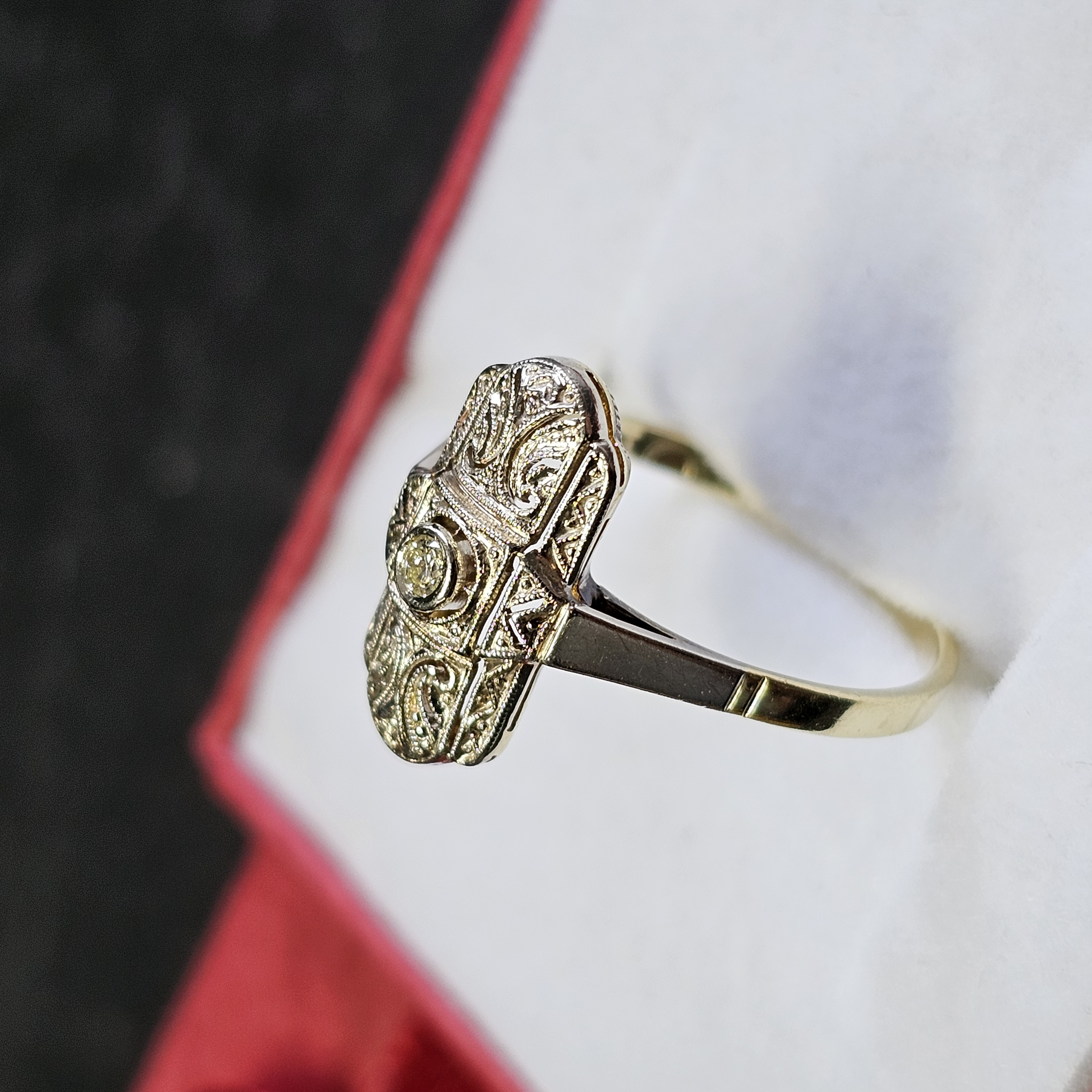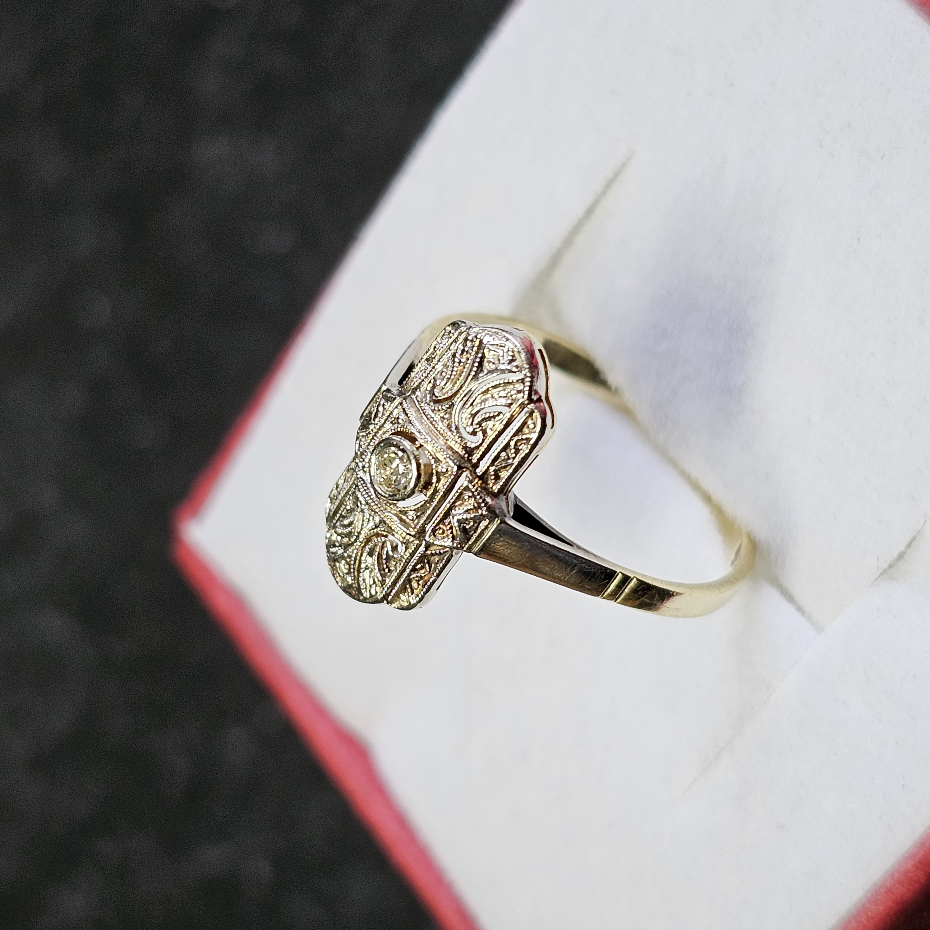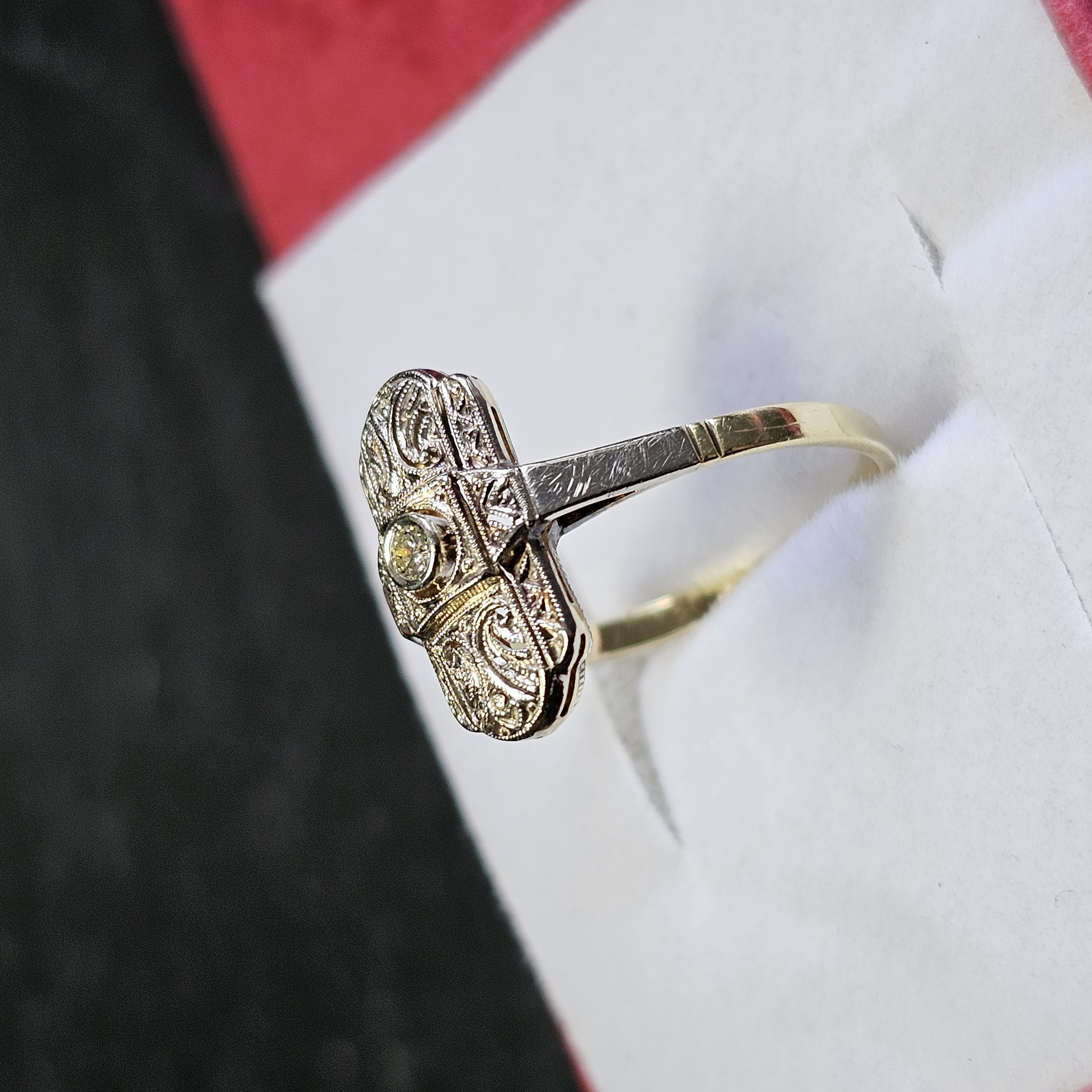 Art Deco Ring aus Gold 585 mit einem Diamantsteinchen mittig besetzt. Die Ringschiene ist Gelbgold, der Ringkopf ist platiniert. Ein wunderschönes Shabby Vintage Schmuckstück, wunderbar!