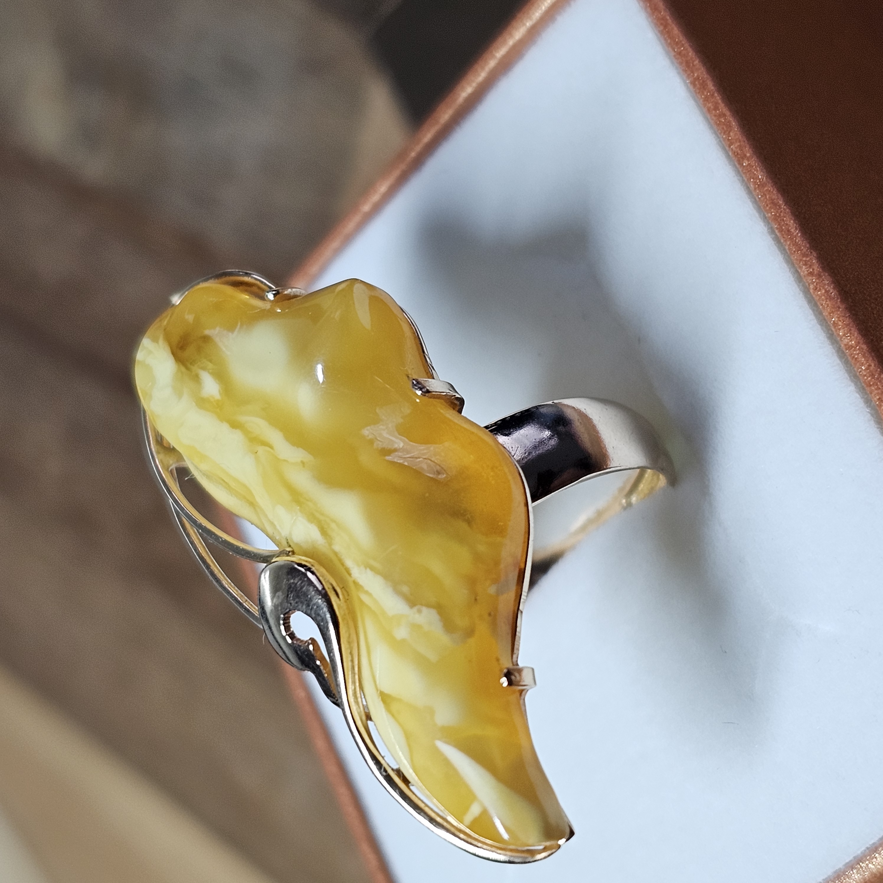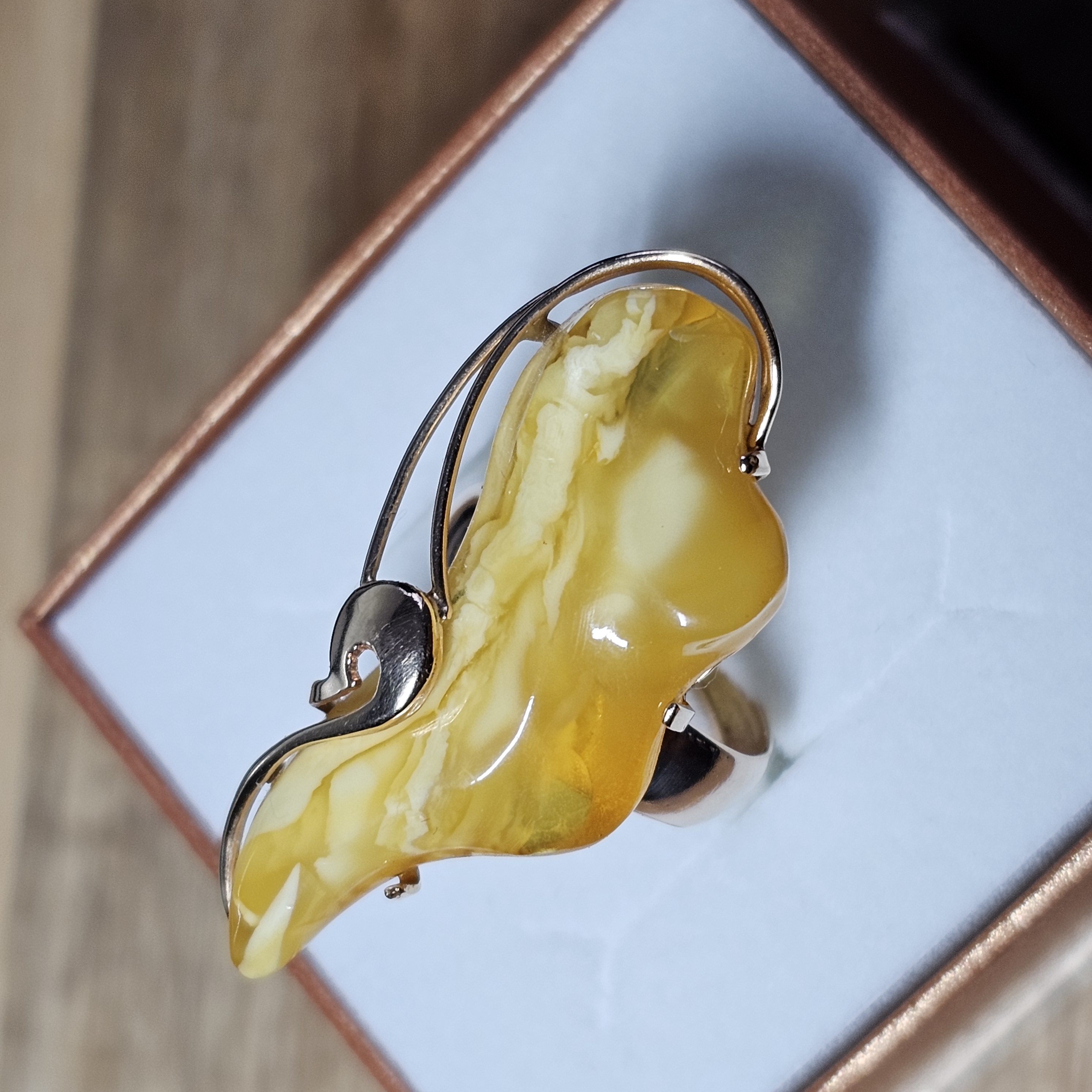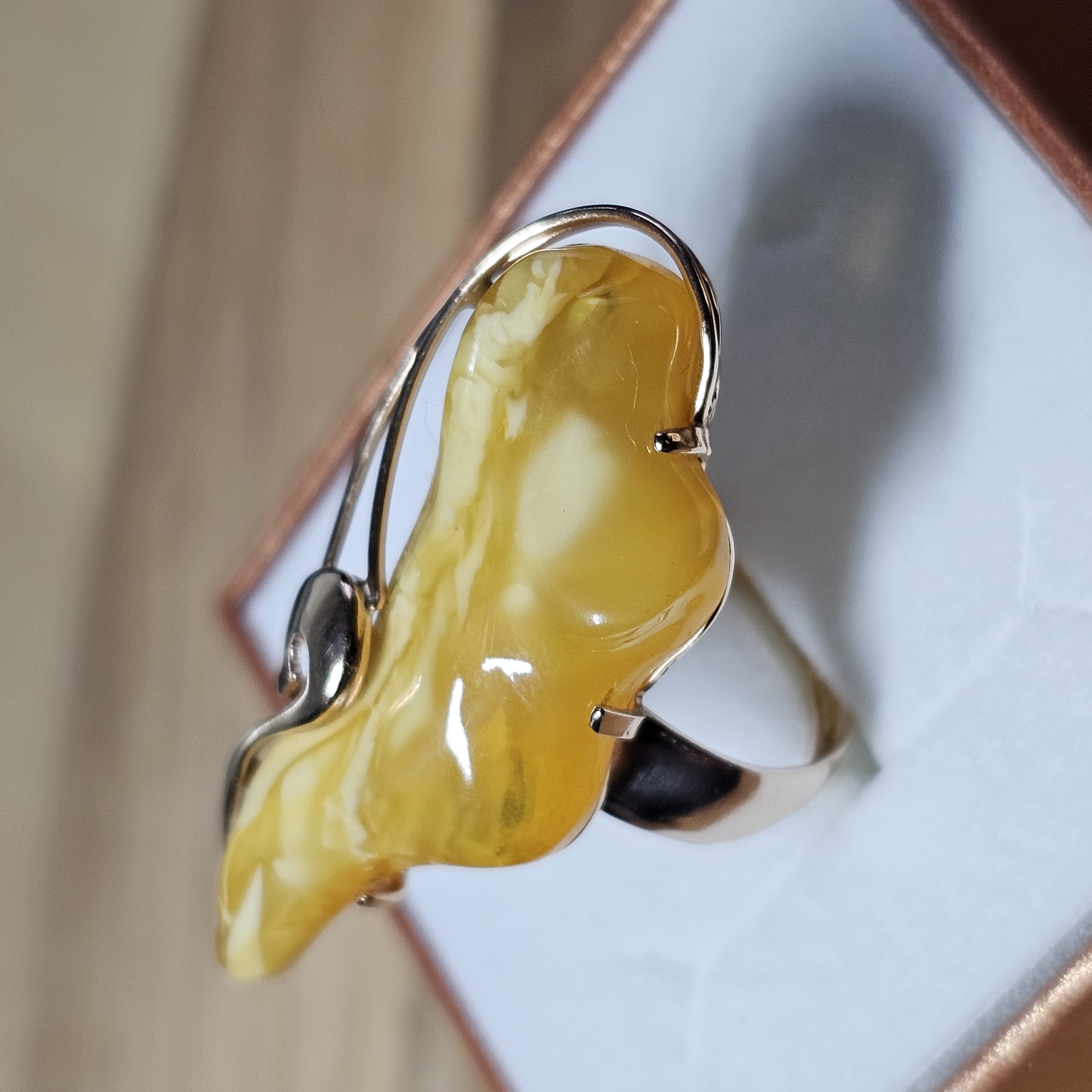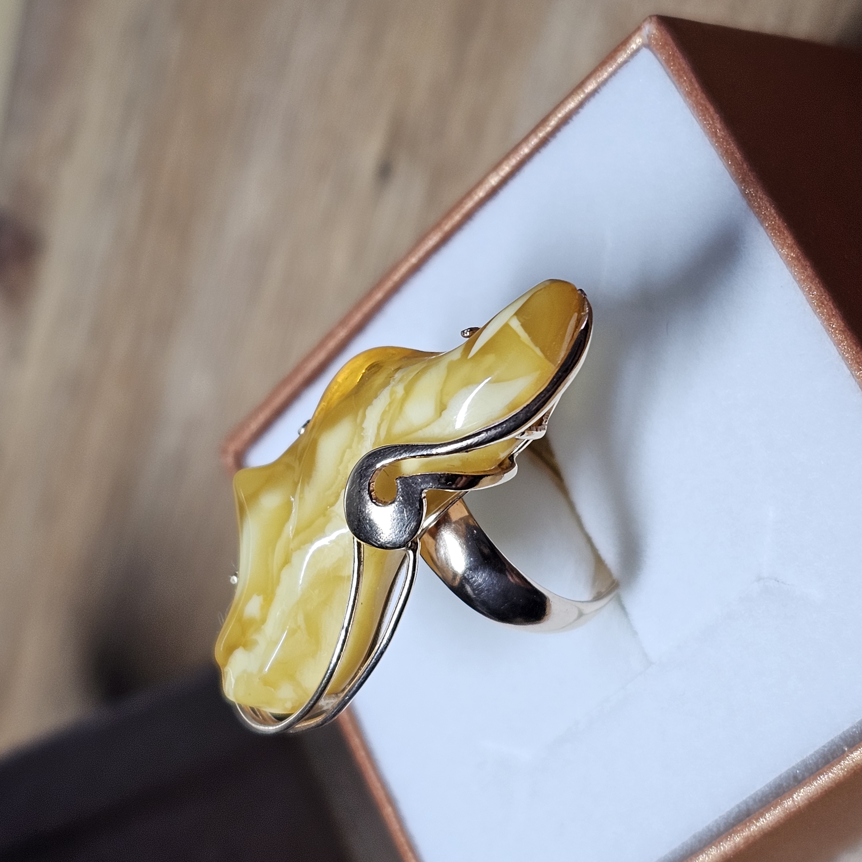 Wow, einfach nur wow! Toller Design Goldring aus Gold 585 gefertigt. Ein das kunstvoll gestaltete Ringkopfdesign ist ein wunderschöne Honigbernstein eingebettet.