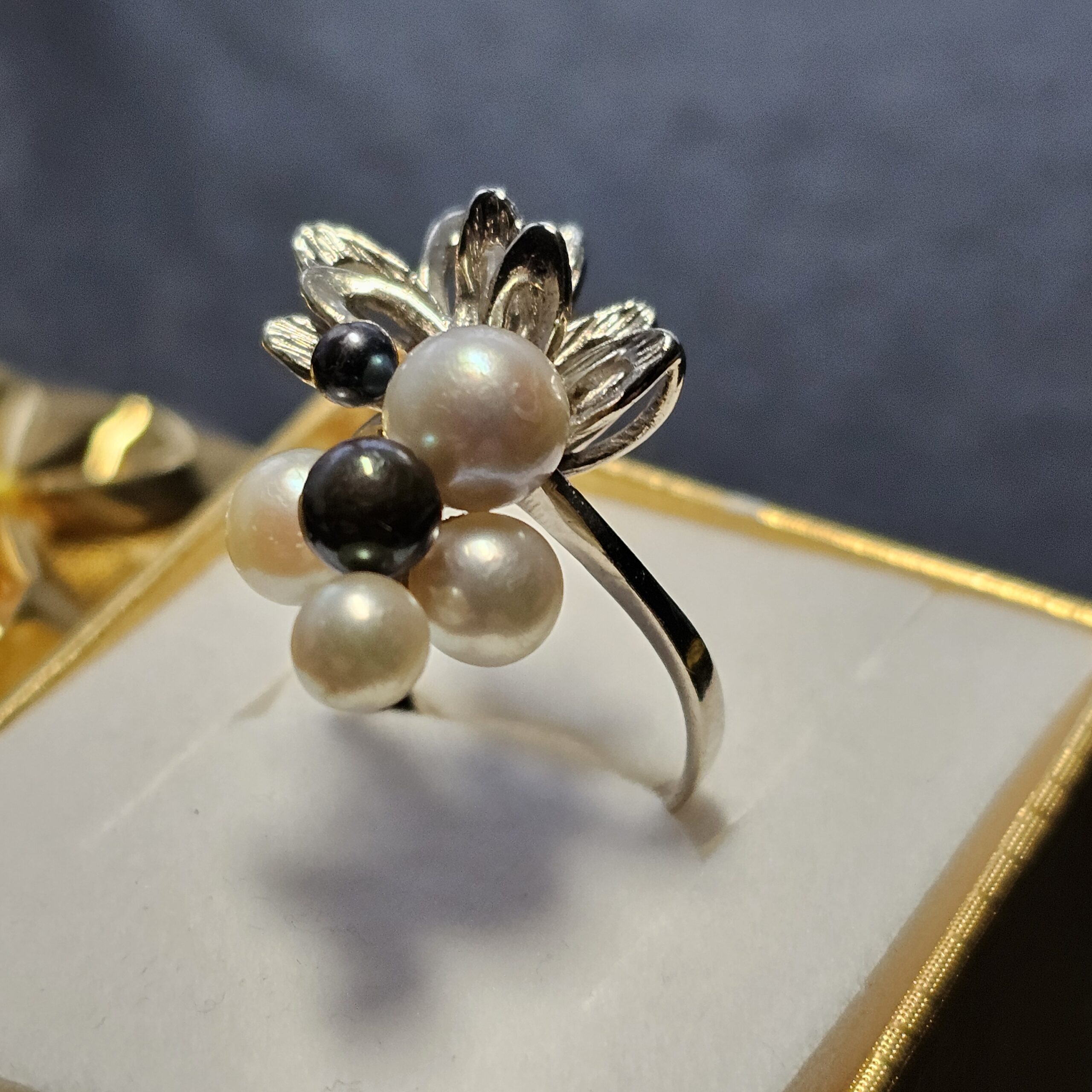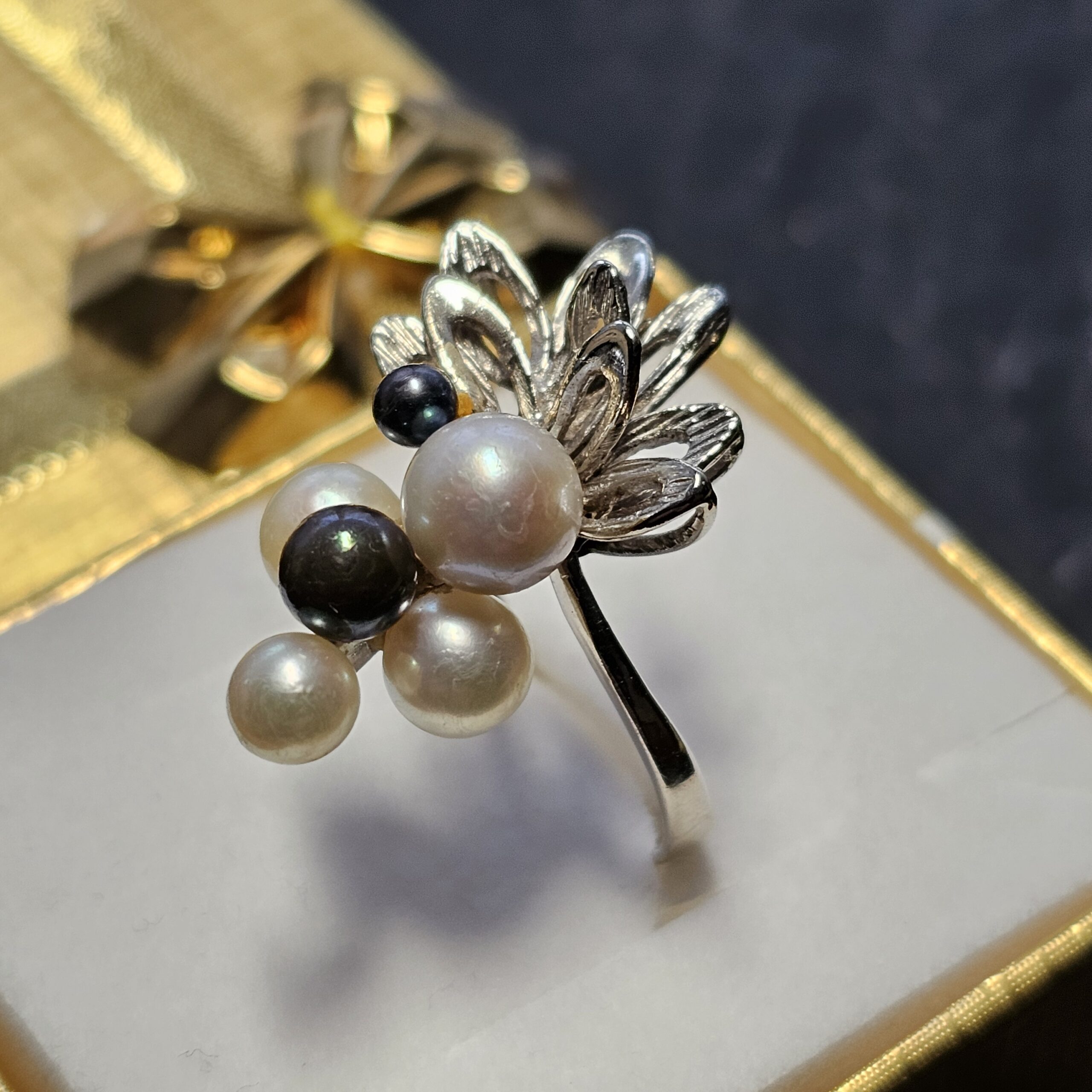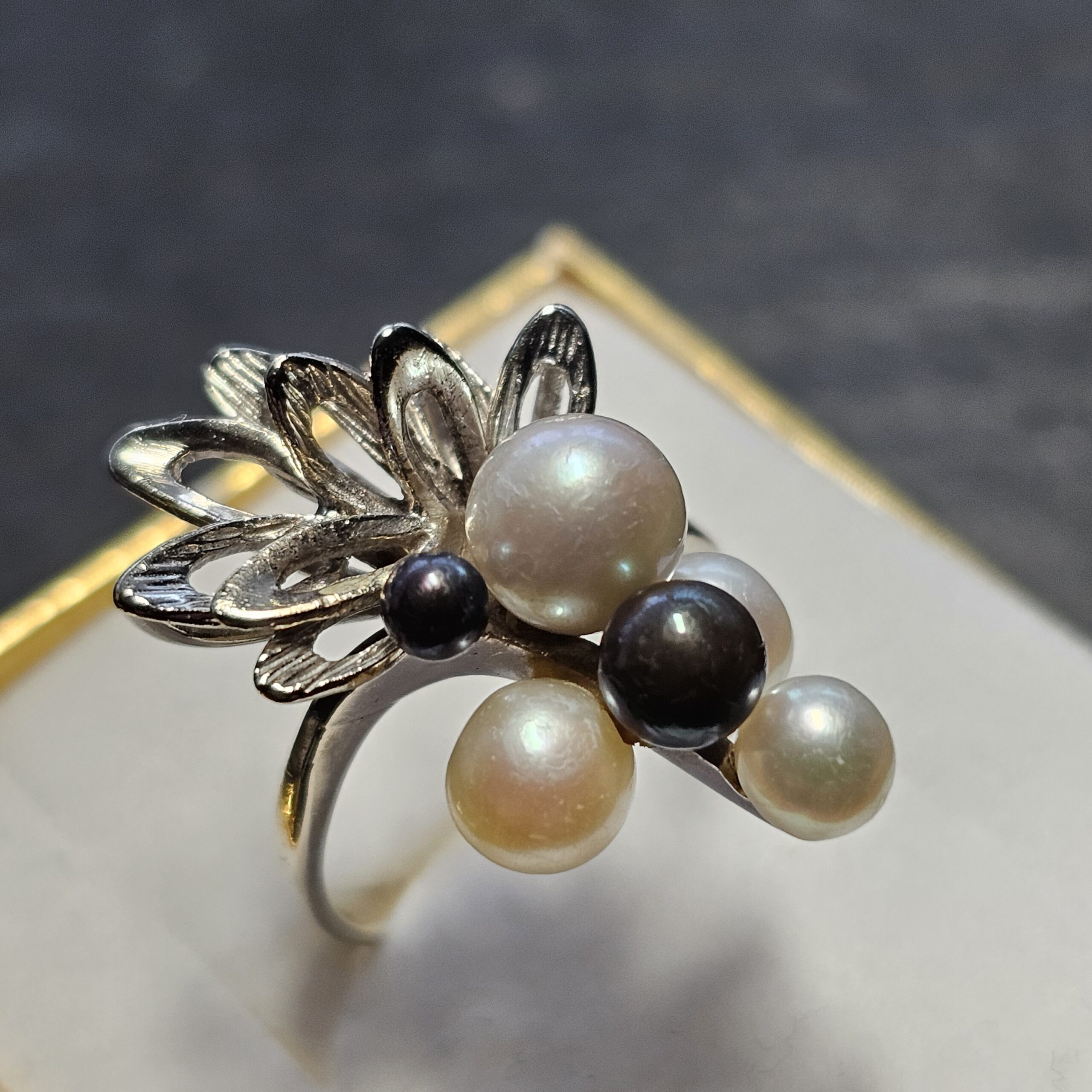 Nostalgischer Design Ring Weißgold 585 mit weißen und grauen Perlen in unterschiedlichen Größen.