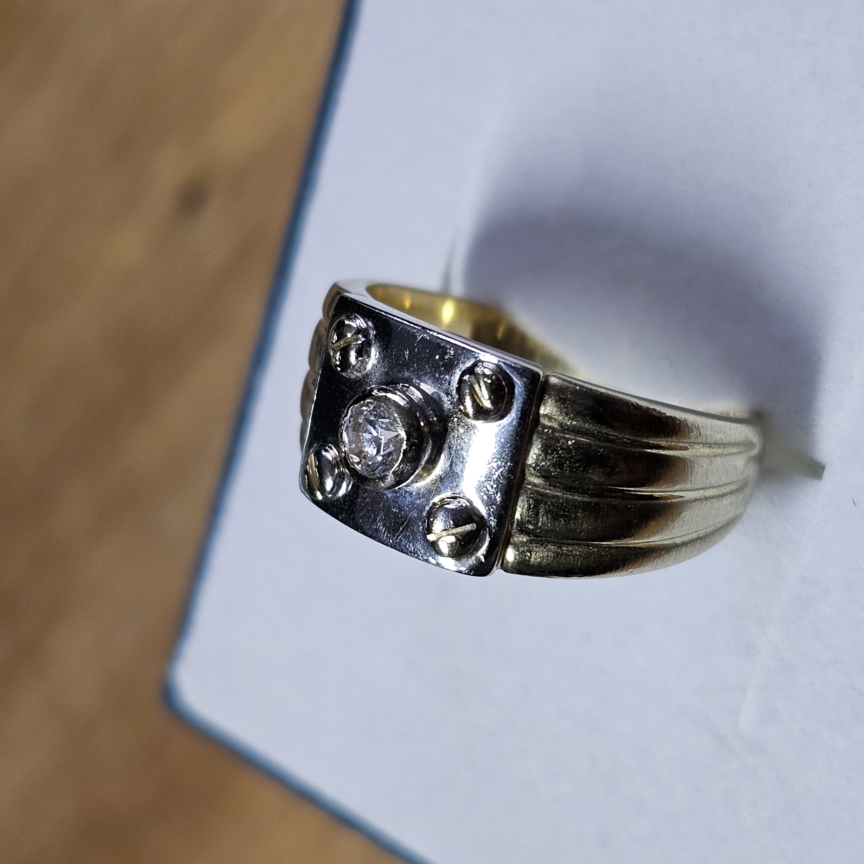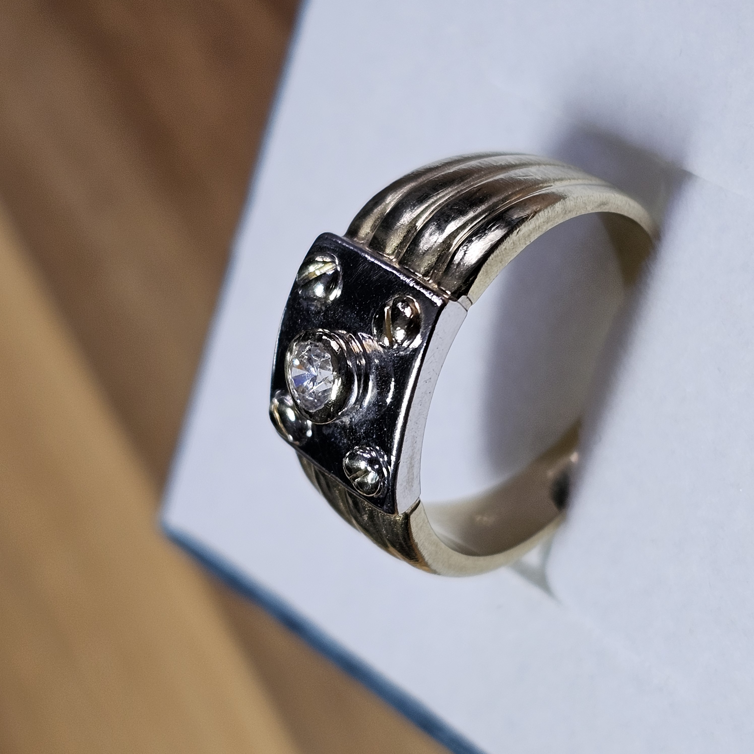 Modischer Ring aus Gold 585 mit einem tollen klaren Topas. Die Ringschiene ist modern gestaltet, teilplatiniert und in einem schönen Rillendesgin gestaltet, das an der Ringschiene herab unten zu einer glatten Oberfläche übergeht.