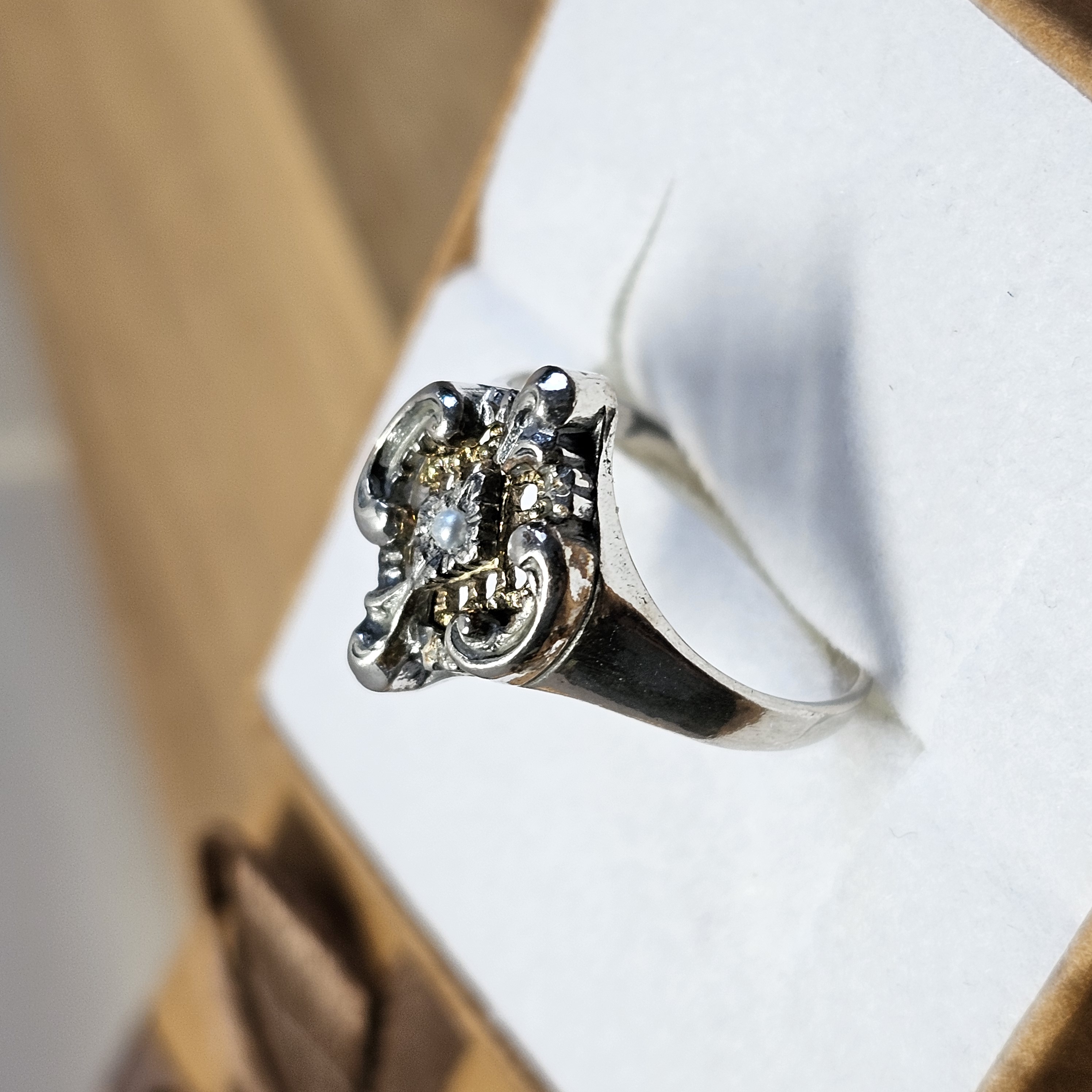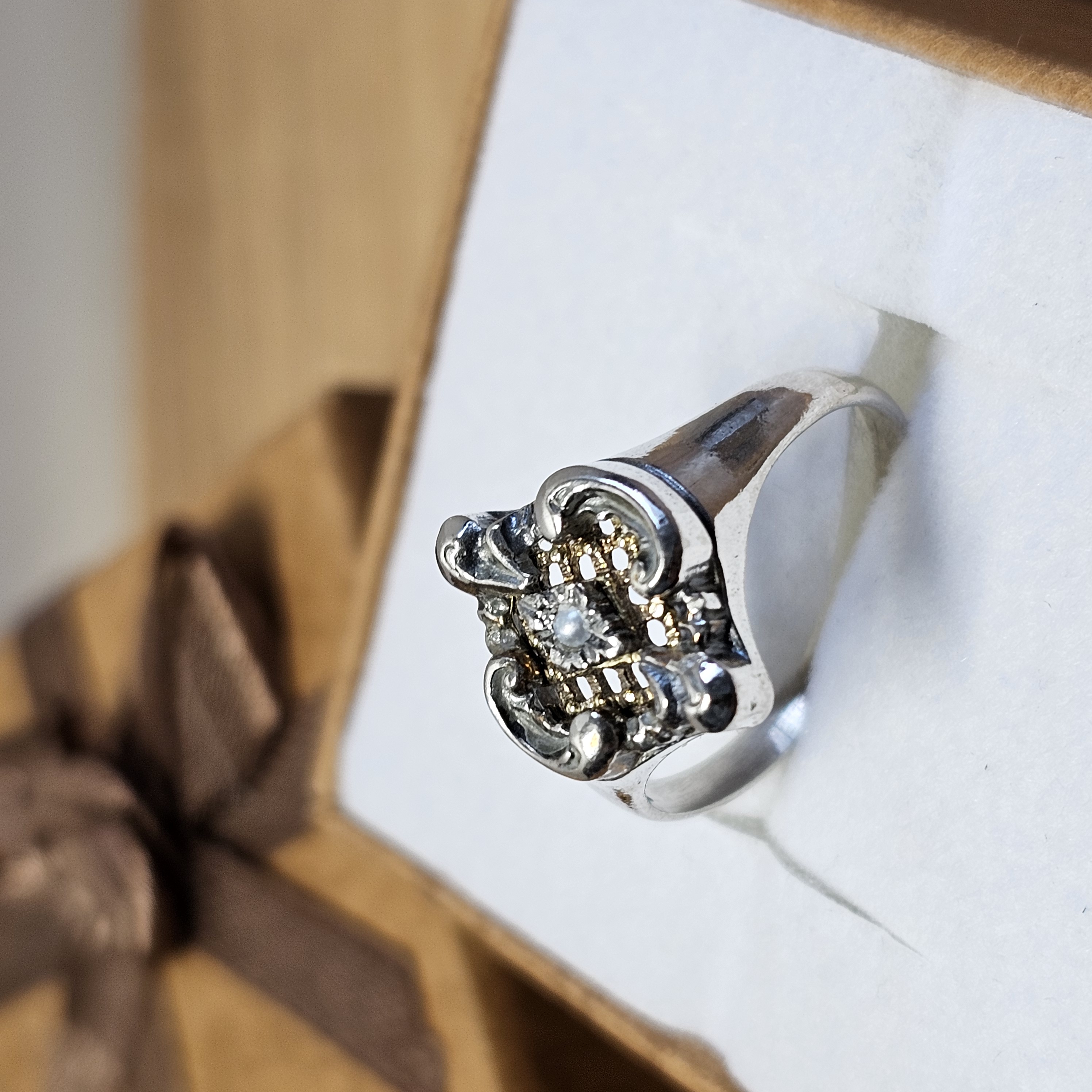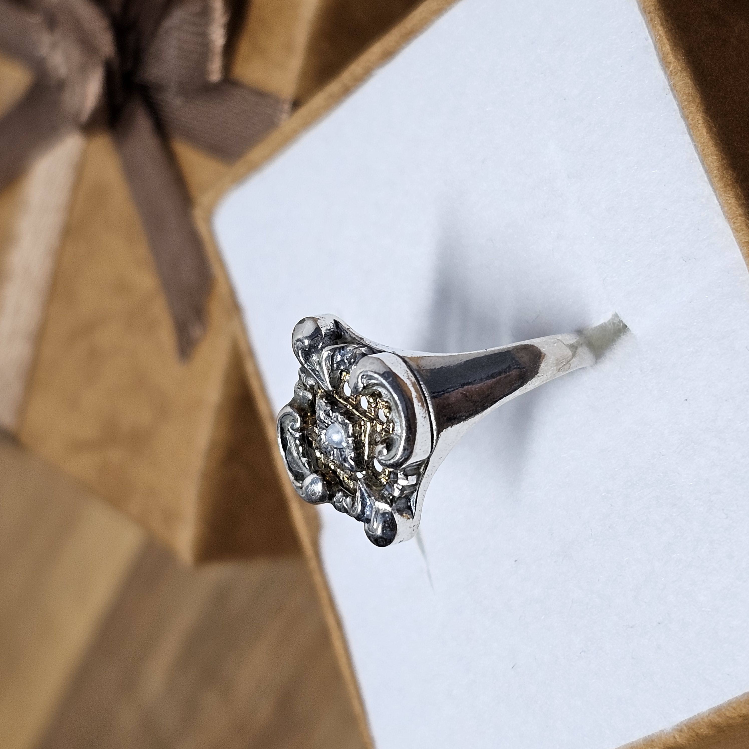 Nostalgischer Ring Silber 835. Er trägt eine Teilvergoldung am Ringkopf mittig und ist mit einer hübschen Saatperle geschmückt.