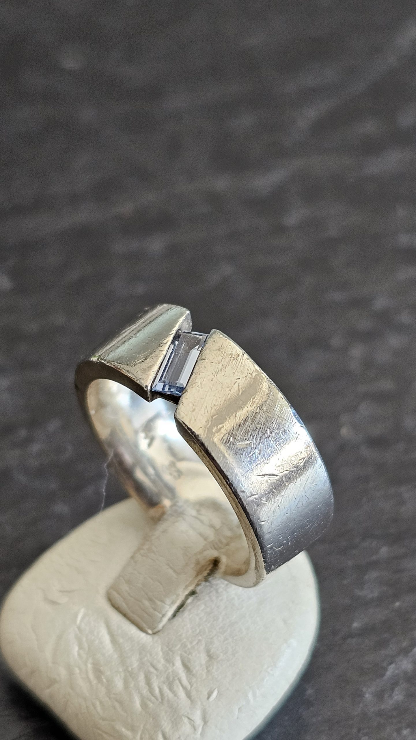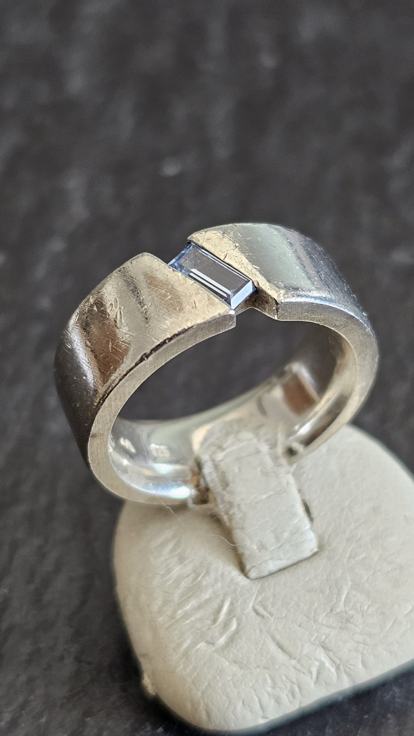 Am Ringkopfbereich ist vom Design her durchbrochen gestaltet und mit einem kleinen rechteckigen blauen Kristallsteinchen geschmückt.
