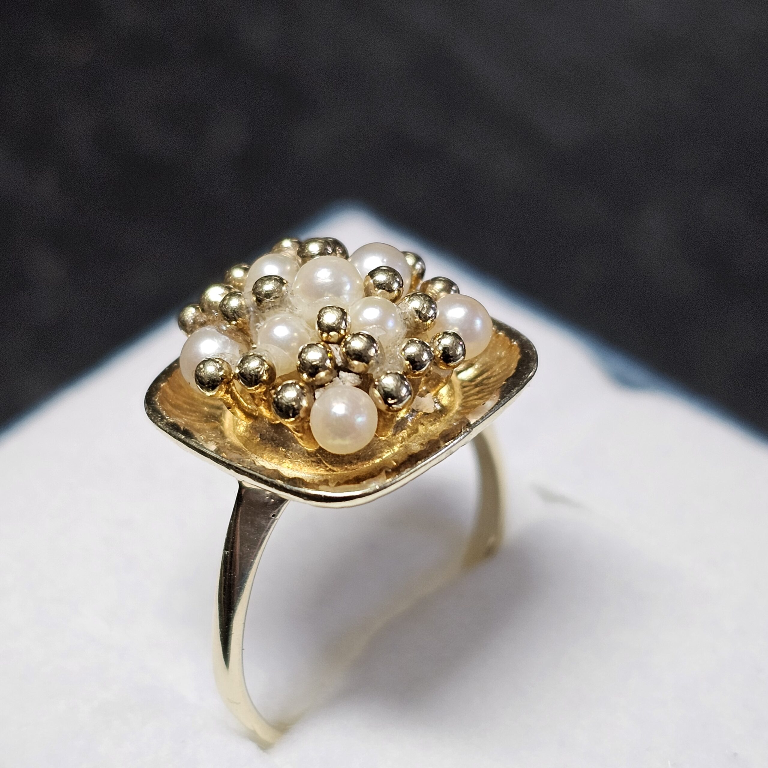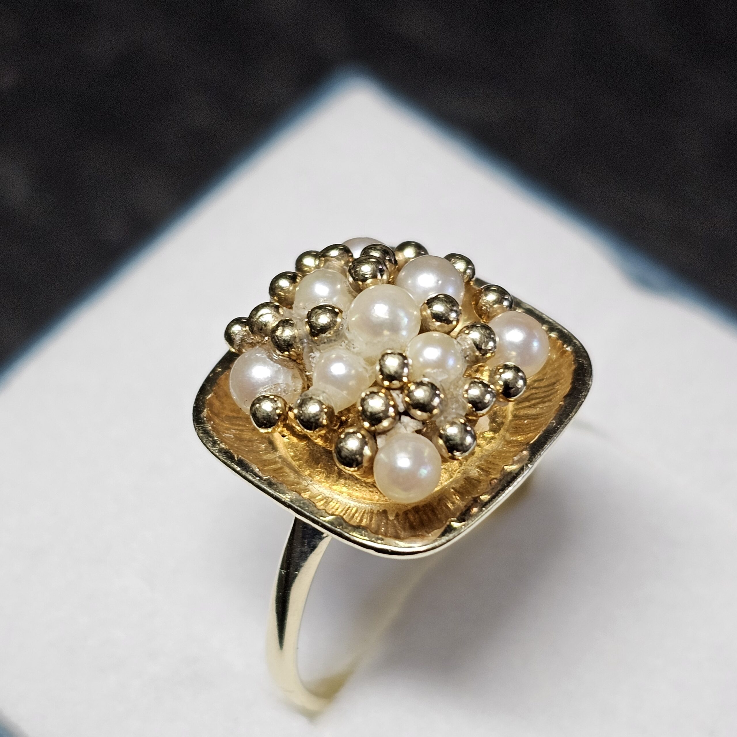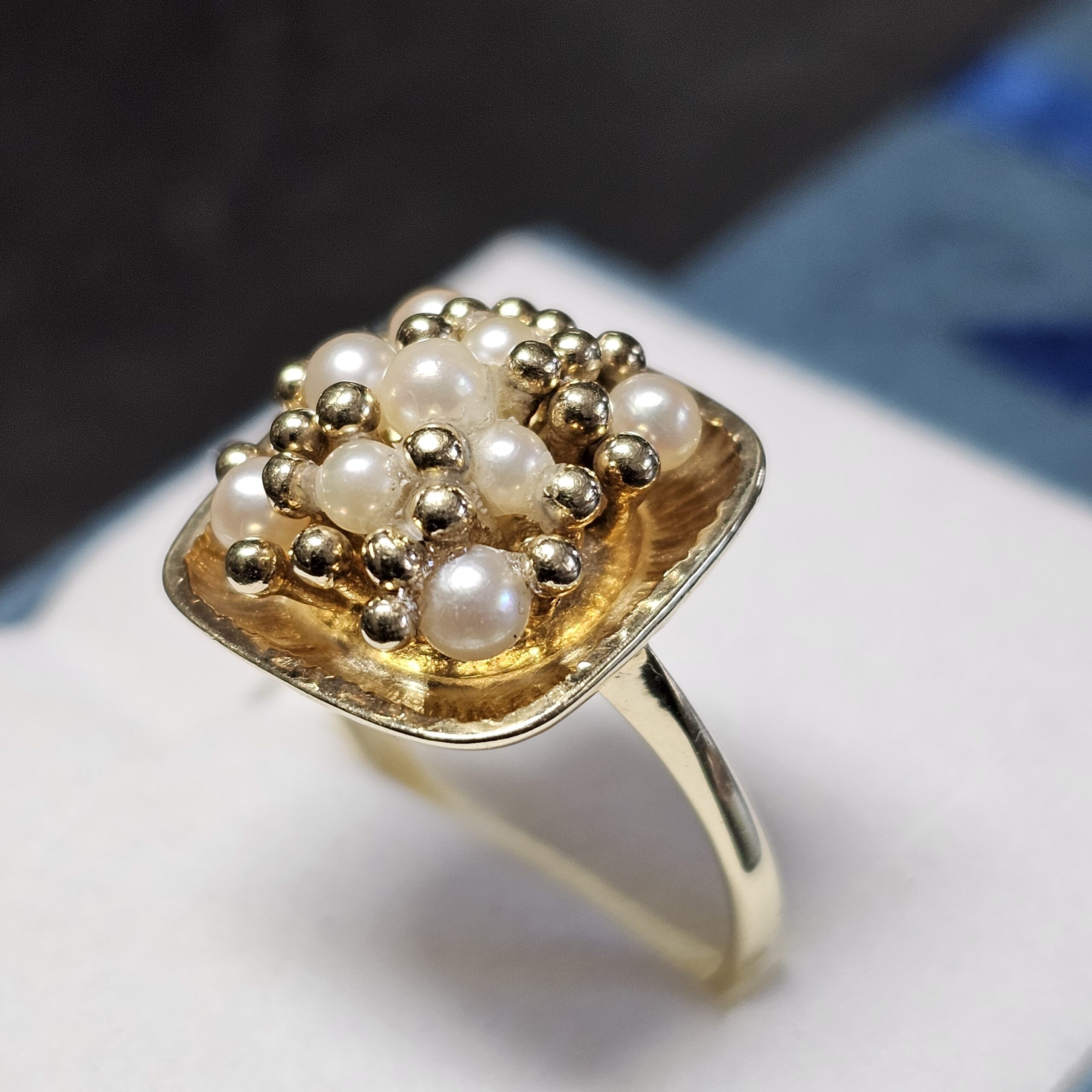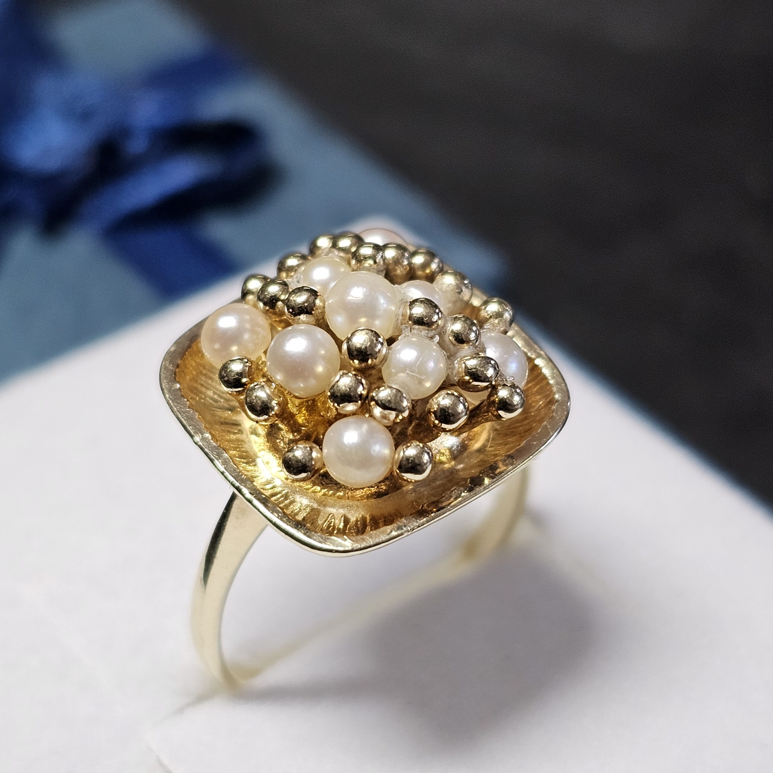 Toller extravaganter Design Vintage-Ring aus Gold 585. Besetzt ist das schöne Stück mit kleinen Perlen.