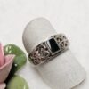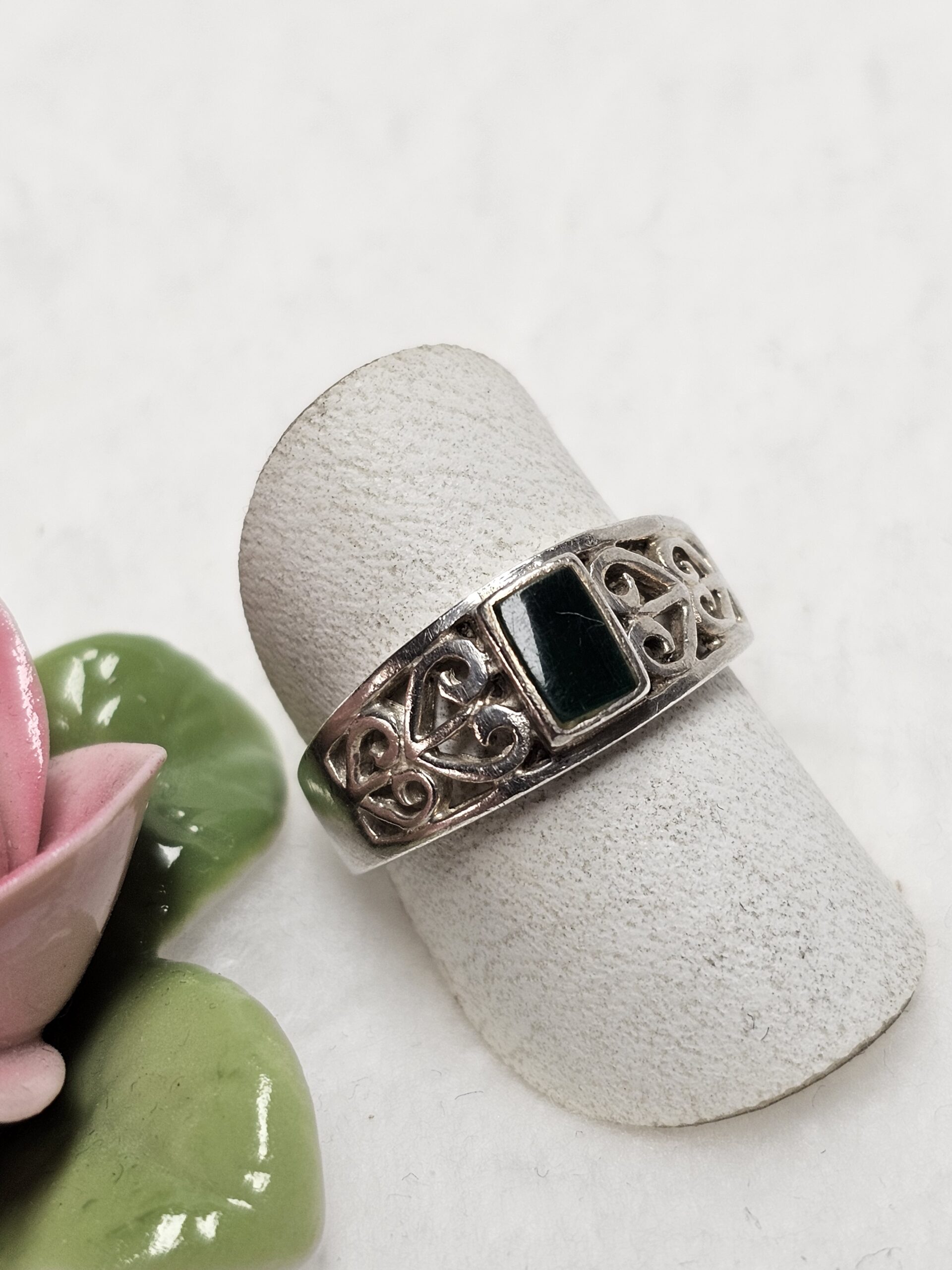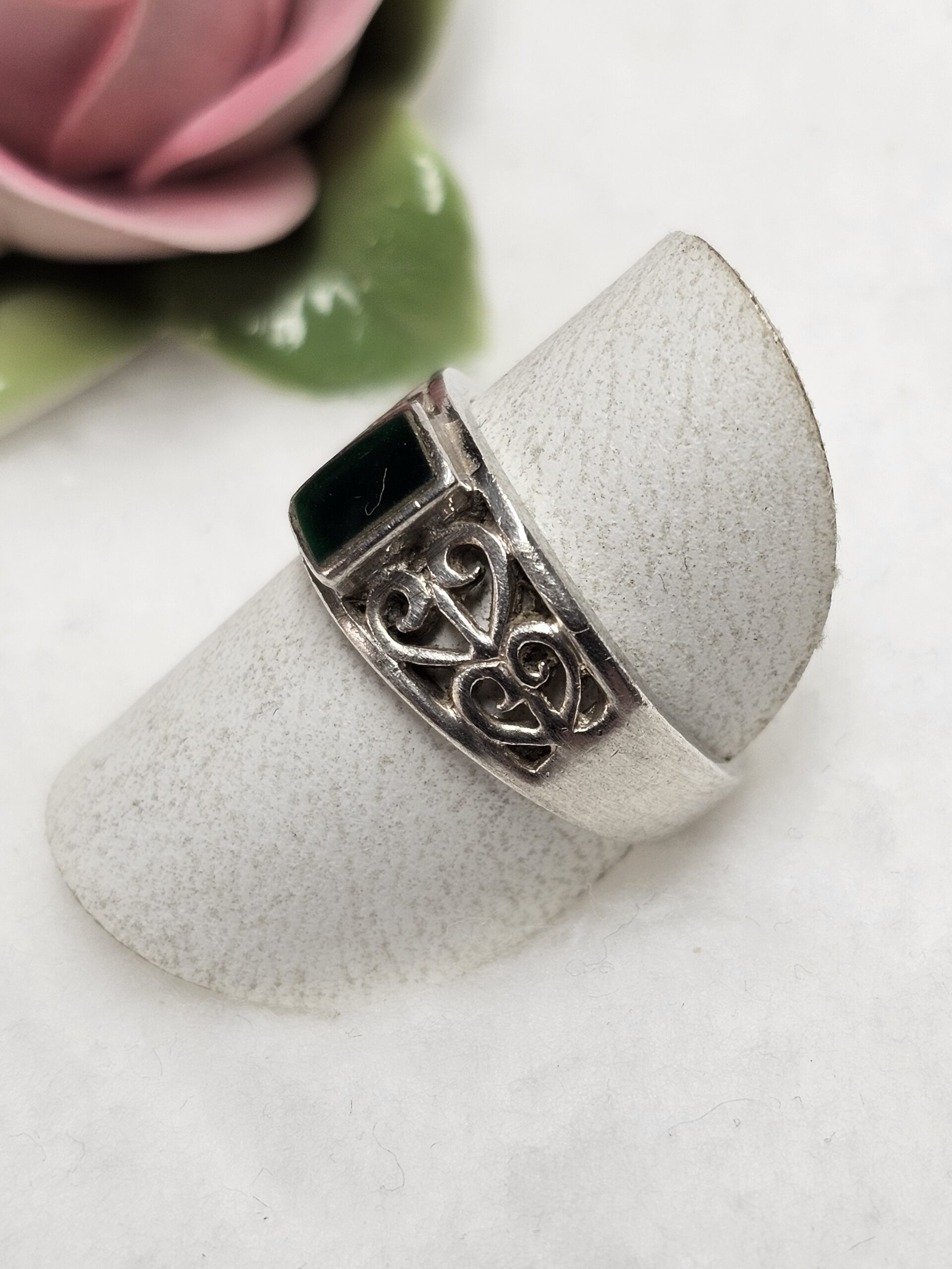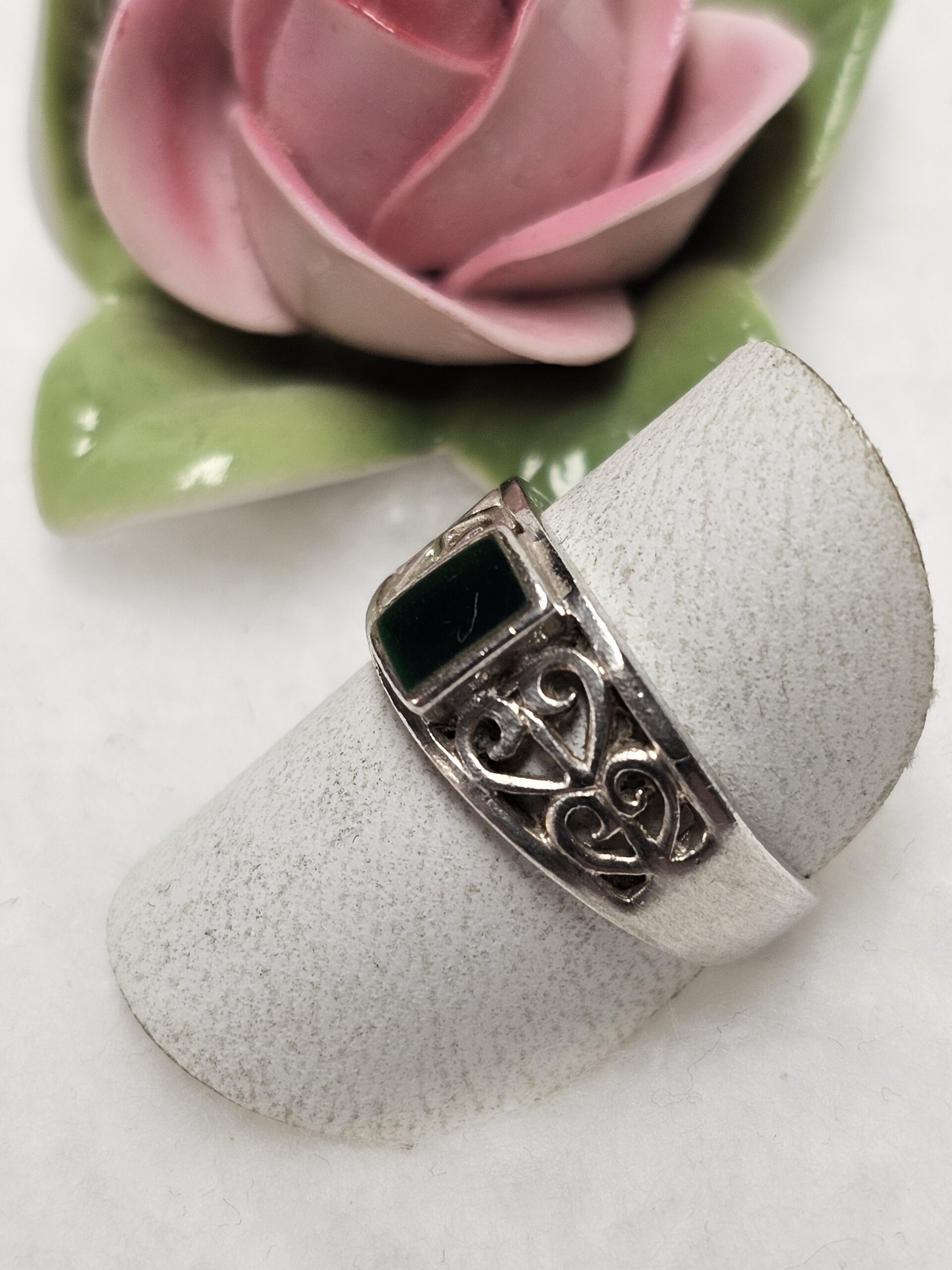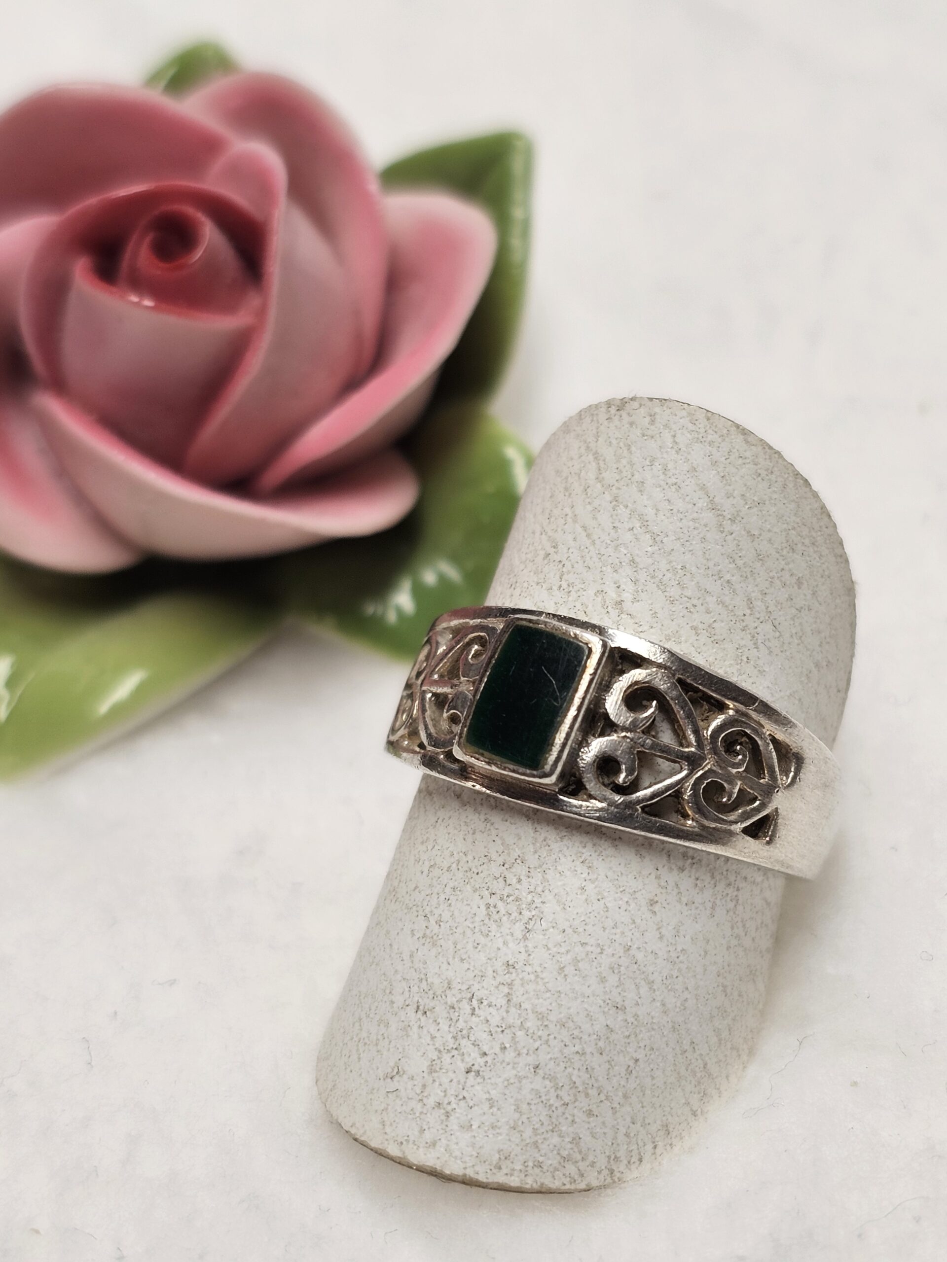 Nostalgischer Vintage Silberring Silber 925 mit einem rechteckigen Chrysopras geschmückt. Wunderschöne durchbrochen gearbeitete Ringgestaltung mit Herzchendesign.