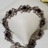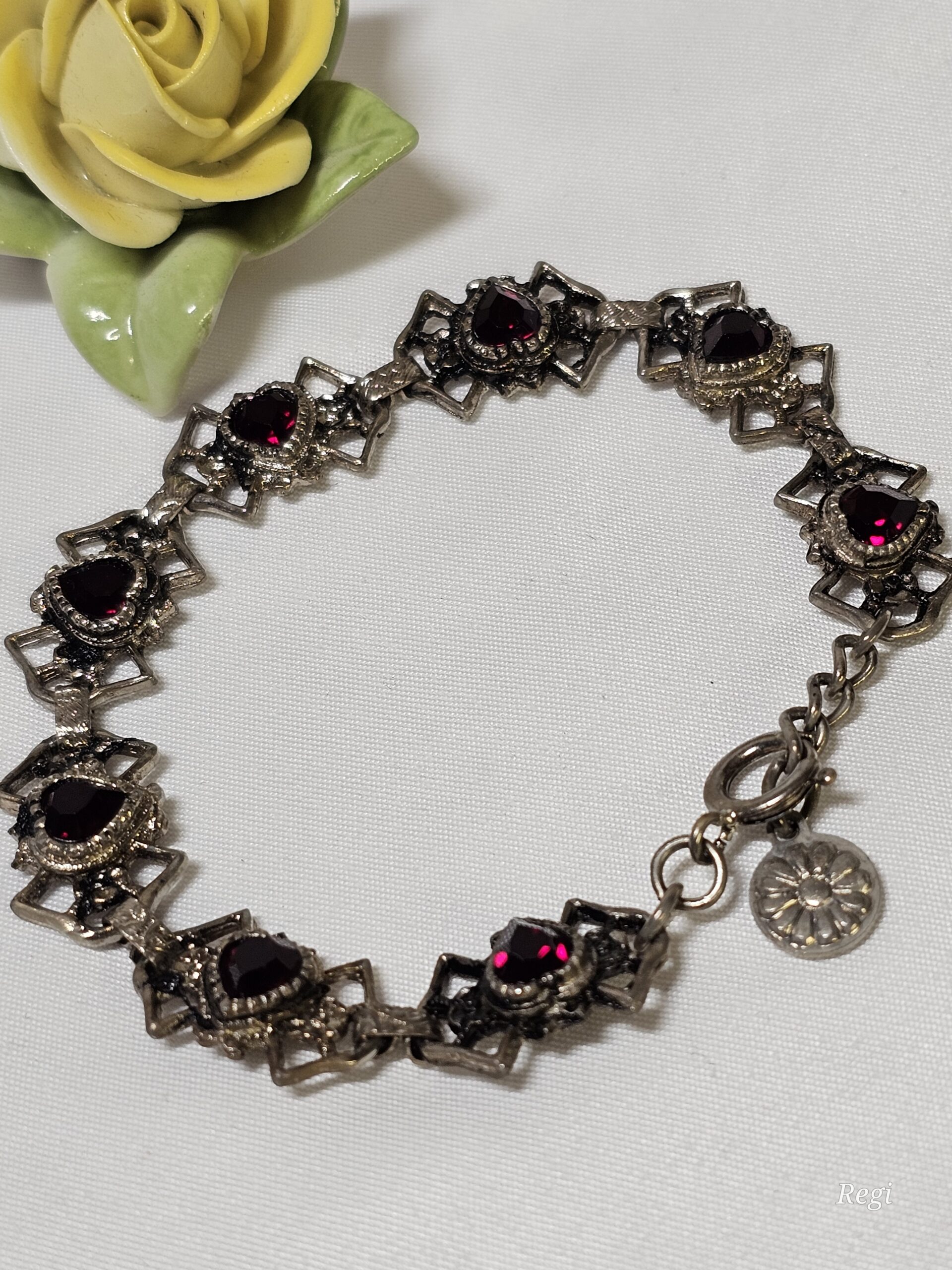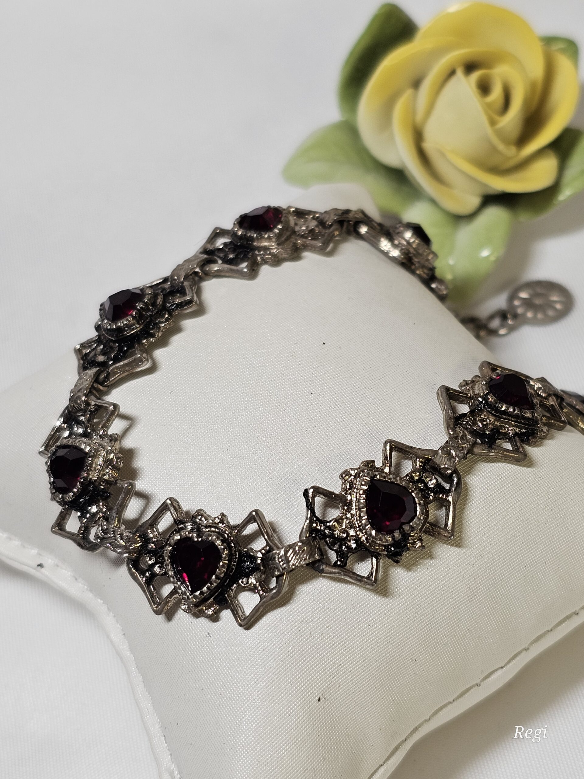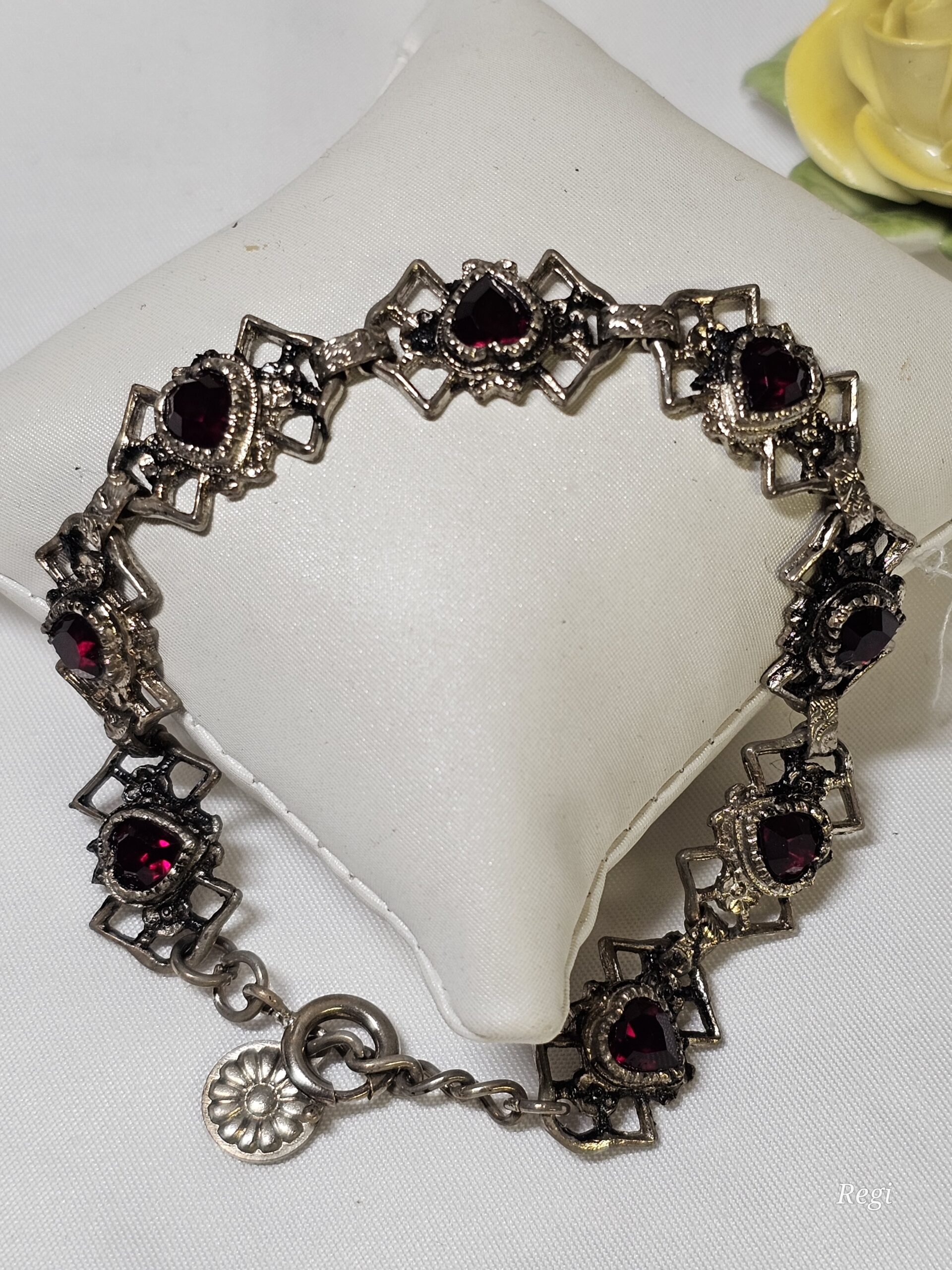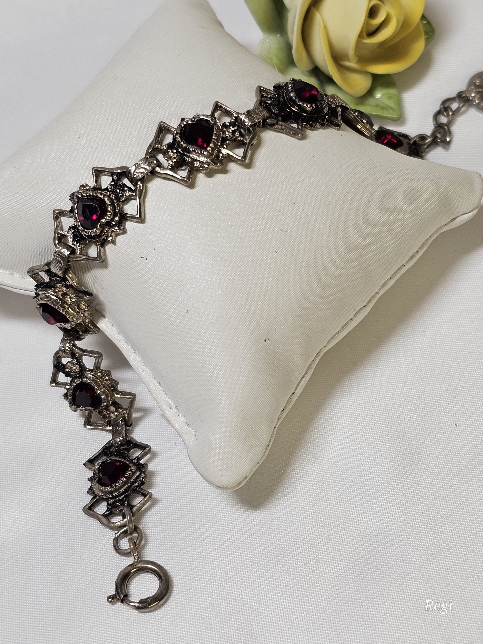 Nostalgisches silbernes Gliederarmband / Armband mit roten Kristallherzchen besetzt.
