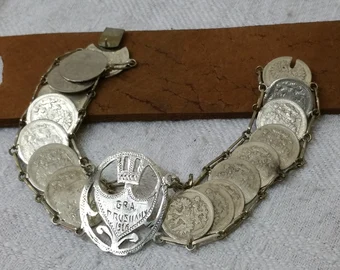Münzarmband aus 800 Silber (geprüft) Russland, mit 5 Kopeken Münzen (1901) Zarenzeit, insgesamt 18 Stück. Dieses Armband ist ein sehr seltenes Stück. Es wurde in Handarbeit hergestellt – eine tolle Silberschmiedearbeit. Als Mittelstück ist ein Wappensymbol gearbeitet mit der Inschrift GR. A. Pruzhany 1916 auf der Vorderseite und den persönlichen M. L. 8.7.16, Silber, auf der Rückseite. Ein einmaliges, einzigartiges Stück, 100 Jahre alt!