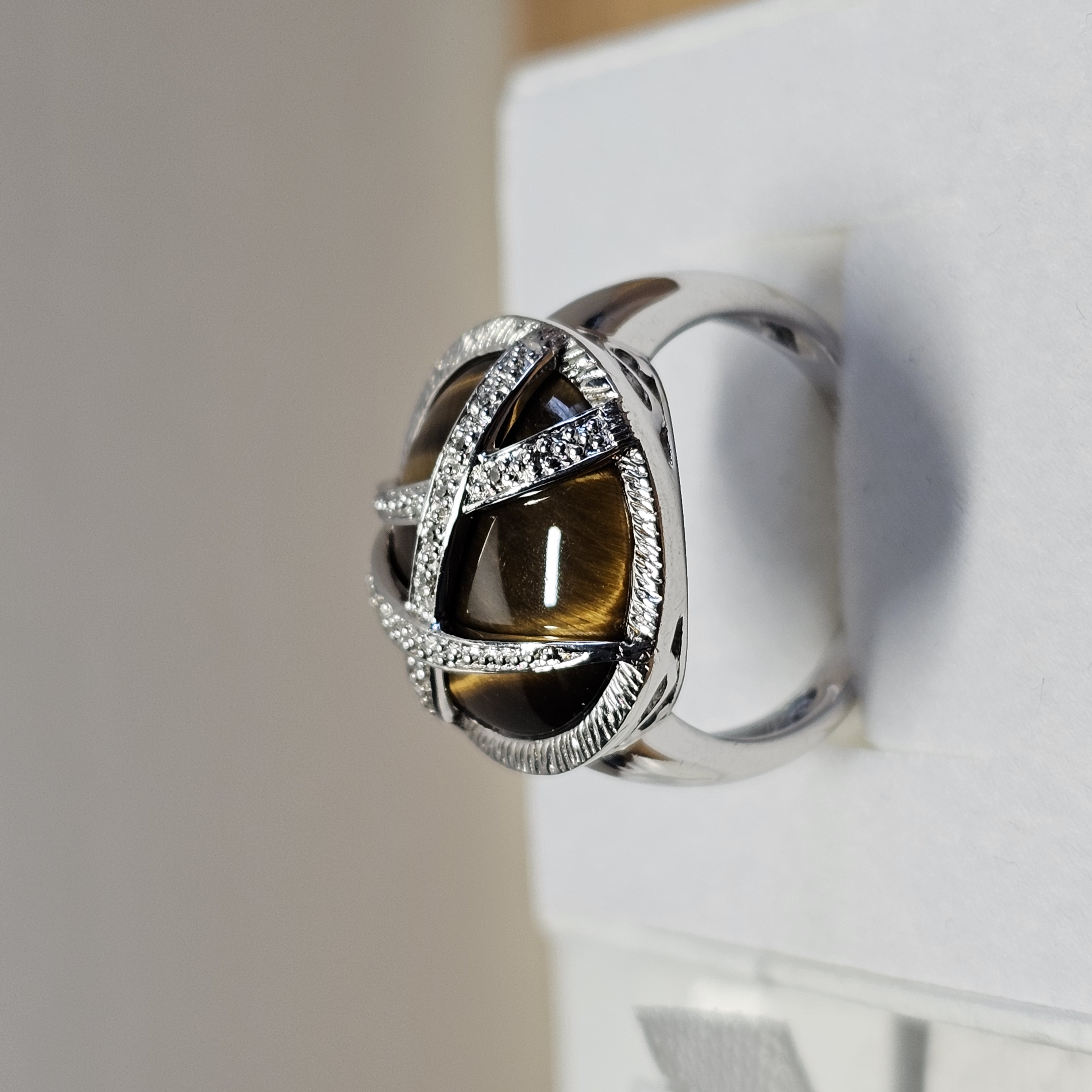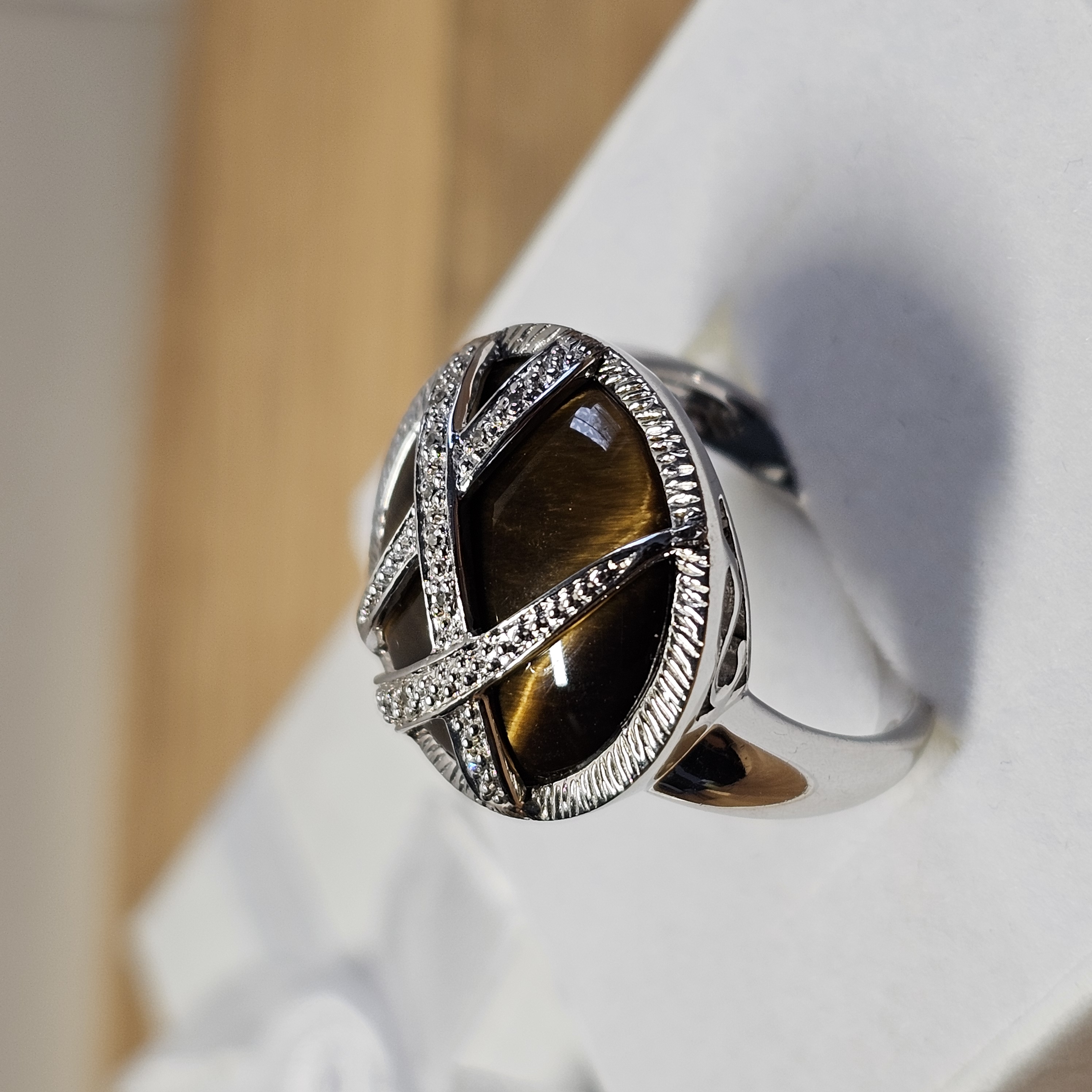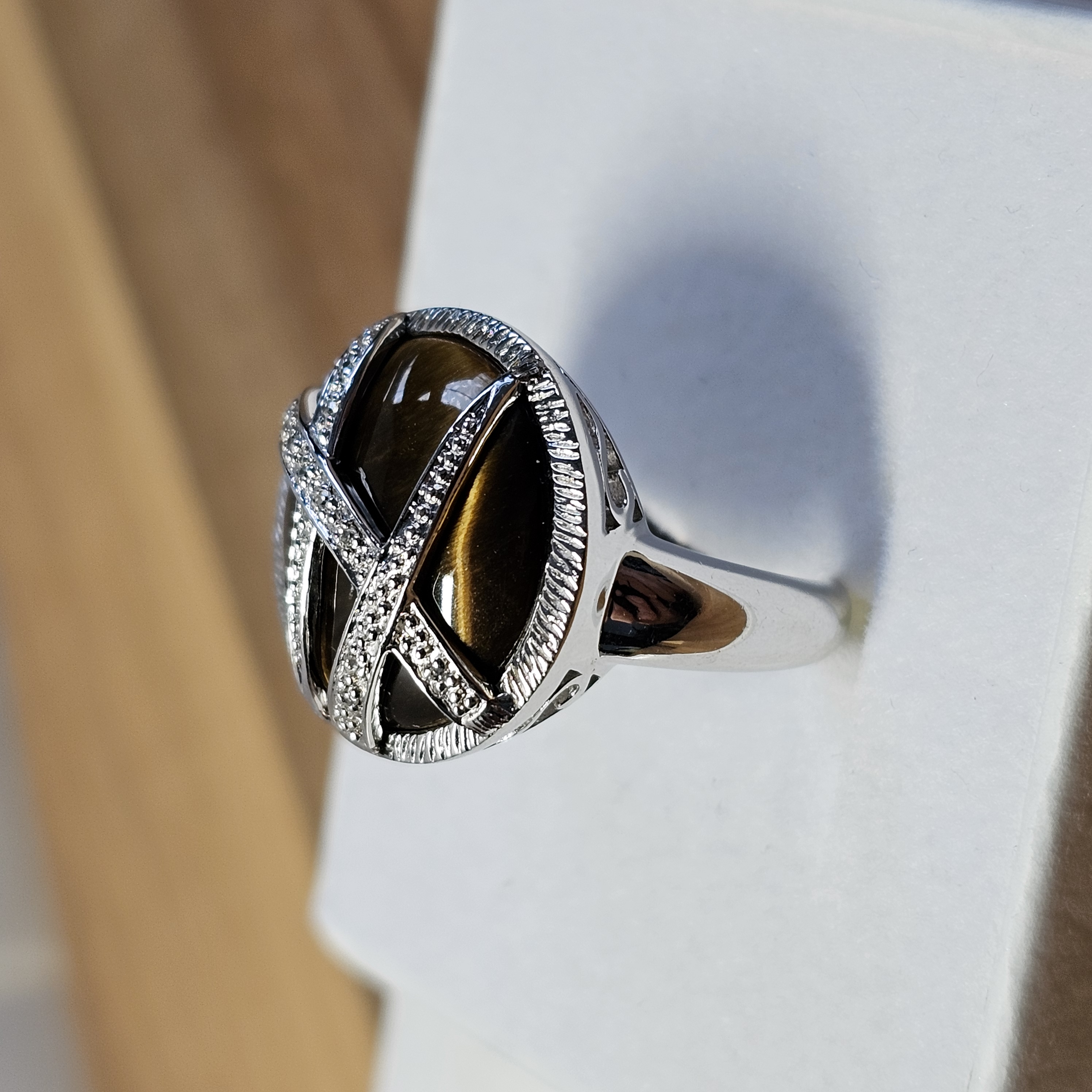 Hübscher Ring Silber 925 mit einem Tigerauge. Der Tigerauge Stein ist mit Silberstreifen geschmückt die punktuell mit kleinsten Diamantsteinchen besetzt sind.