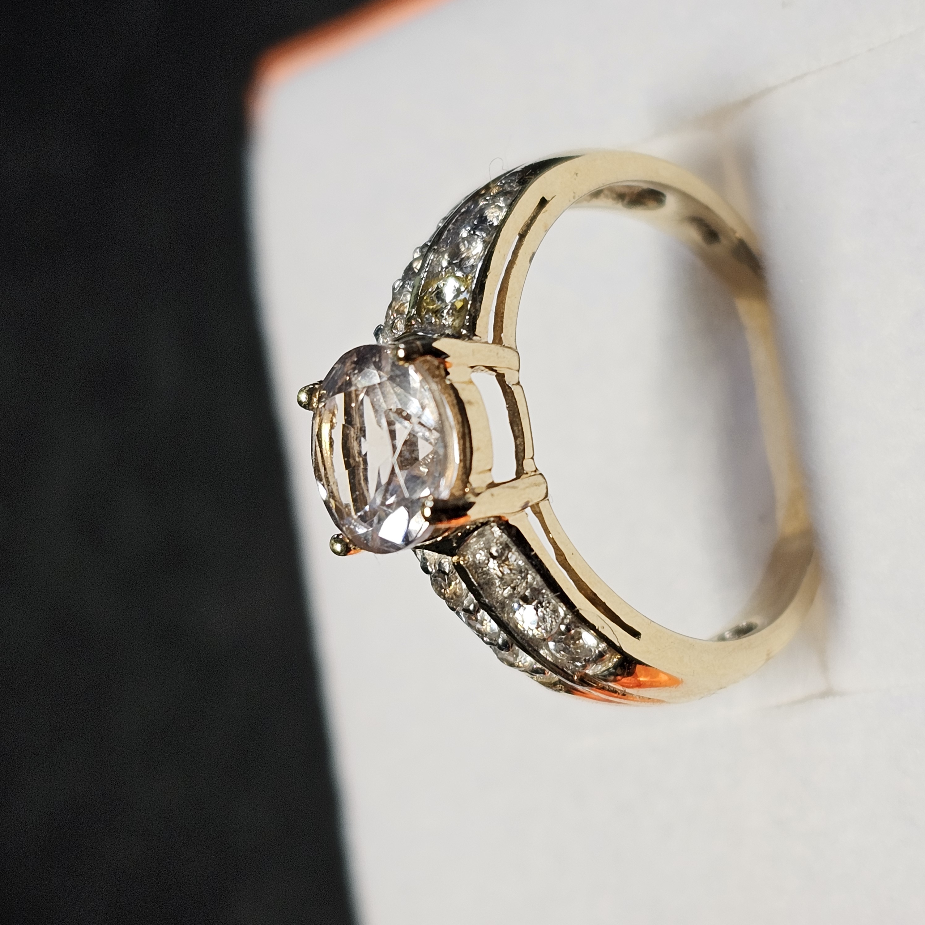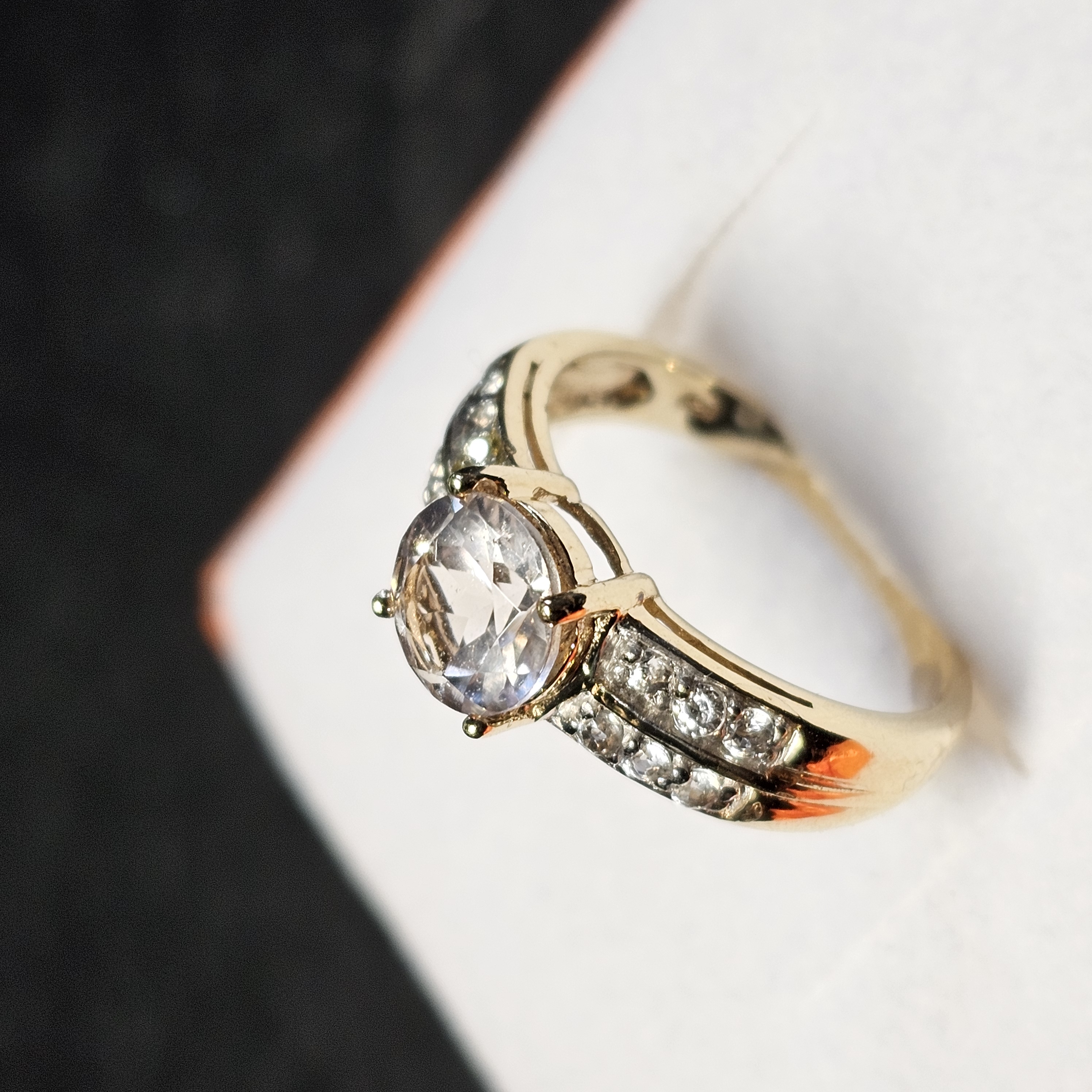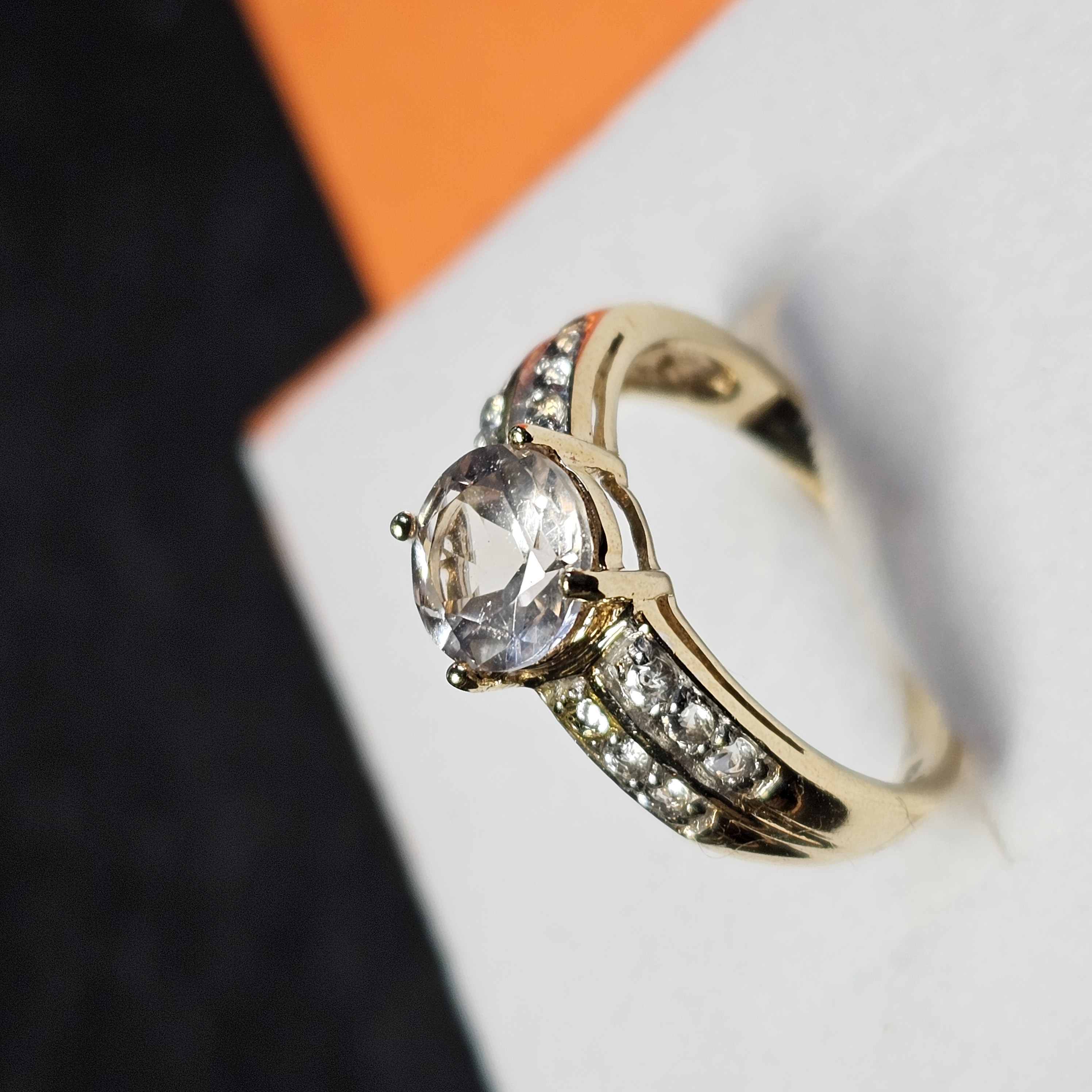 Toller Ring aus Gold 375, ein schöner Kristallstein schmückt den Ringkopf. Links und rechts daneben seitlich an der Ringschiene entlang sind in einer 2er Reihen kleine Kristallsteinchen angebracht.