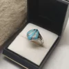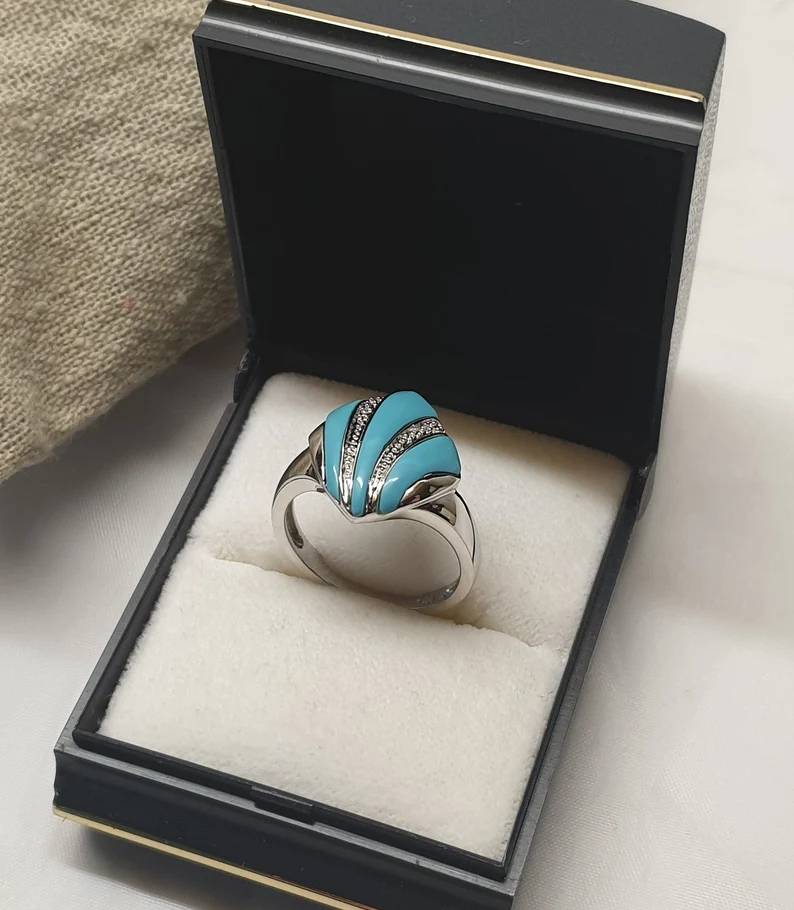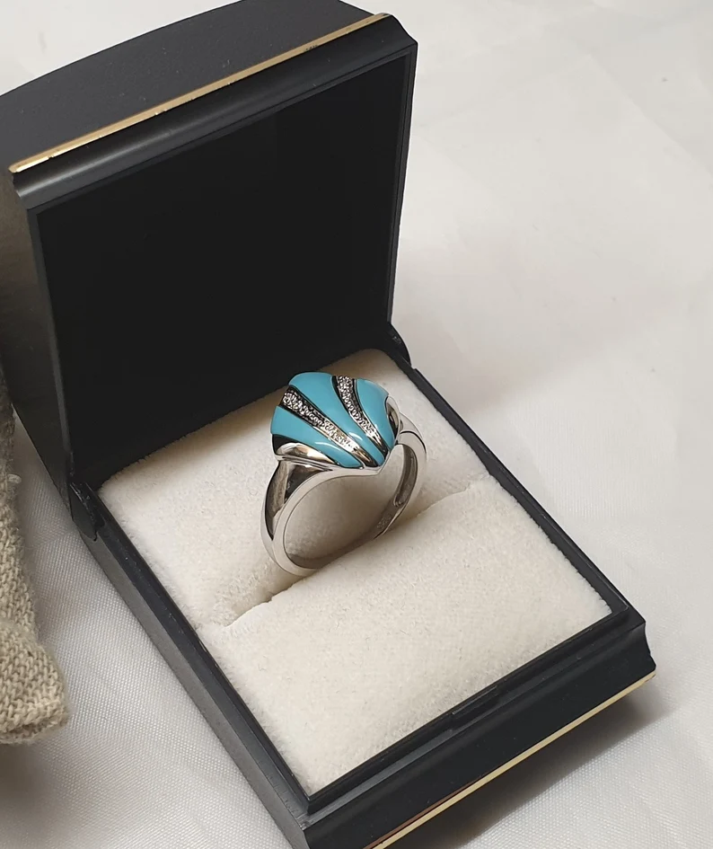 Schöner Ring Silber 925 mit Türkis-Einlage und zwei mini kleinen Diamantsteinchen an der Fächerspitze in das Silber eingelegt.
