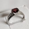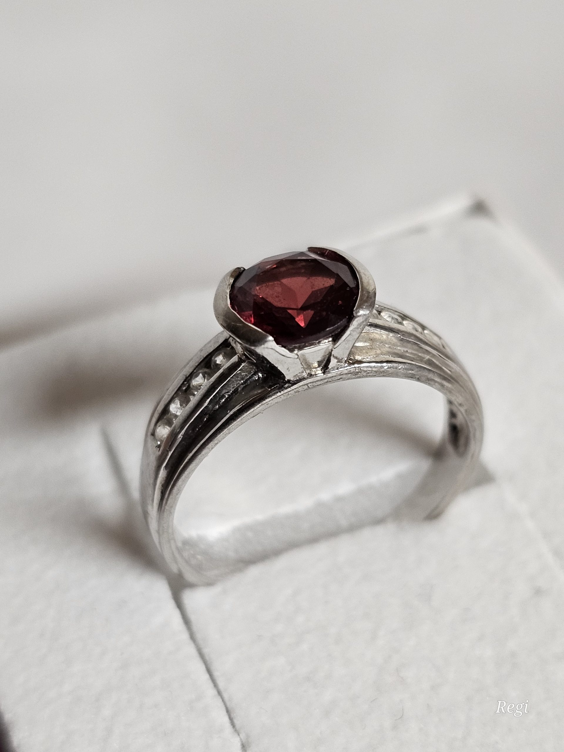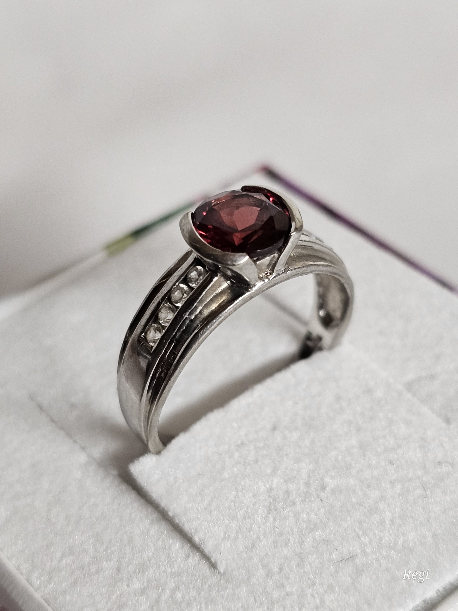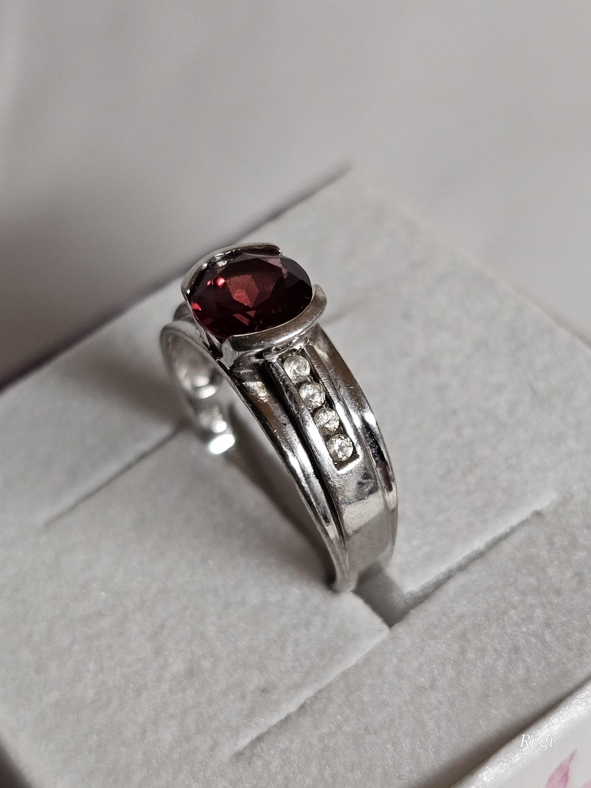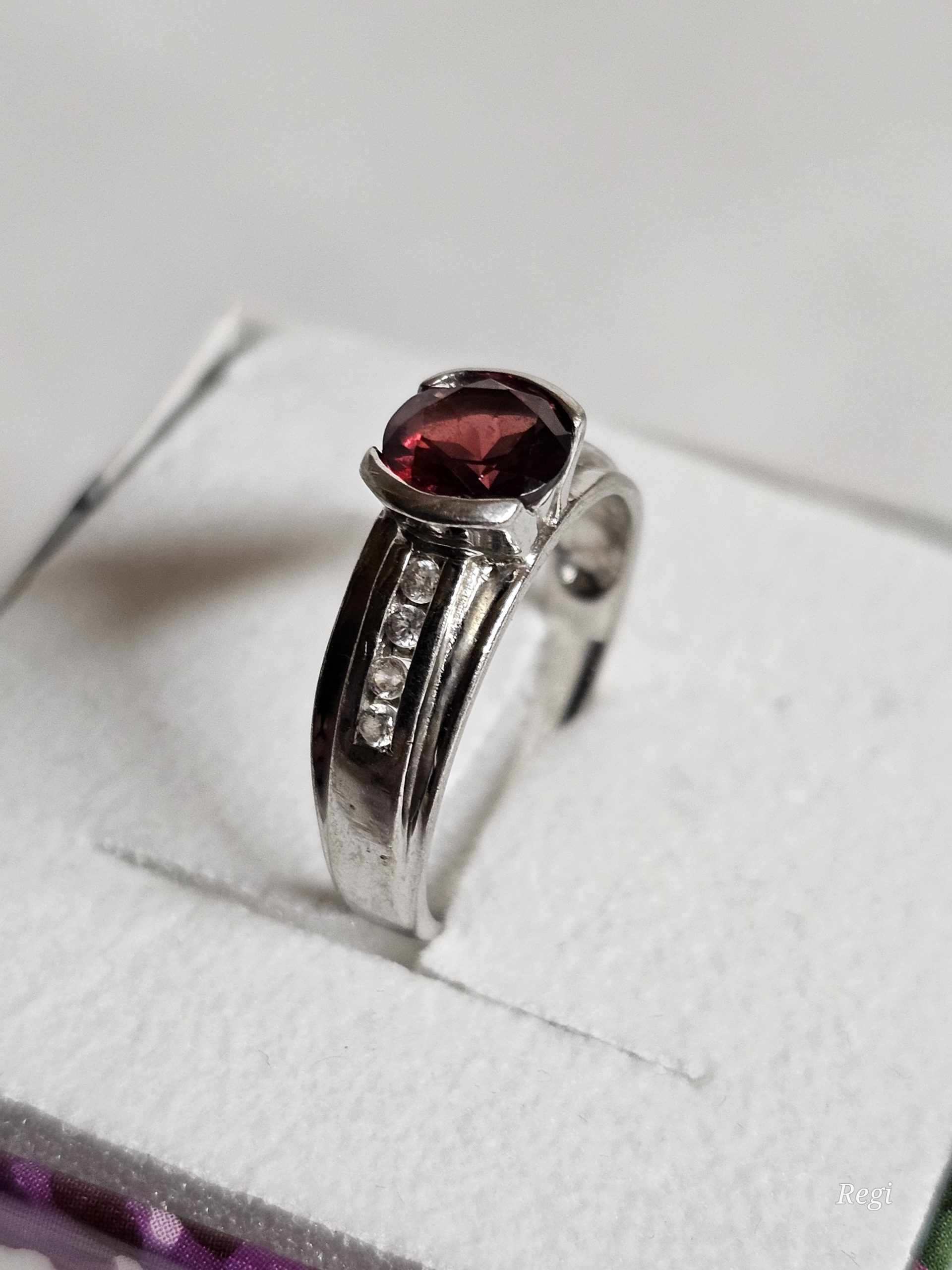 Schöner Ring mit einem roten Kristallstein mittig und links und rechts daneben sitzen je 4 Stck. kleine klare Kristallsteine.