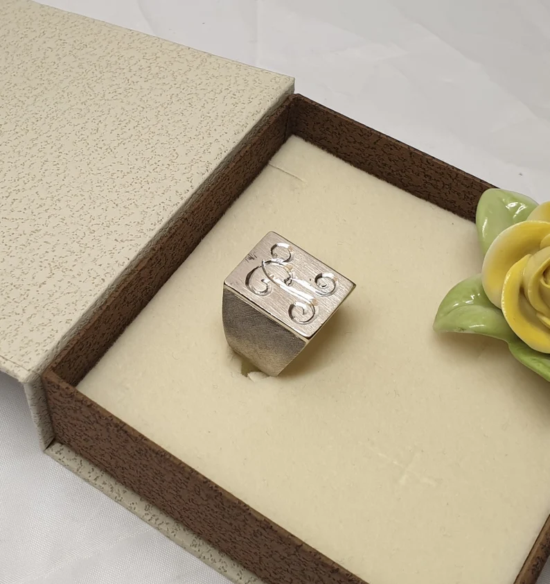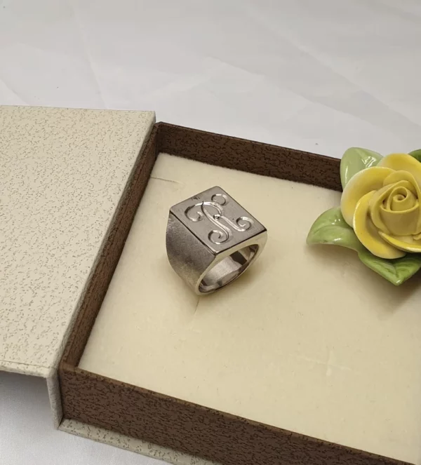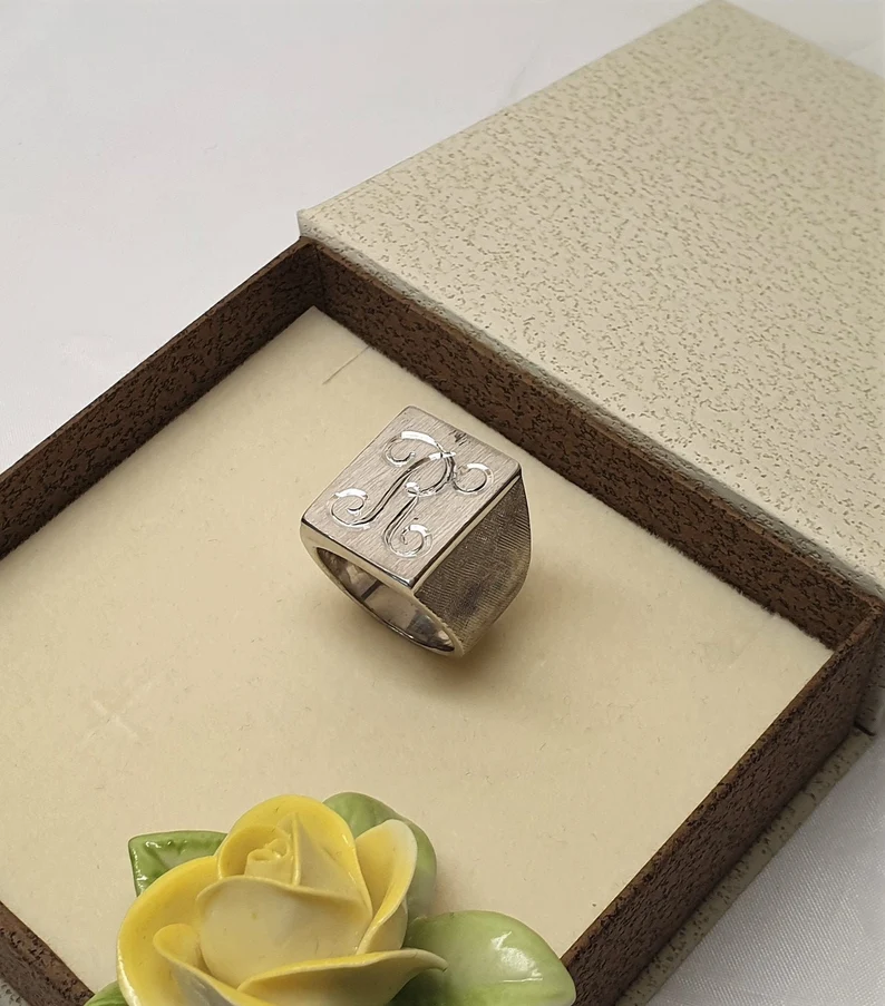 Eleganter Ring / Siegelring Silber 925 (geprüft) mit einem nostalgisch eingravierten Buchstaben „R“ auf der Siegelplatte.