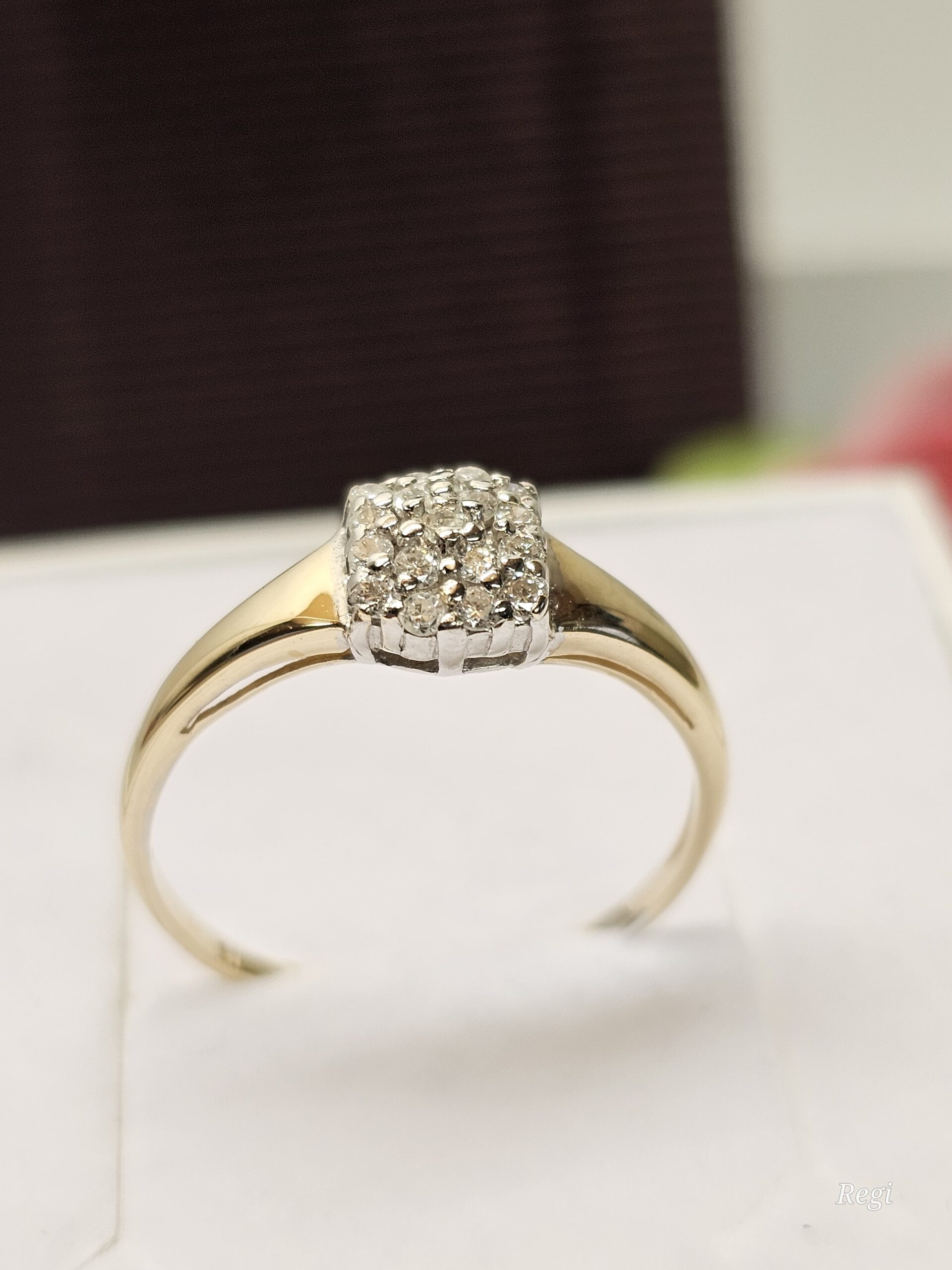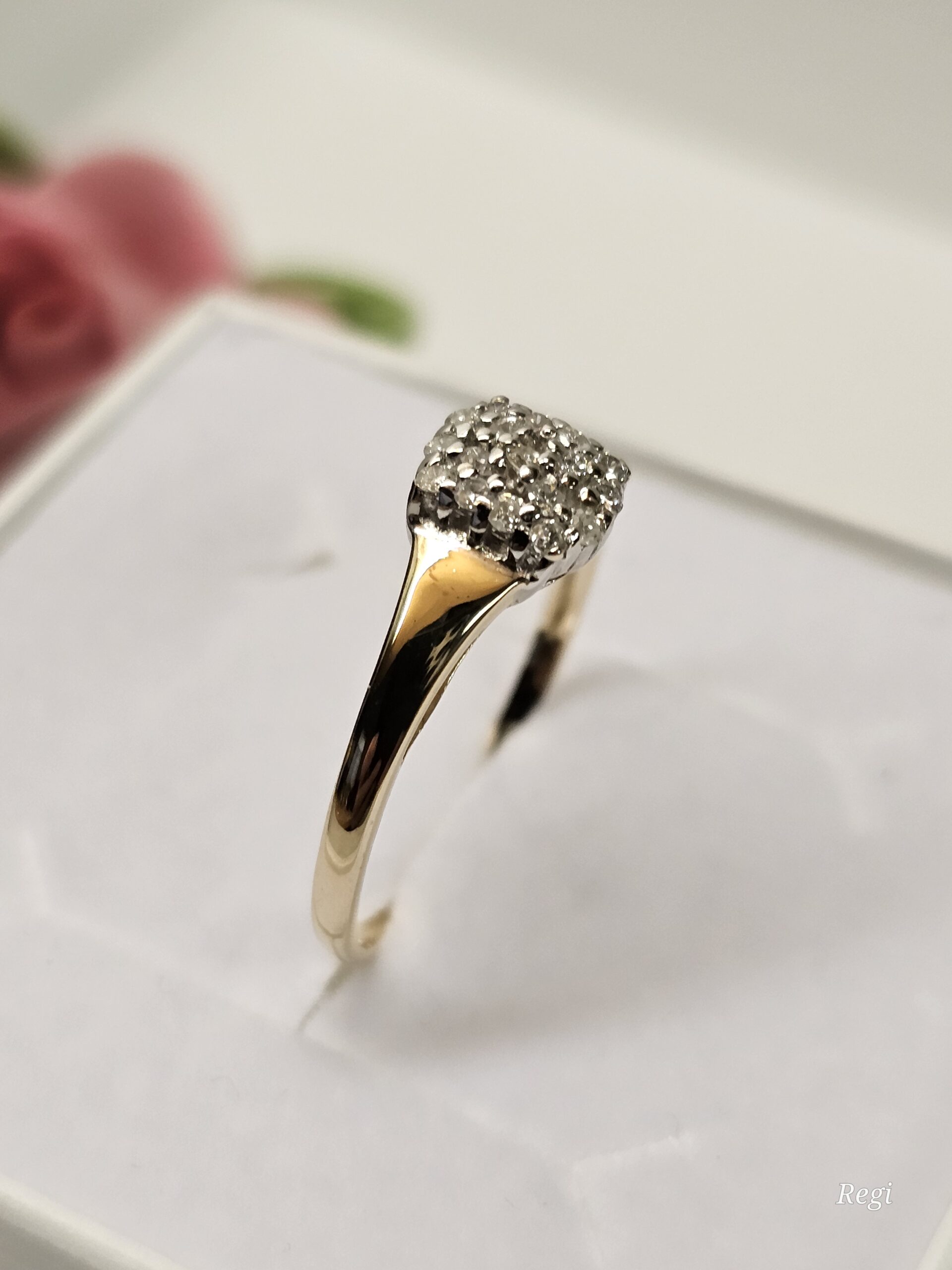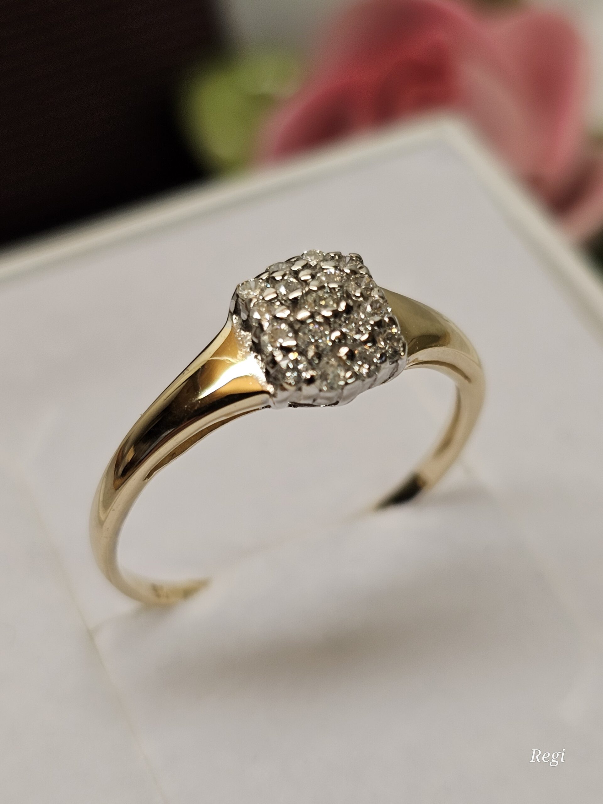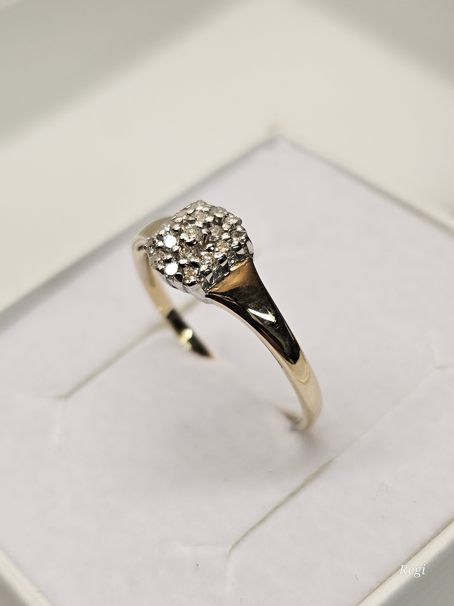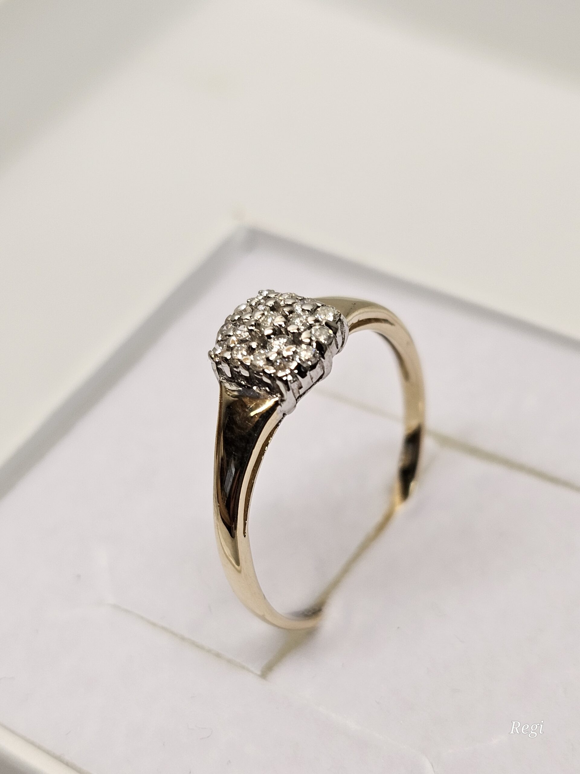 Wunderschöner feiner Ring aus Gold 585. Er ist am besonders schön gestalteten Ringkopf mit kleinen Diamantsteinchen verziert, die auf einem teilplatinierten Untergrund sitzen.