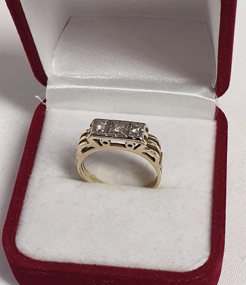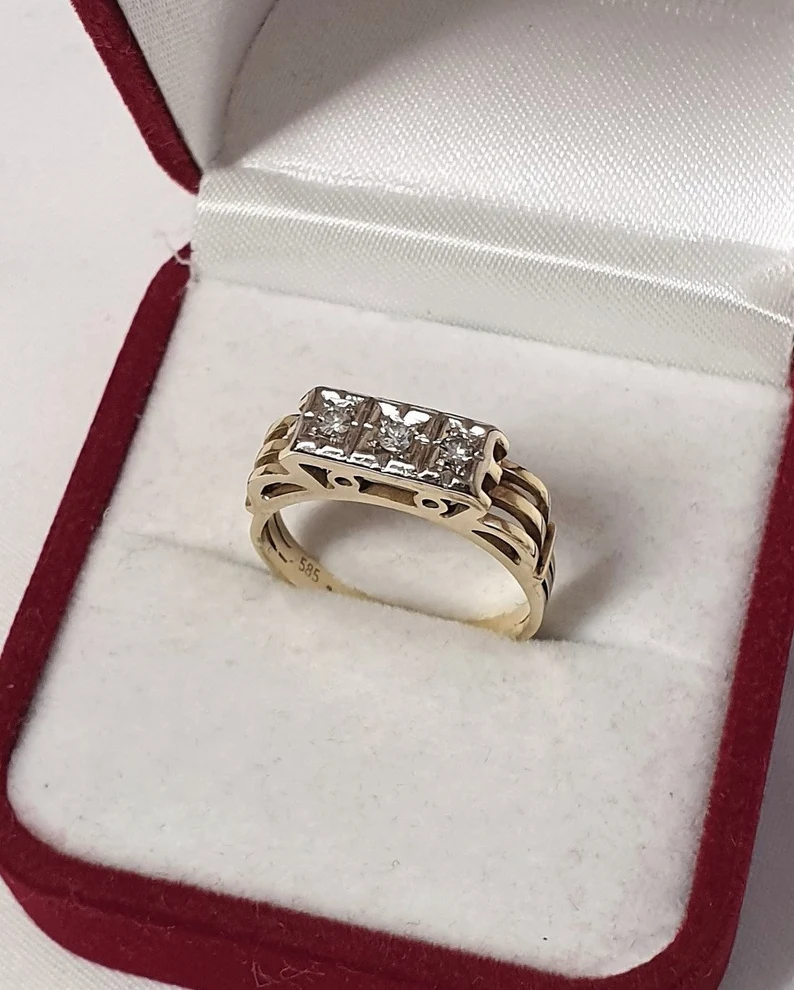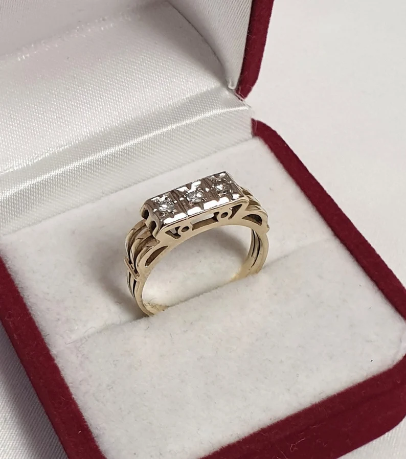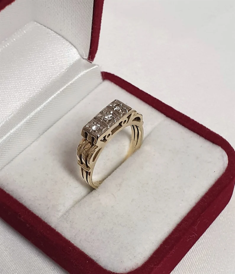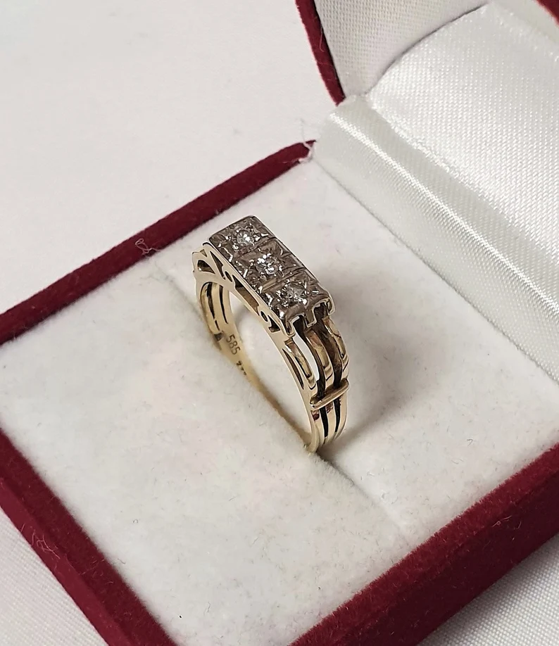Art Deco Ring aus Gold mit 3 Diamanten besetzt. Die Ringschiene wurde aus Gold 333 hergestellt und der Ringkopf ist Gold 585. Ein wunderschön gestalteter Ringkopf, edle Verarbeitung.