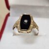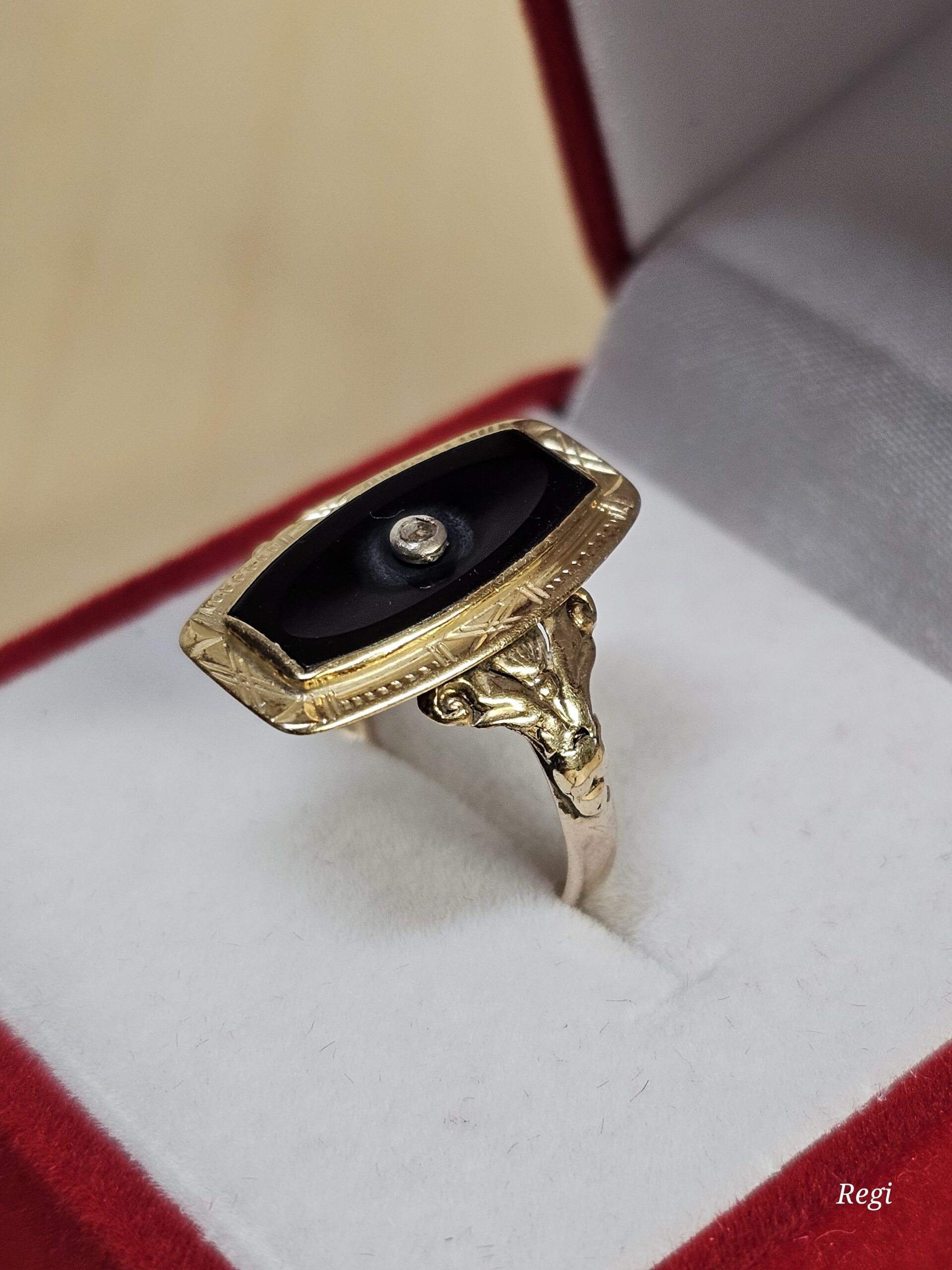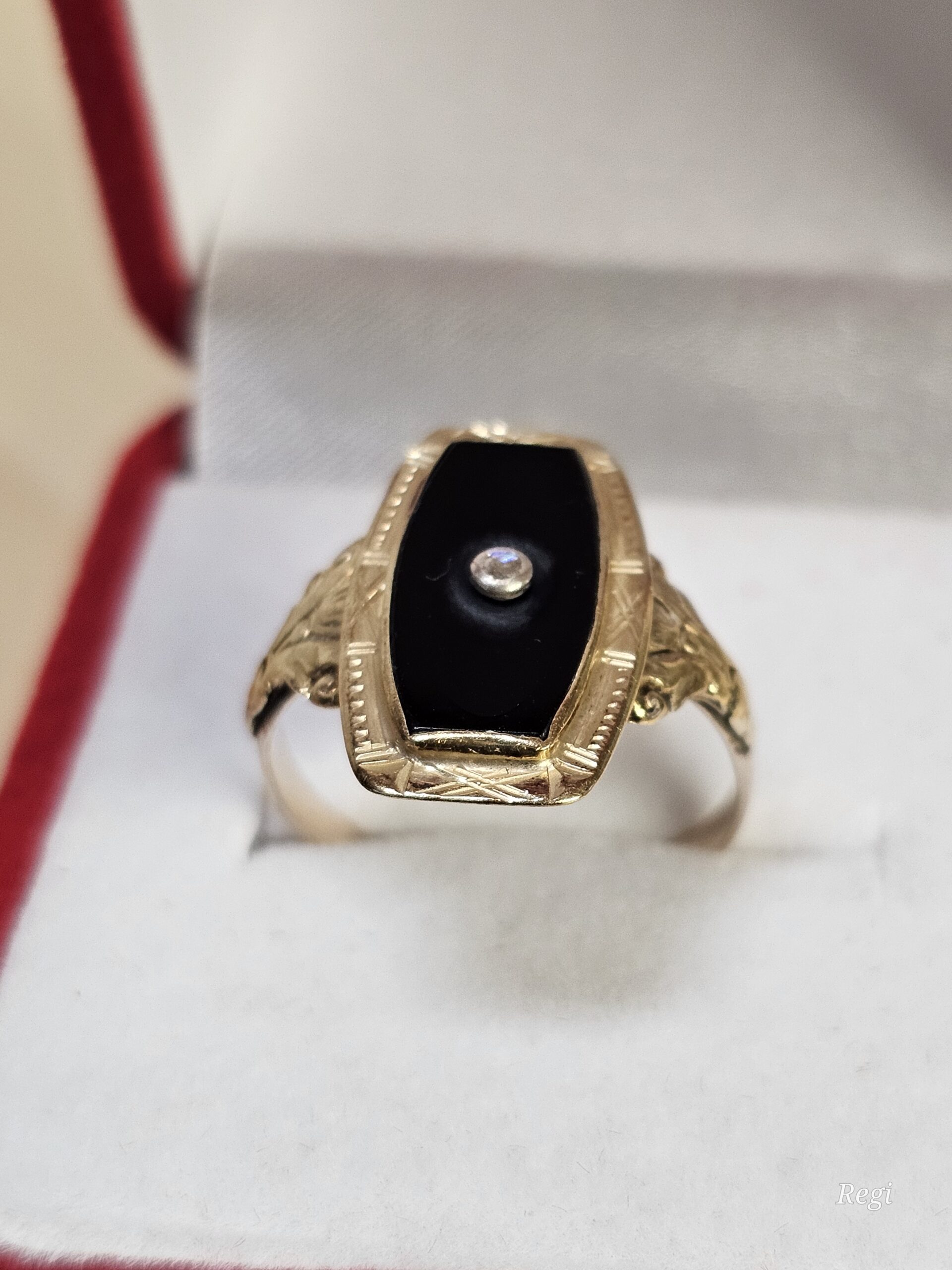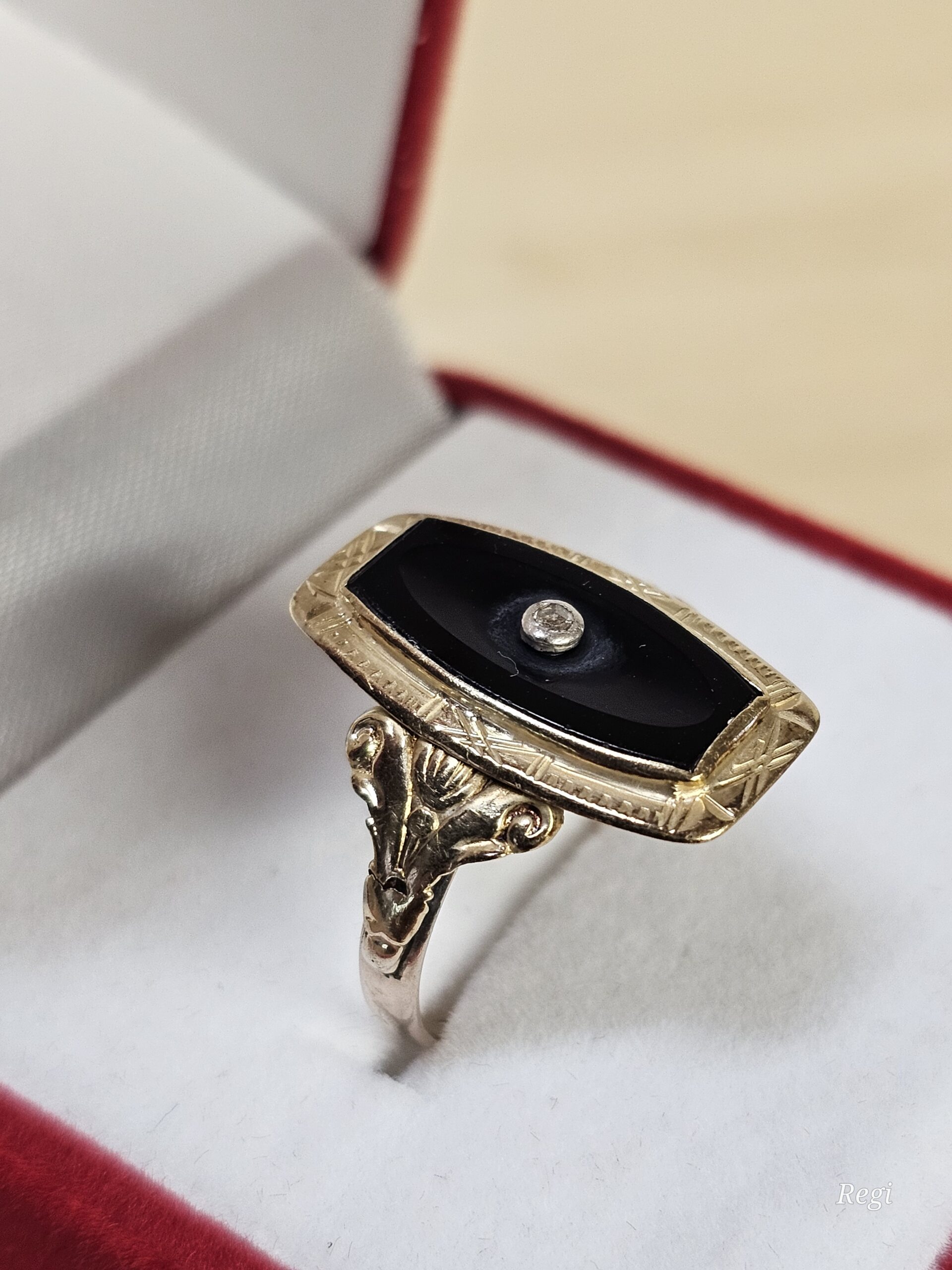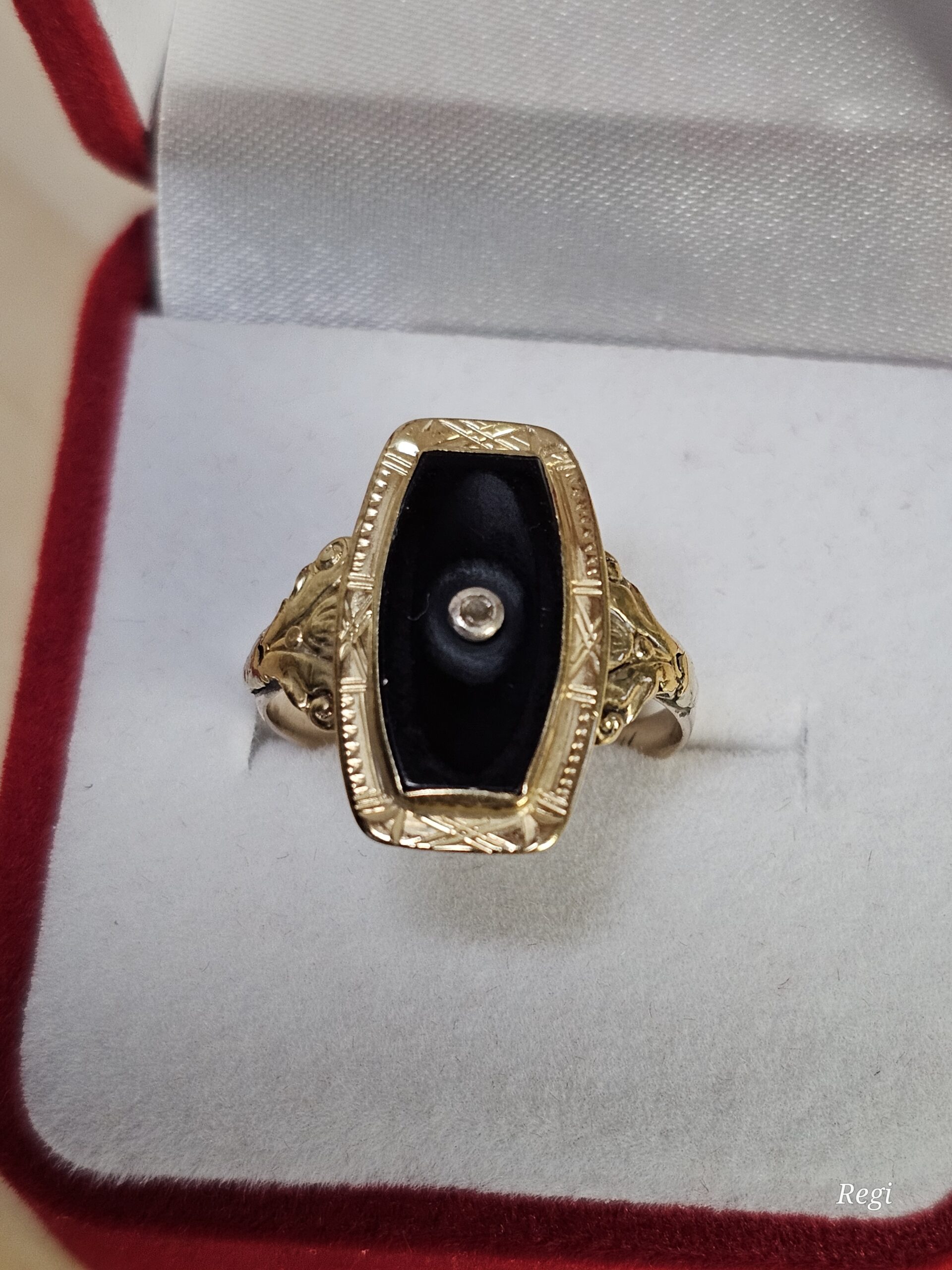 Eleganter Jugendstil Shabby Vintage Ring aus Gold 333 (geprüft, nicht gepunzt) mit einer schwarzen Onyx-Platte / Lagenstein. Besetzt ist die Ringplatte mit einem Diamantstein, der mit einem alten Schliff bearbeitet ist.