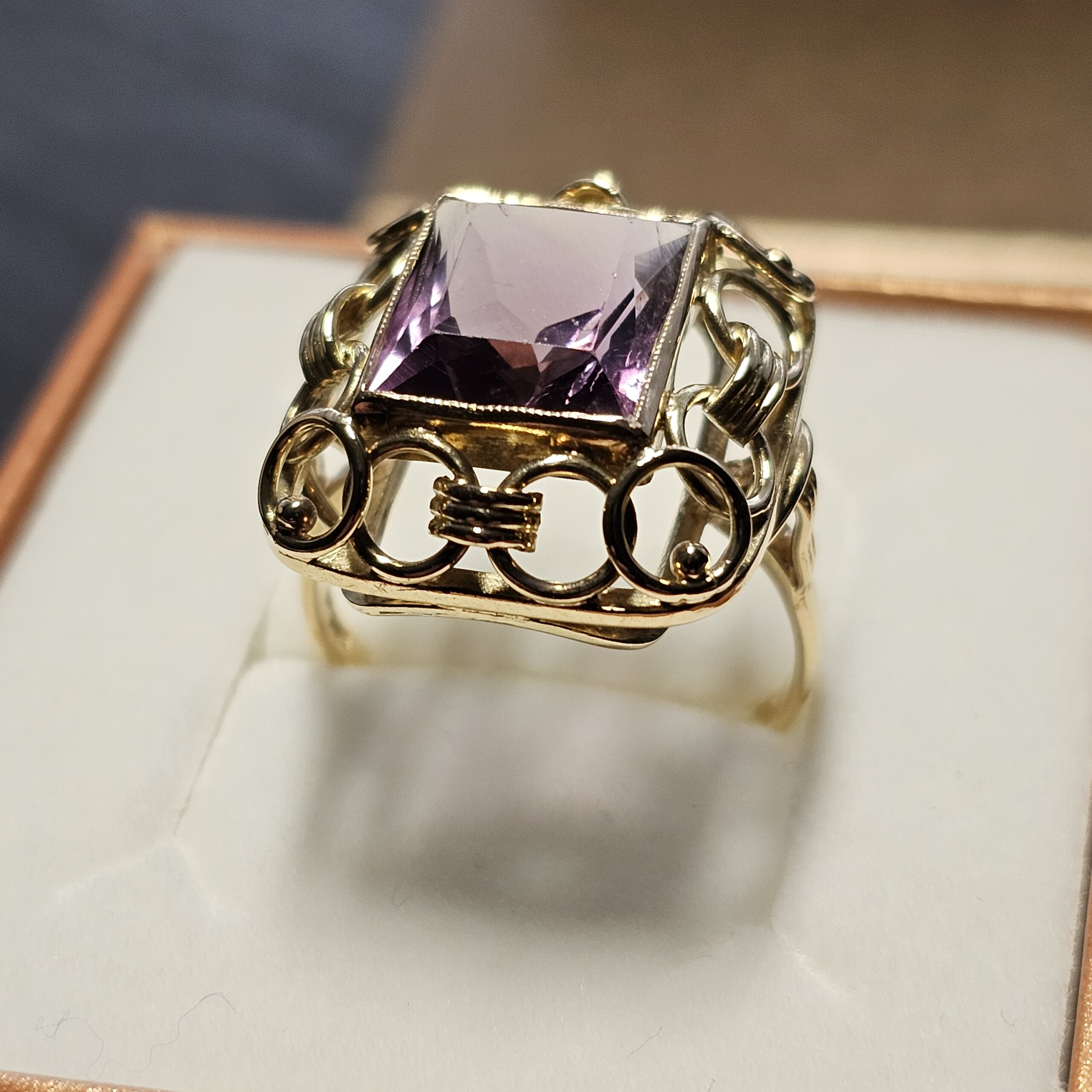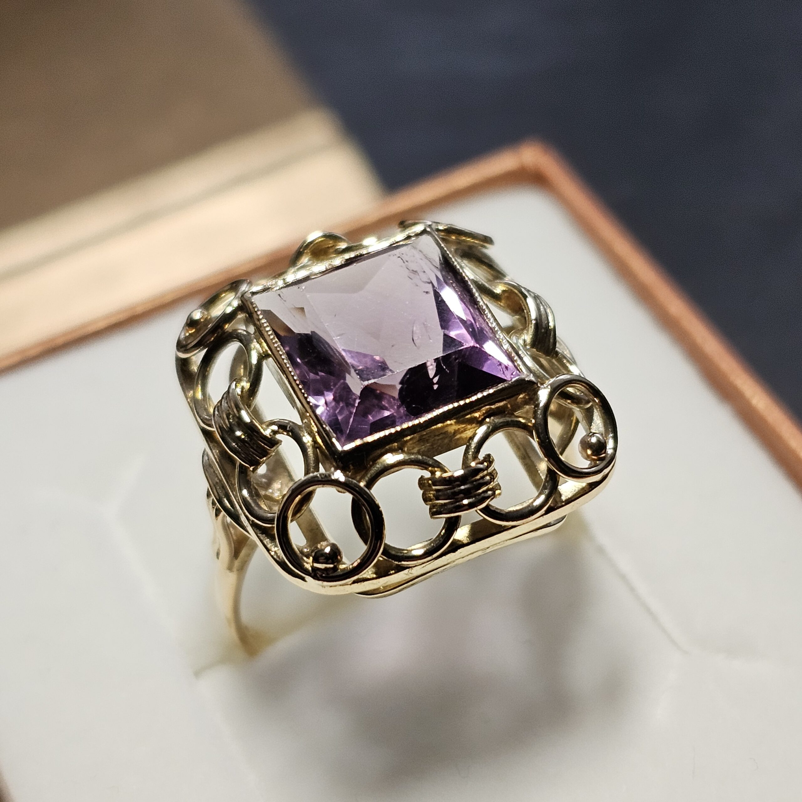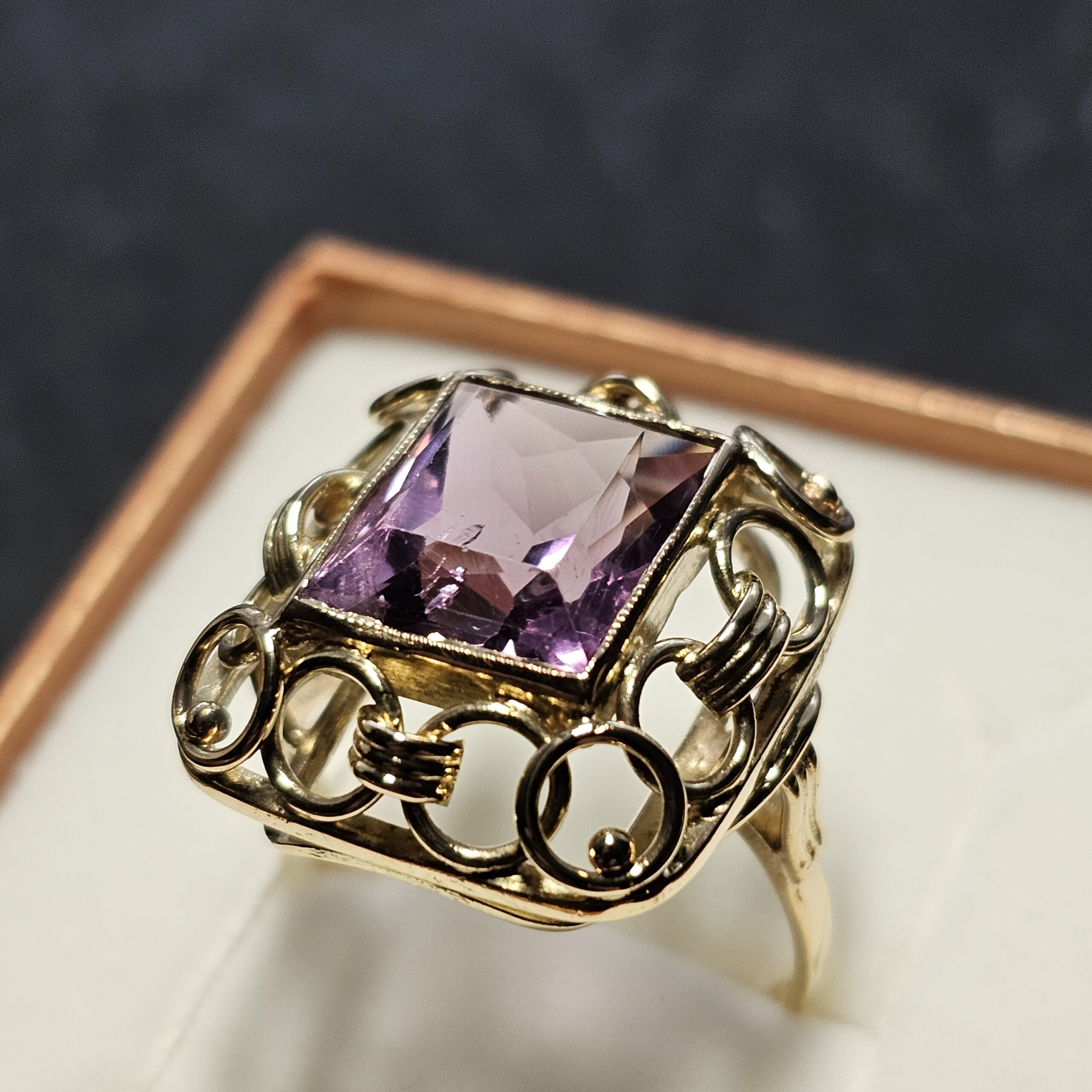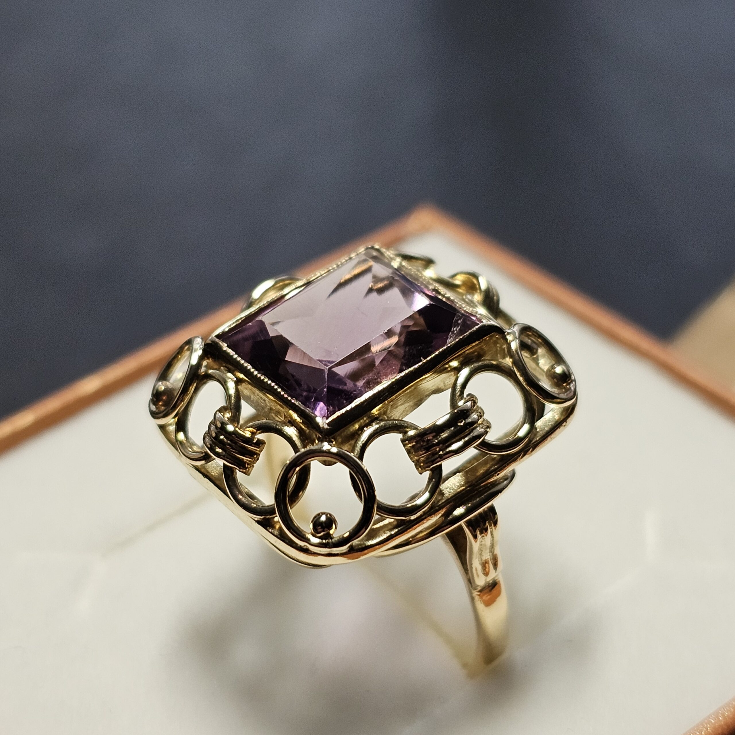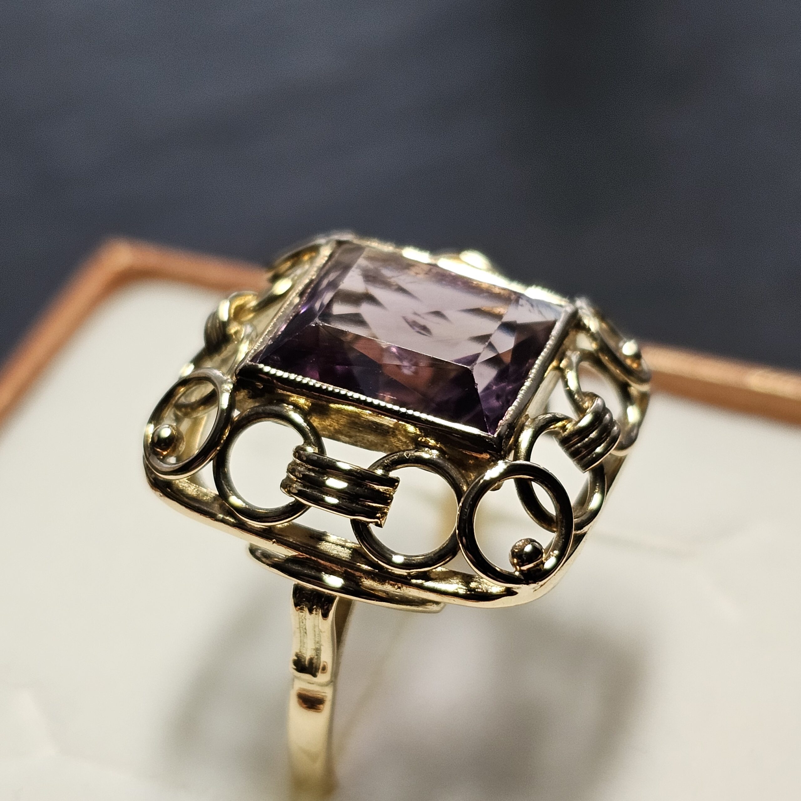 Nostalgischer Vintage Ring Goldring Gold 585 mit einem Amethyst. Der Ring verfügt über eine tolle Ringkopfgestaltung.