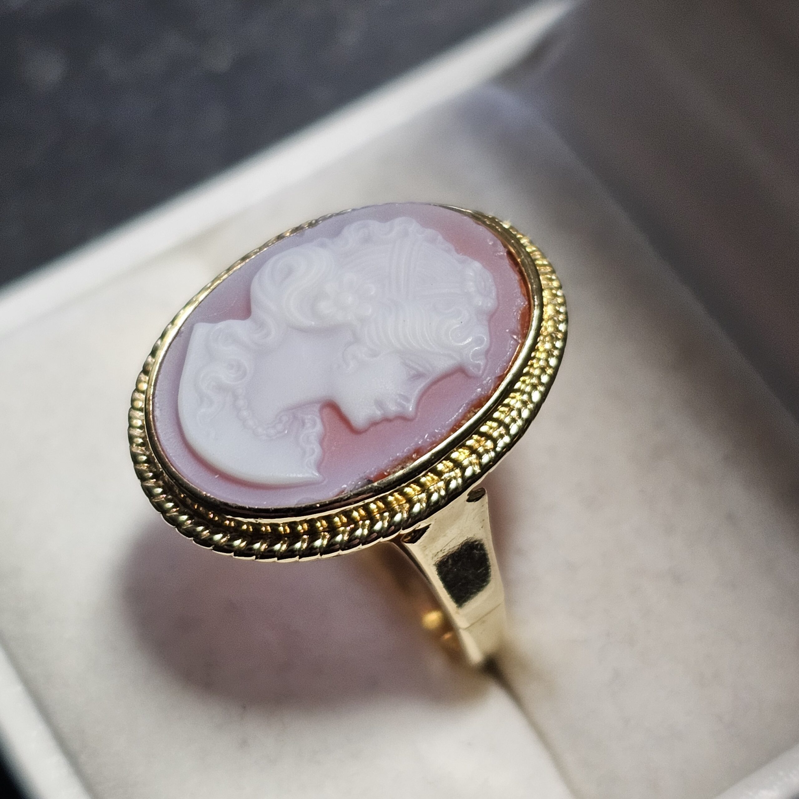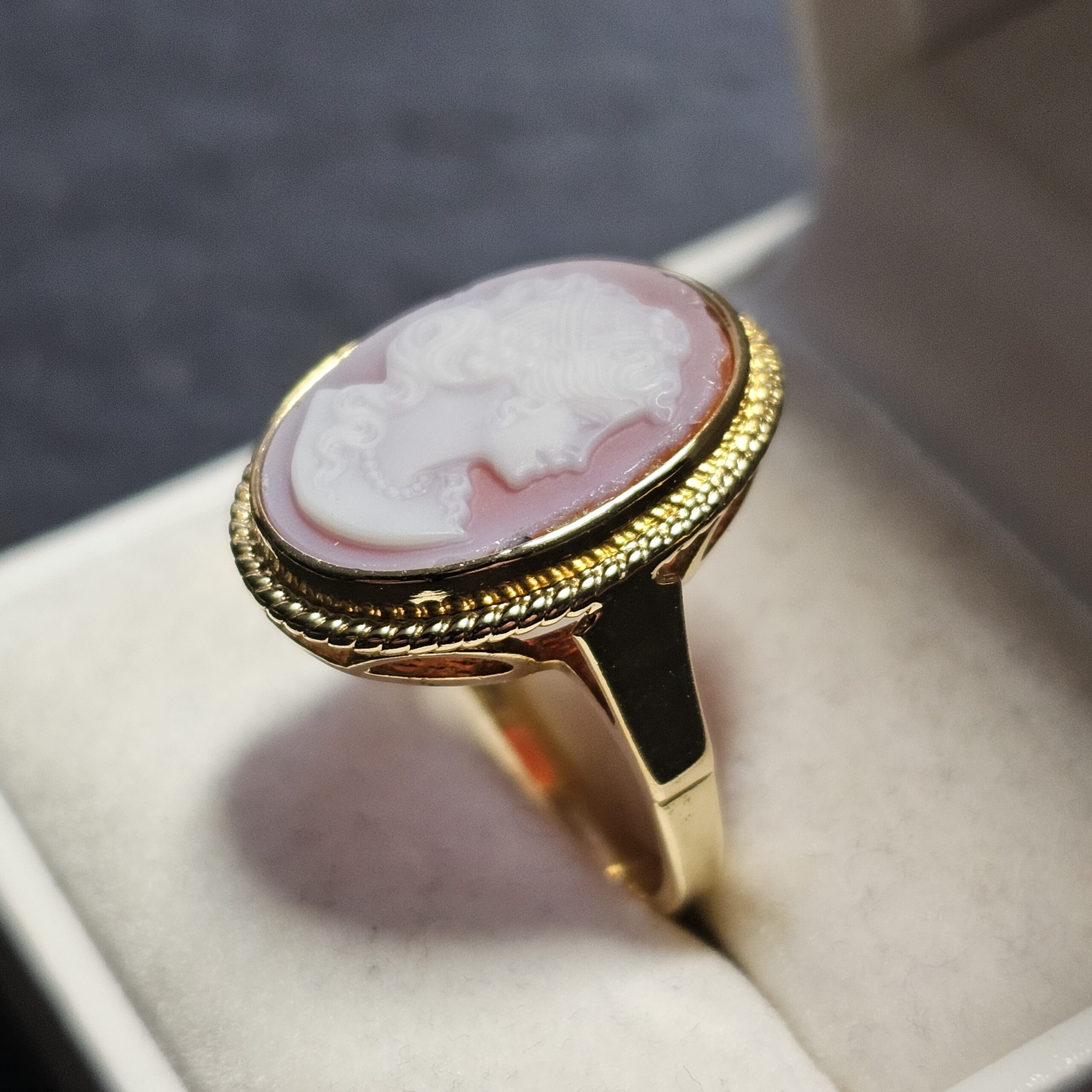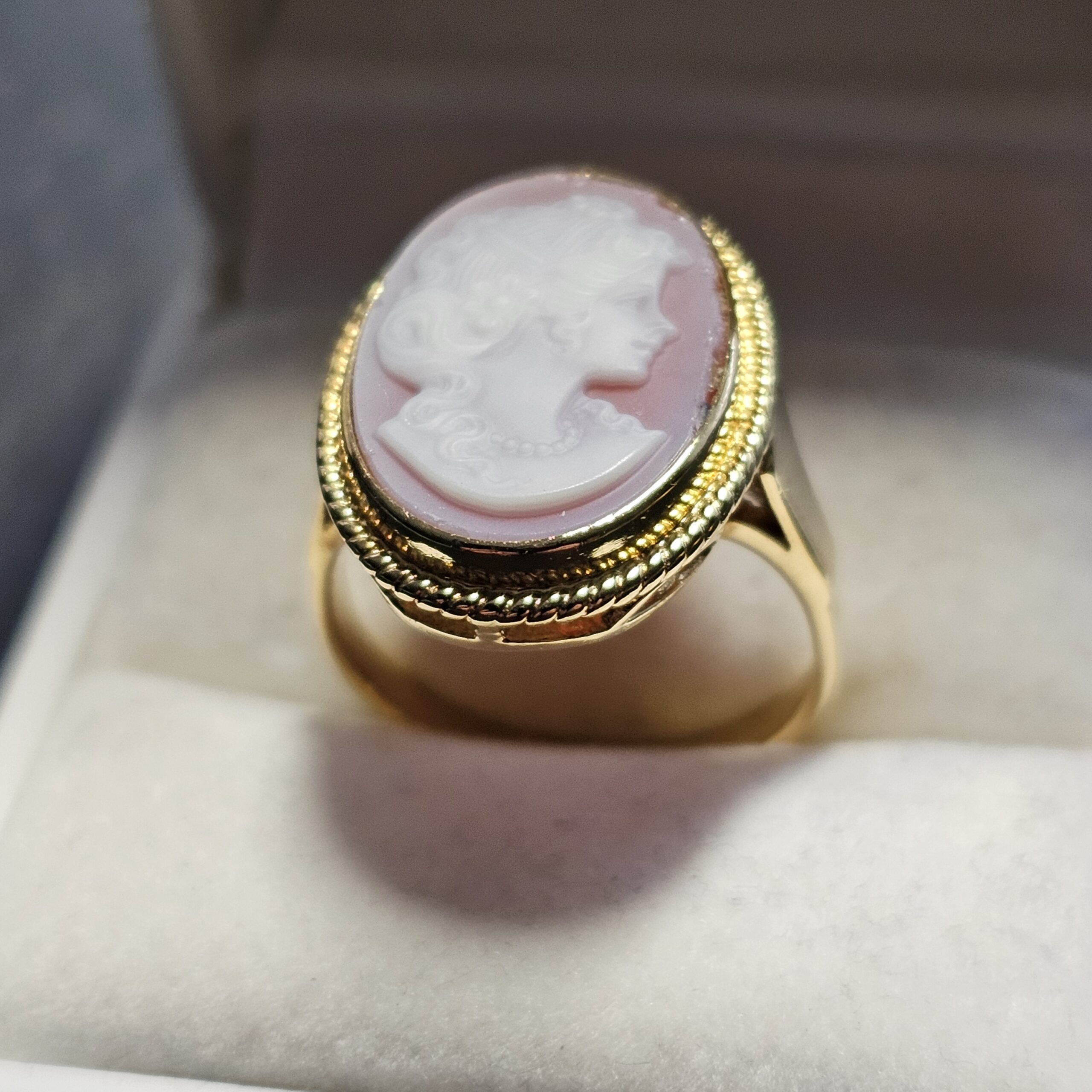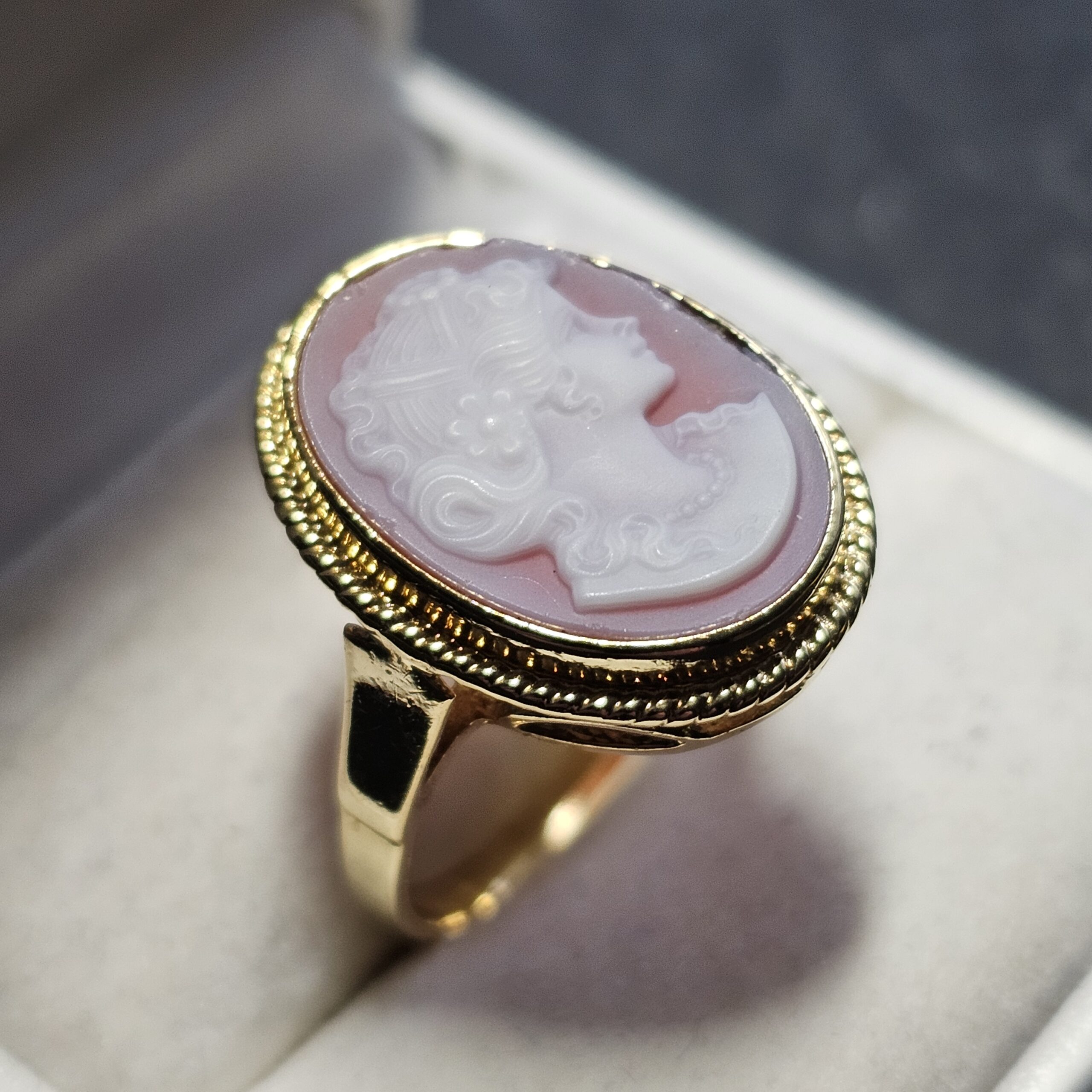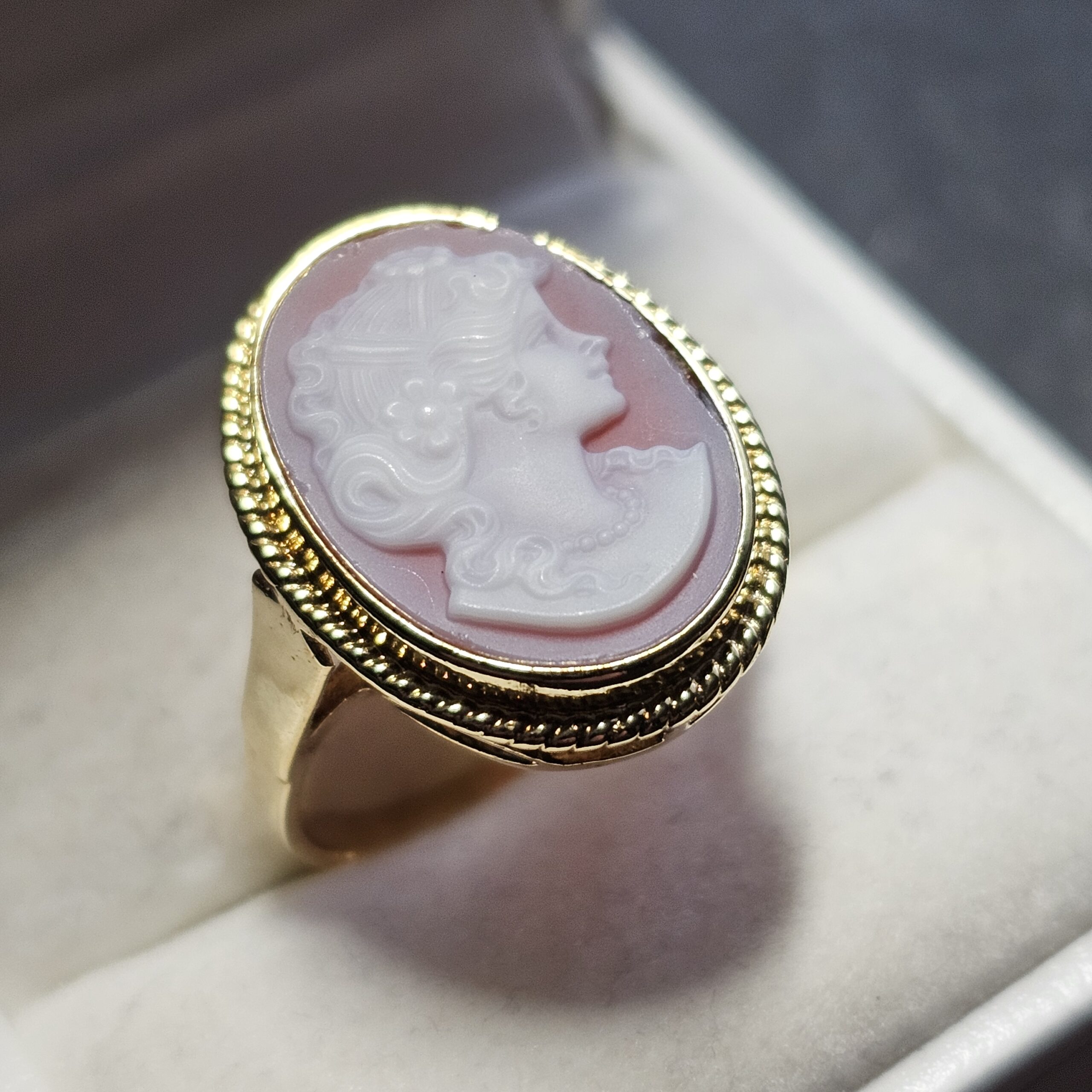 Nostalgischer Shabby Vintage Goldring 585 mit einer Frauenkopf Muschel Kamee / Gemme.