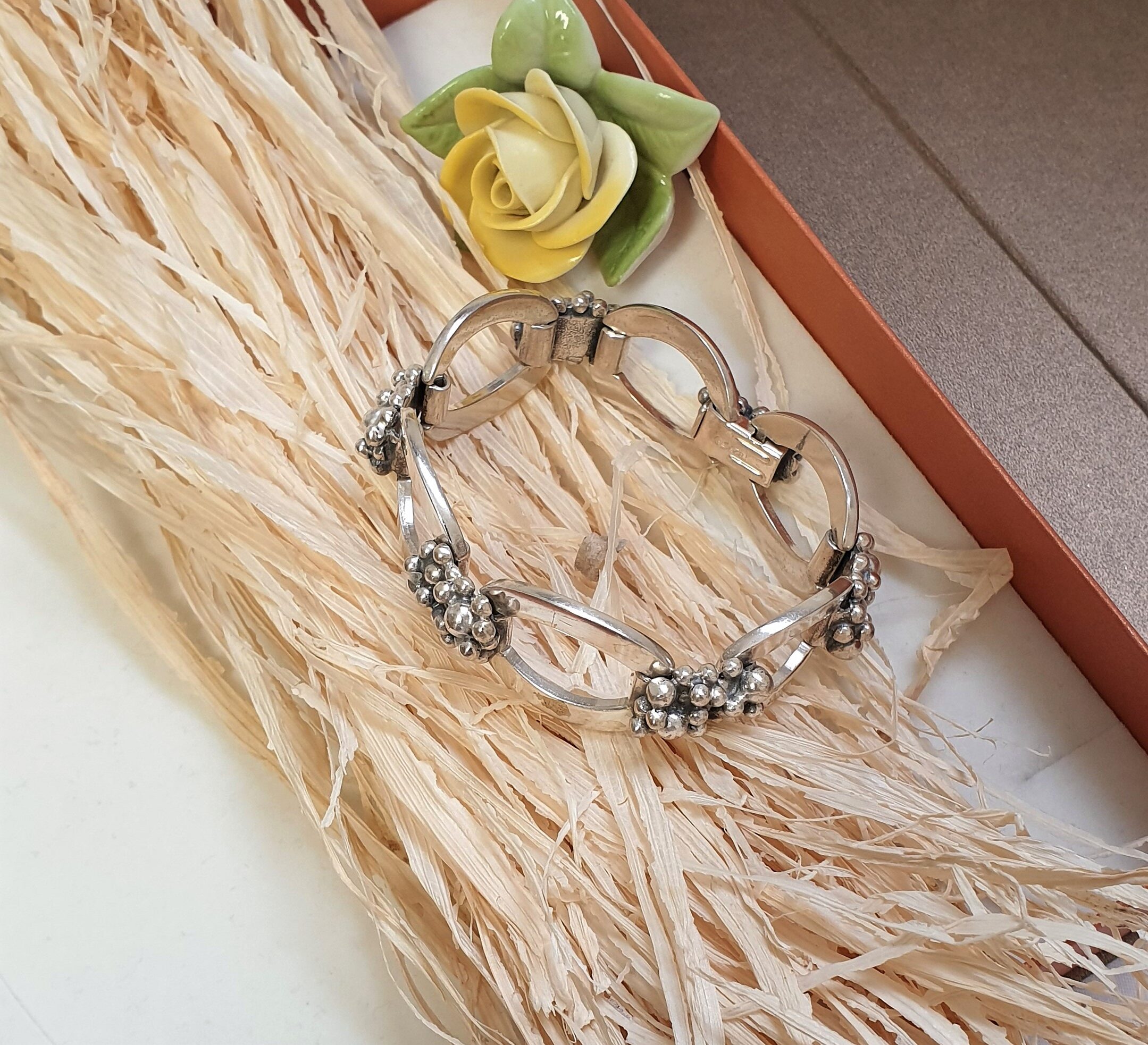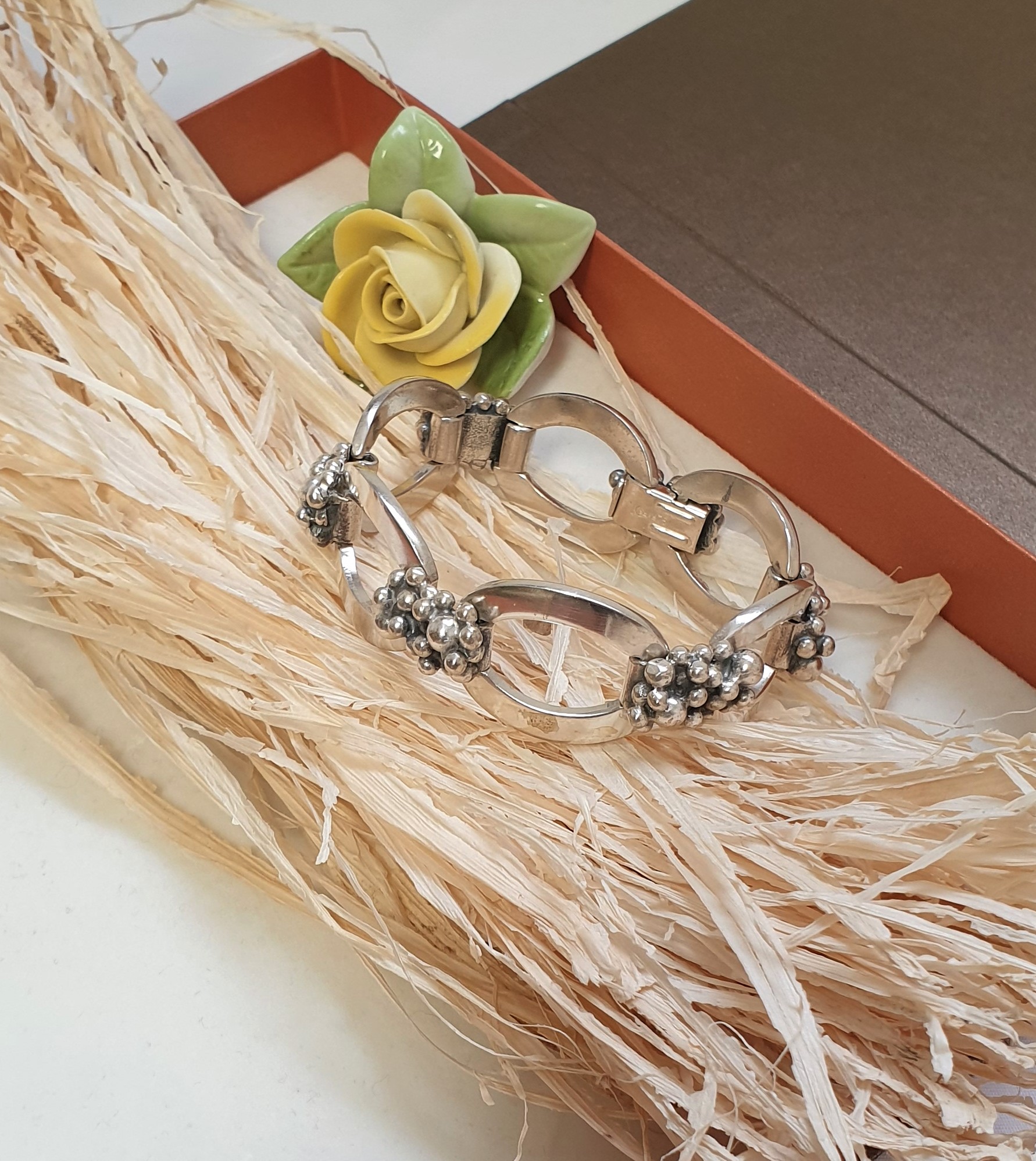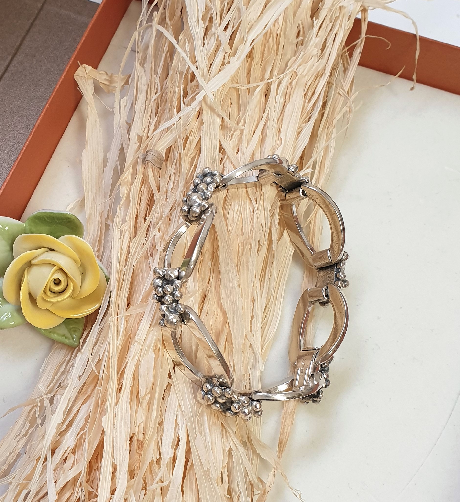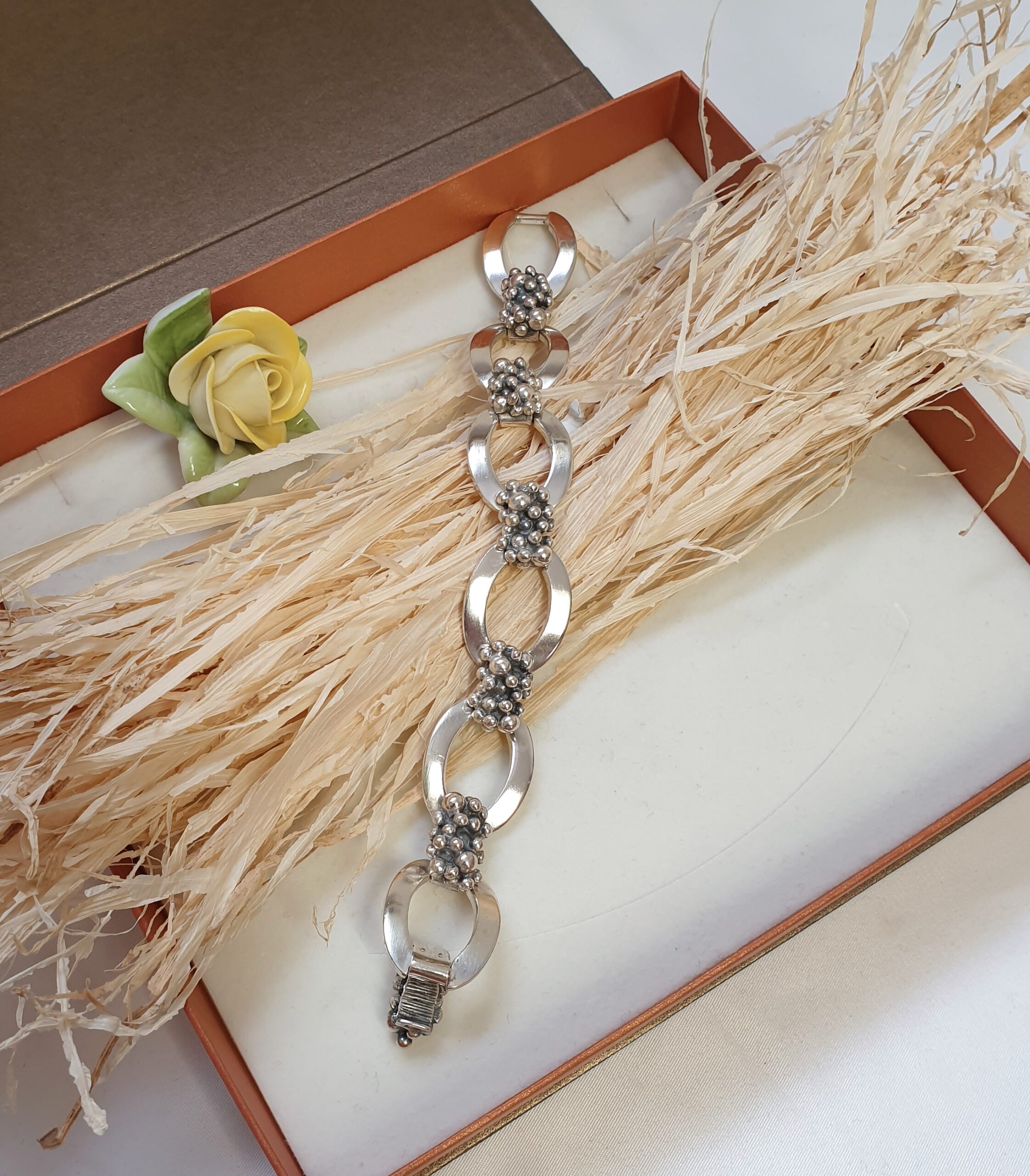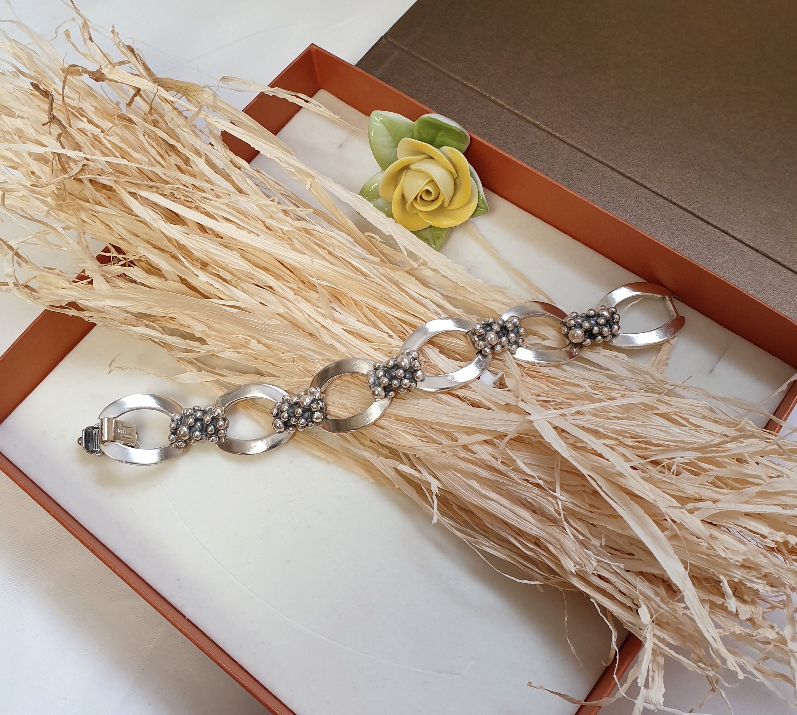 Schönes, massives Gliederarmband mit großen Gliedern aus Silber 925 gefertigt. Die Zwischenelemente sind in einem sehr schönen Design gestaltet. Vintage Eleganz!