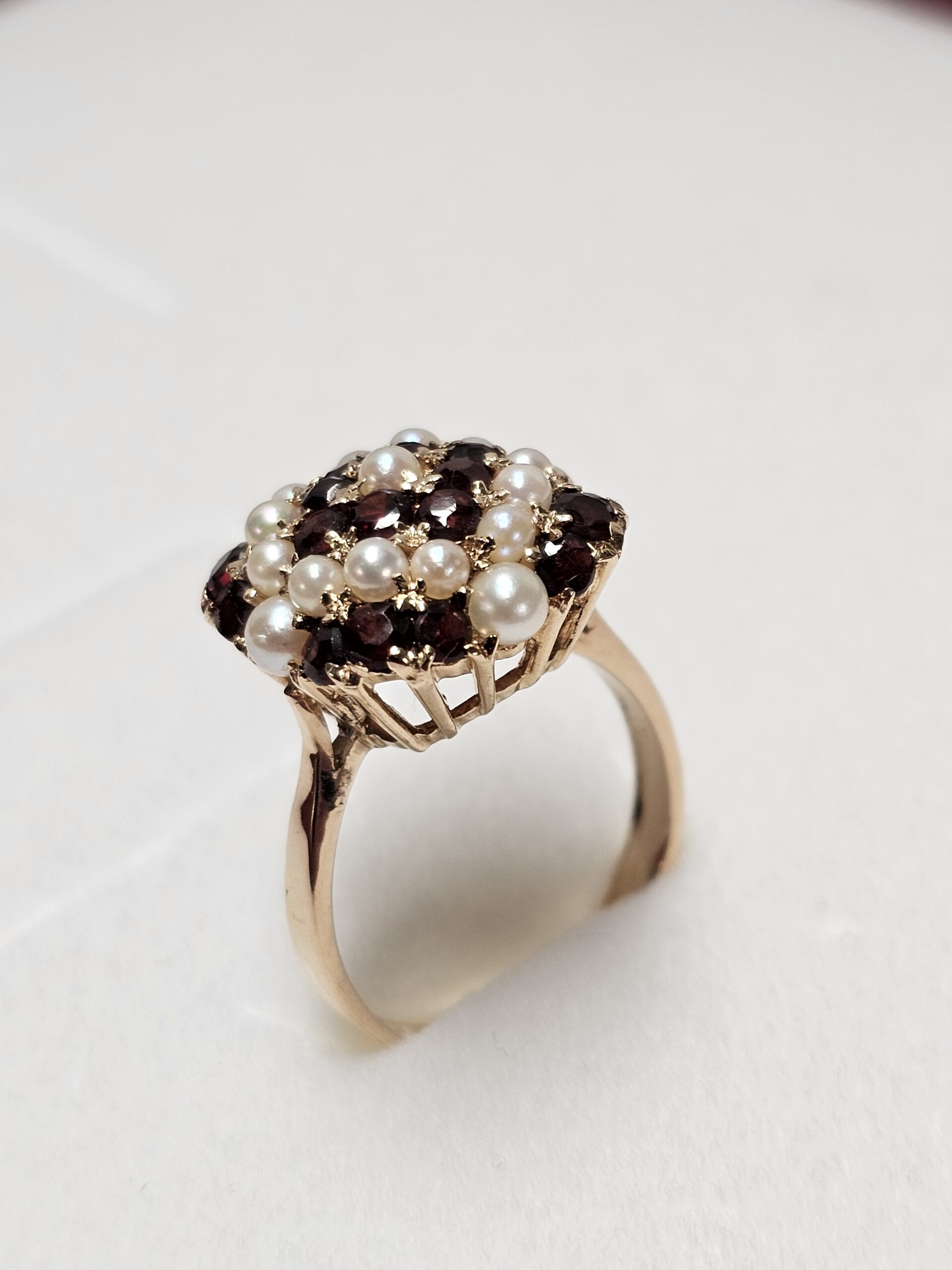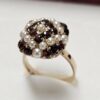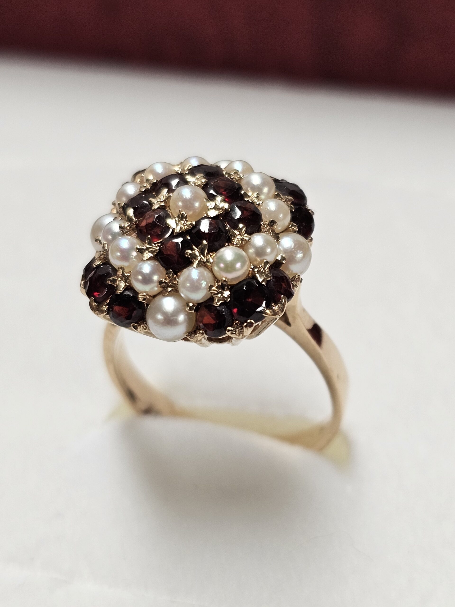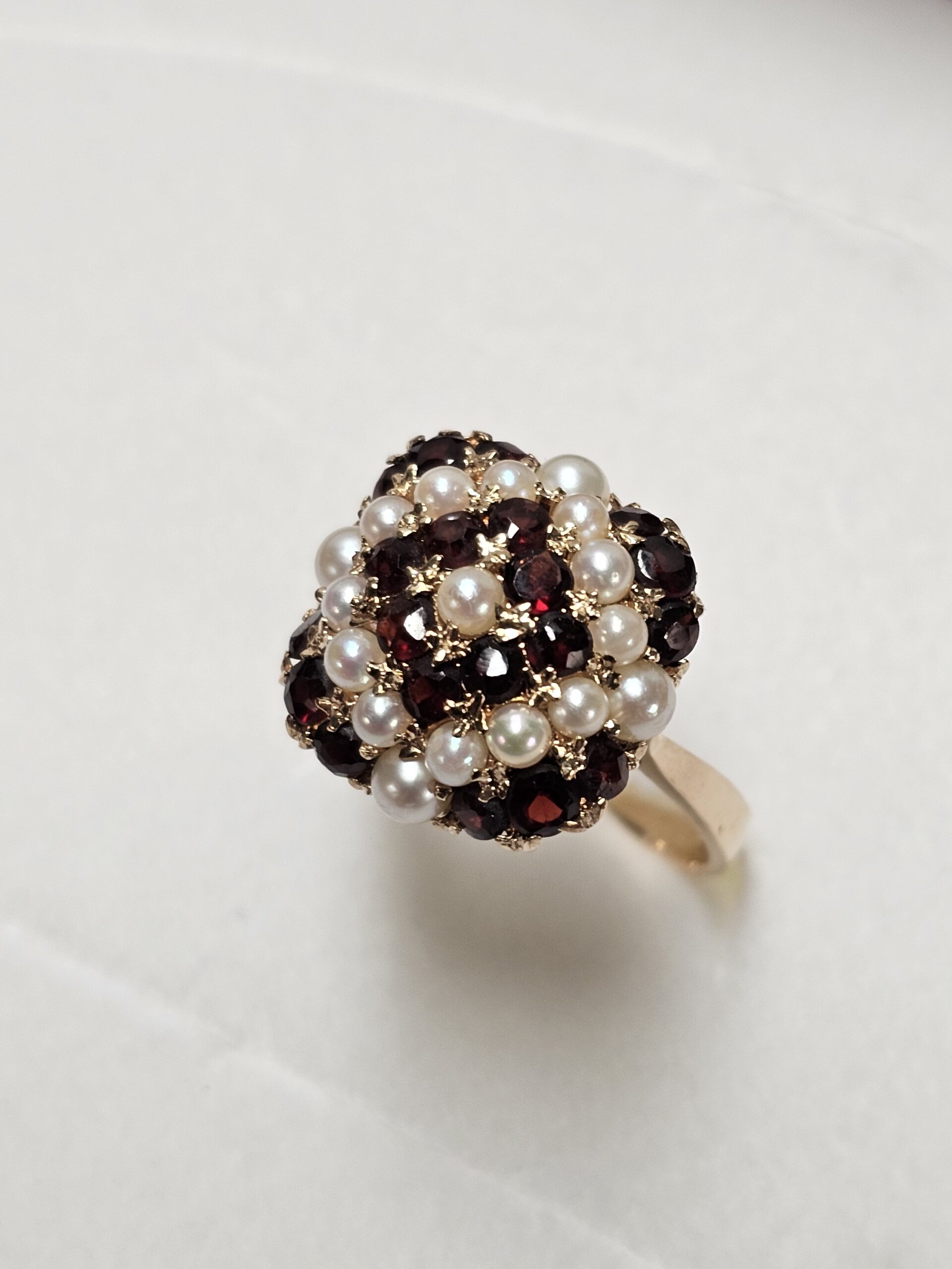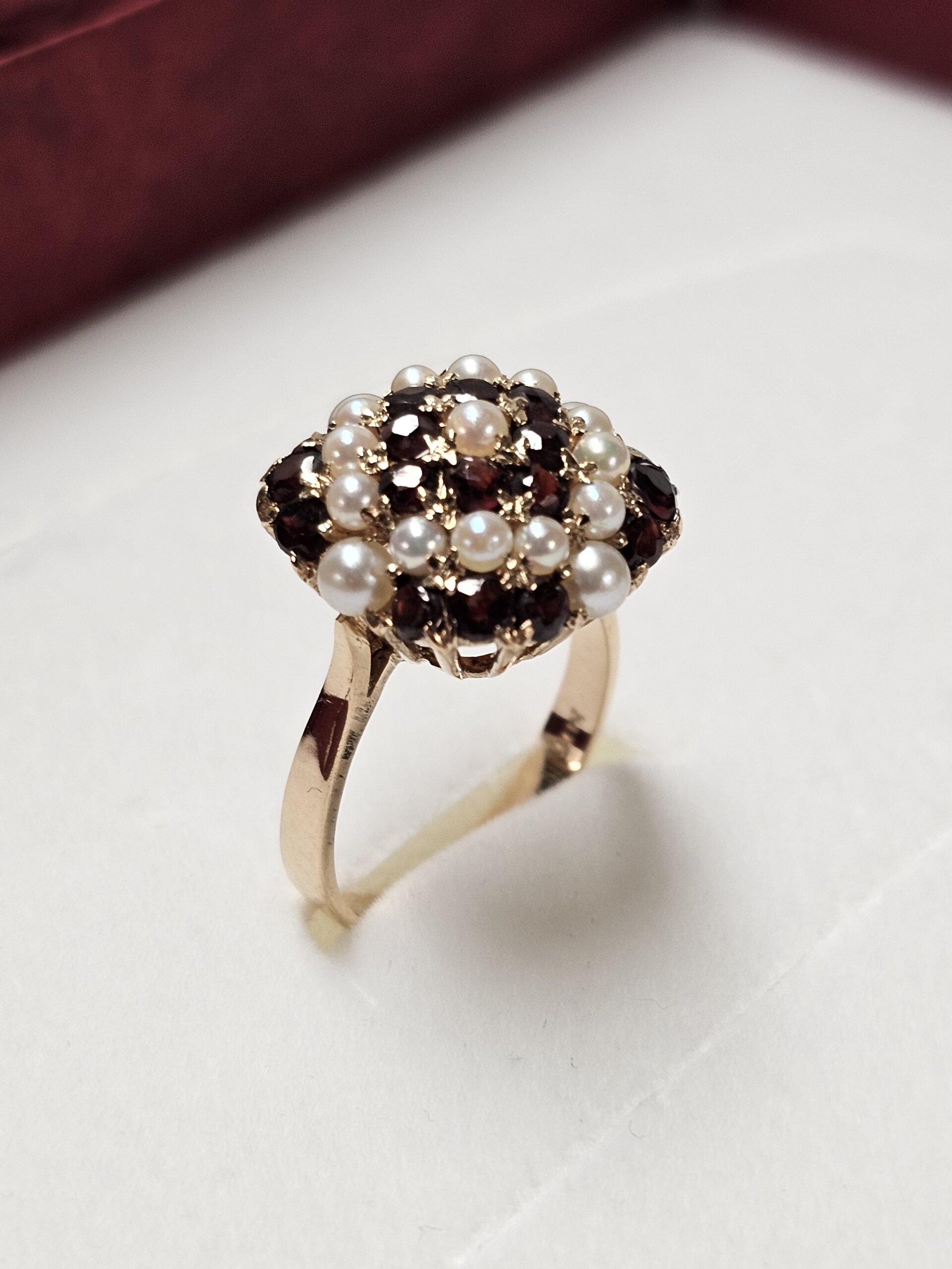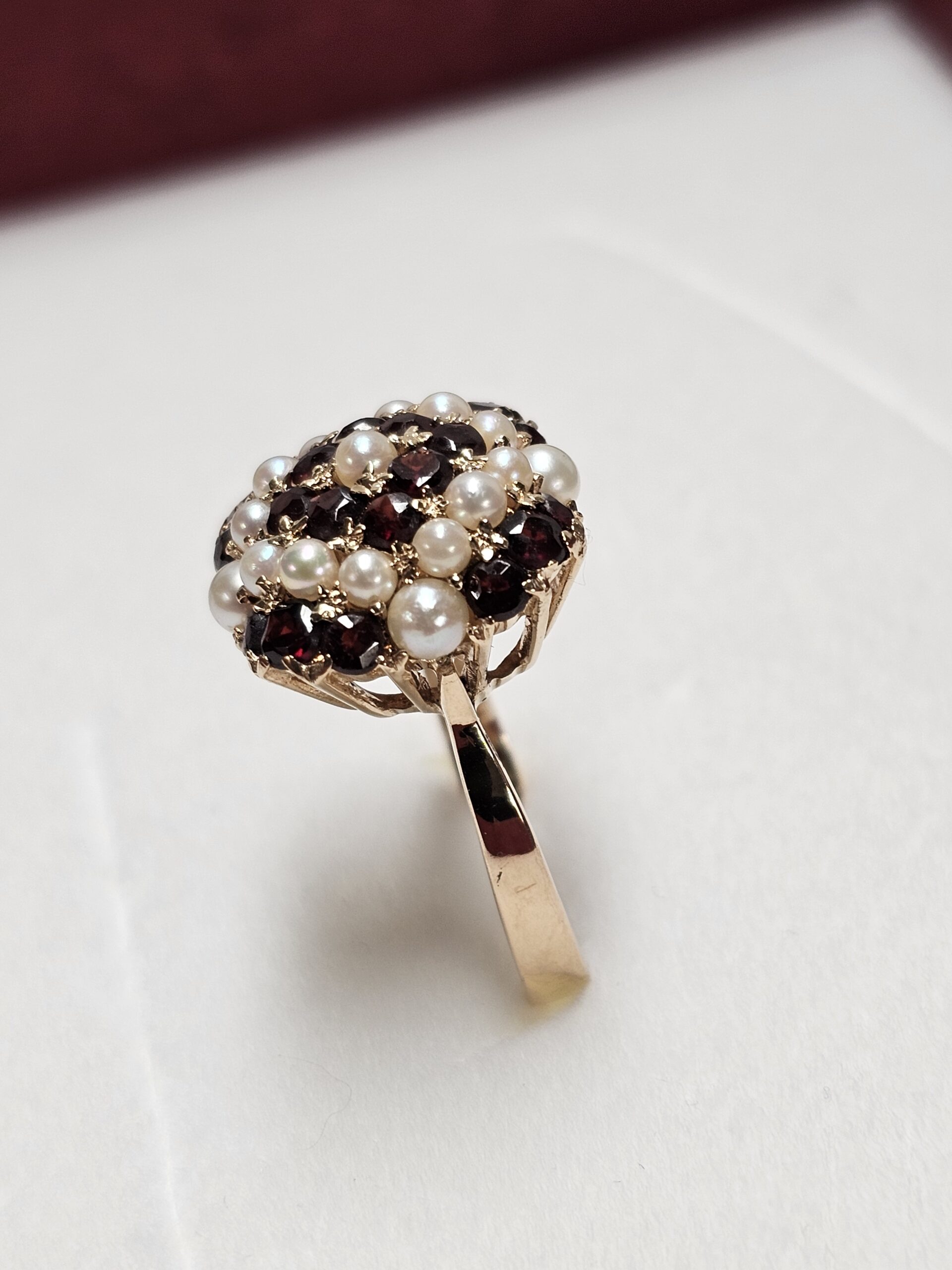 Wunderschöner Vintage-Ring Gold 585 mit kleinen weißen Perlen und Granat-Steinchen besetzt.