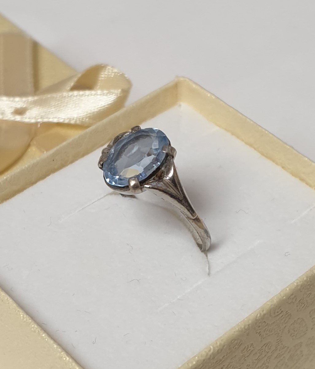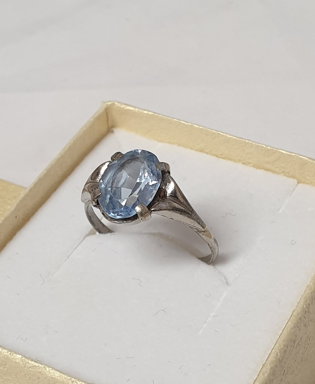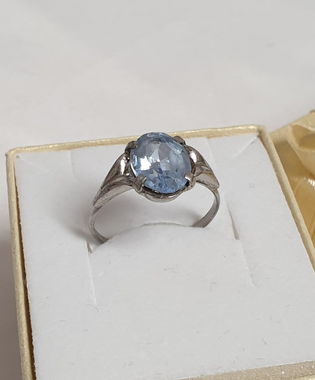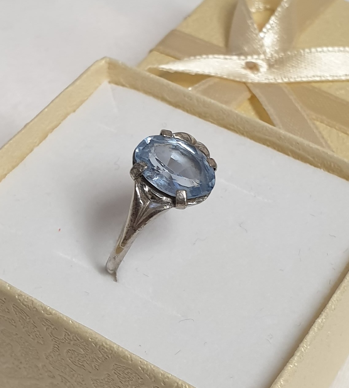 Ein bezaubernd schöner feiner Shabby Vintage Ring. Silberring 835 (geprüft) besetzt mit einem blauen Kristallstein und einer kunstvoll schönen Ringkopfgestaltung.